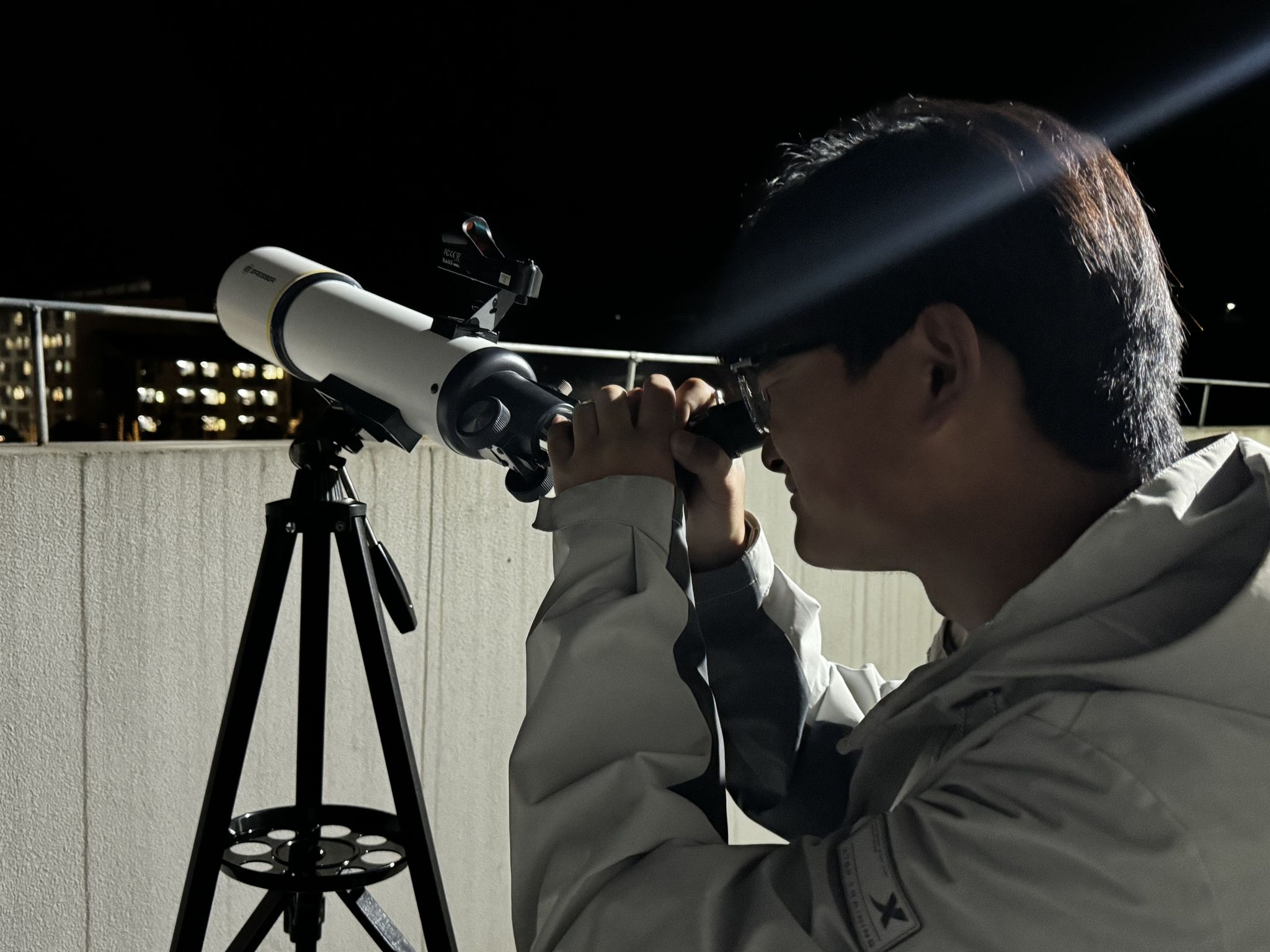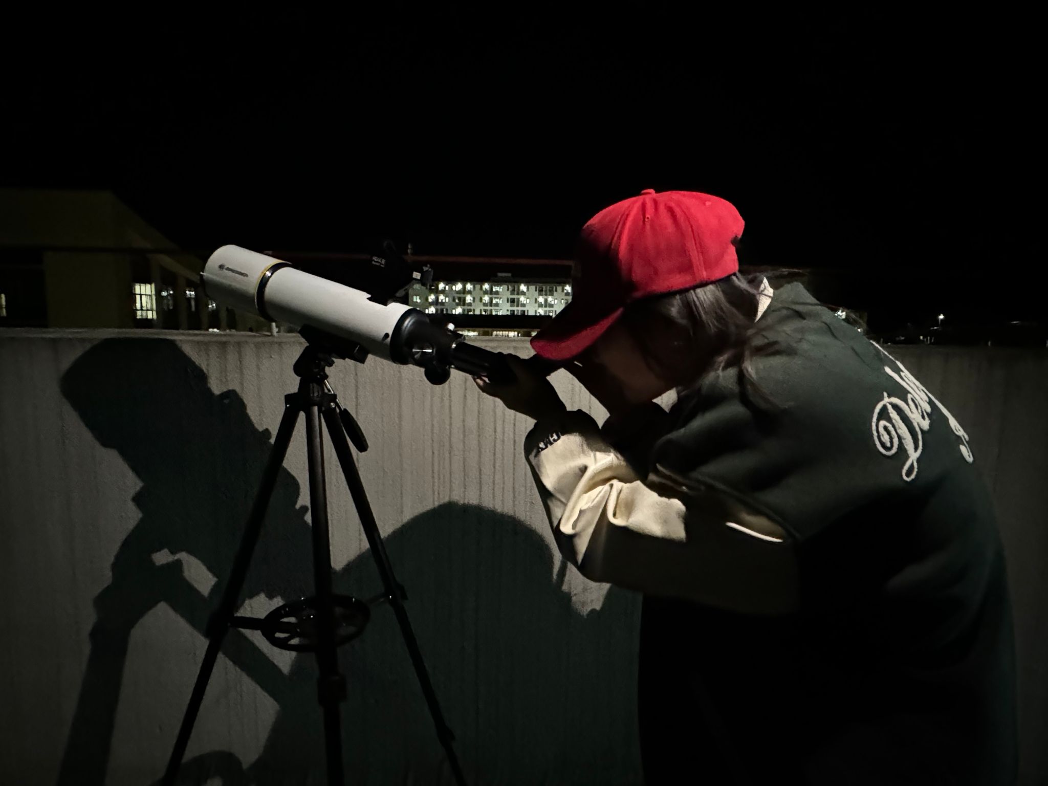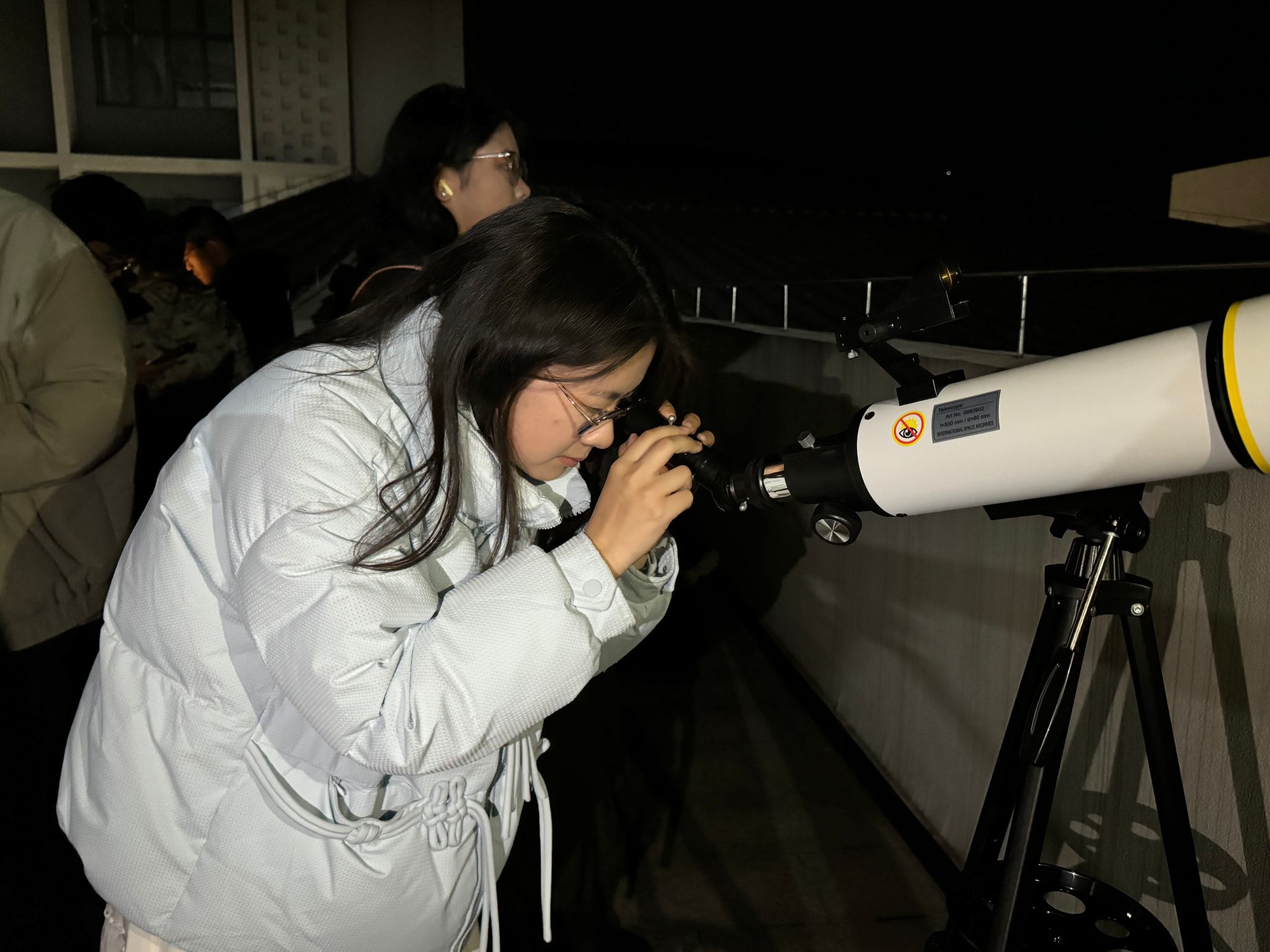 从“长安一片月,太白入怀来”的千年前文化美学,到现今“启明”“长庚”遥相望的科学追逐,金星始终是人类文明的镜像。在主持人的带领下,同学们前往贤者楼四楼一同观测天文奇景。同学们怀揣着对“浪漫”的期待,井然有序地排队利用望远镜观测这美丽的星空。看到金星的李同学特别激动,他说到:“它就像一个大大的金盘,表面上有一些奇怪的花纹,像是镶在金盘上的鎏金”;另一位用手机观测的张同学兴奋地说:“我还看到了星座,还有火星!”
