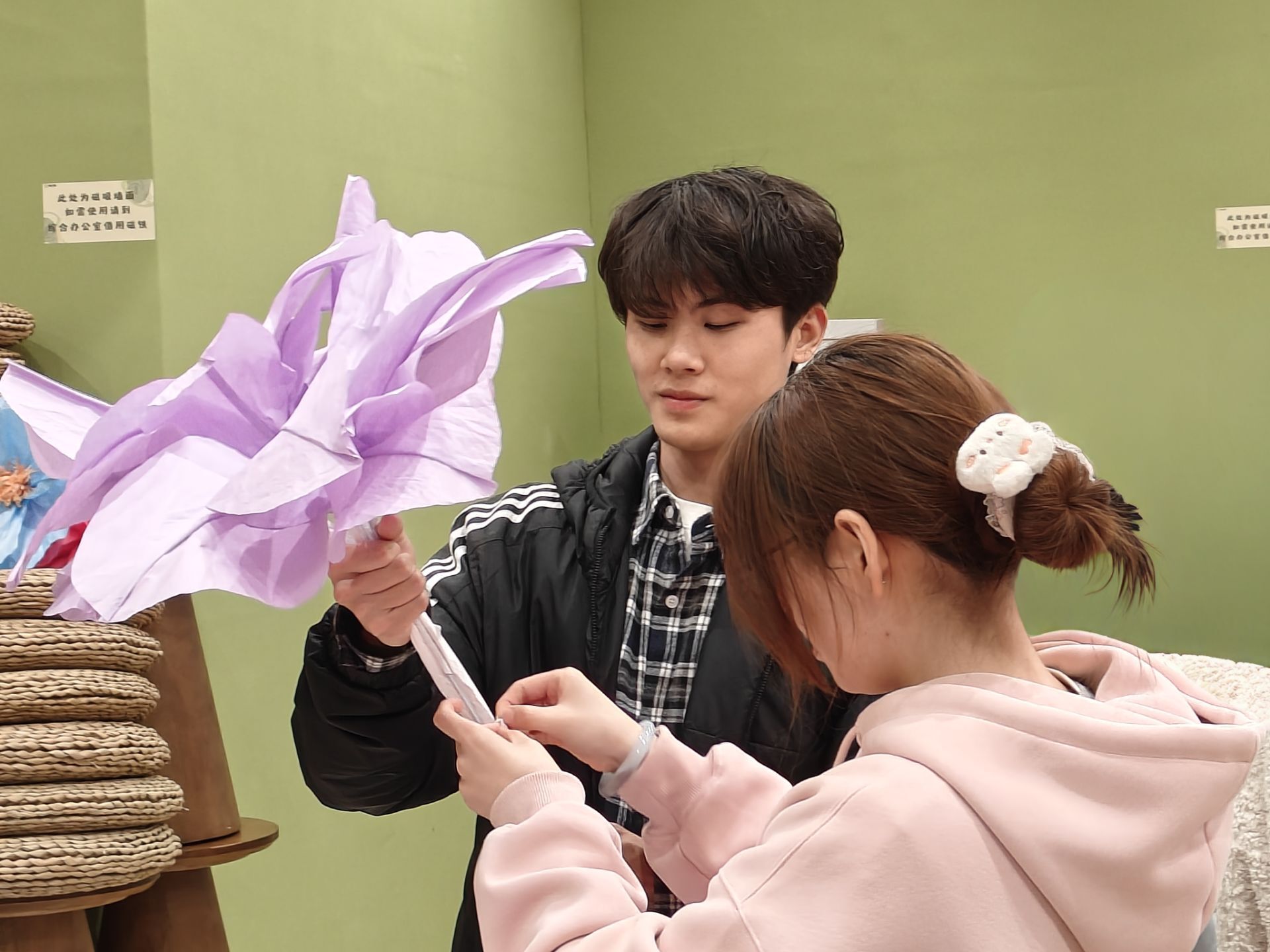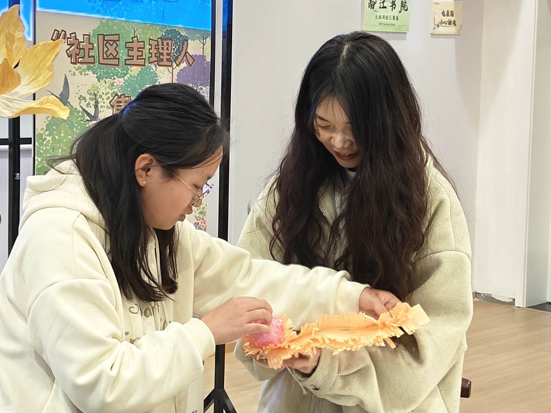 活动现场特意摆放着制作完的纸艺花样本,工作人员向大家介绍:“纸艺花看似平常,实则内蕴丰富创意与技巧。”讲解间,他们手法娴熟地示范着折纸步骤。同学们专注聆听,手中纸张在反复折叠中逐渐有了雏形。大家融入个人巧思,赋予作品独特灵魂,同学们时而轻触花瓣脉络,时而凝视叶片弧度,将自然韵律转化为指尖的折叠语言。他们感慨:"每道折痕都是与花朵的深度对话,当纸张在掌心舒展成花瓣时,仿佛听见了草木生长的声音。"这种沉浸式创作体验,正是书院倡导的"园林书院"理念的生动诠释。不少同学有感而发:“此次活动让我体悟折纸的乐趣,明白了生活之美需用心发掘。”