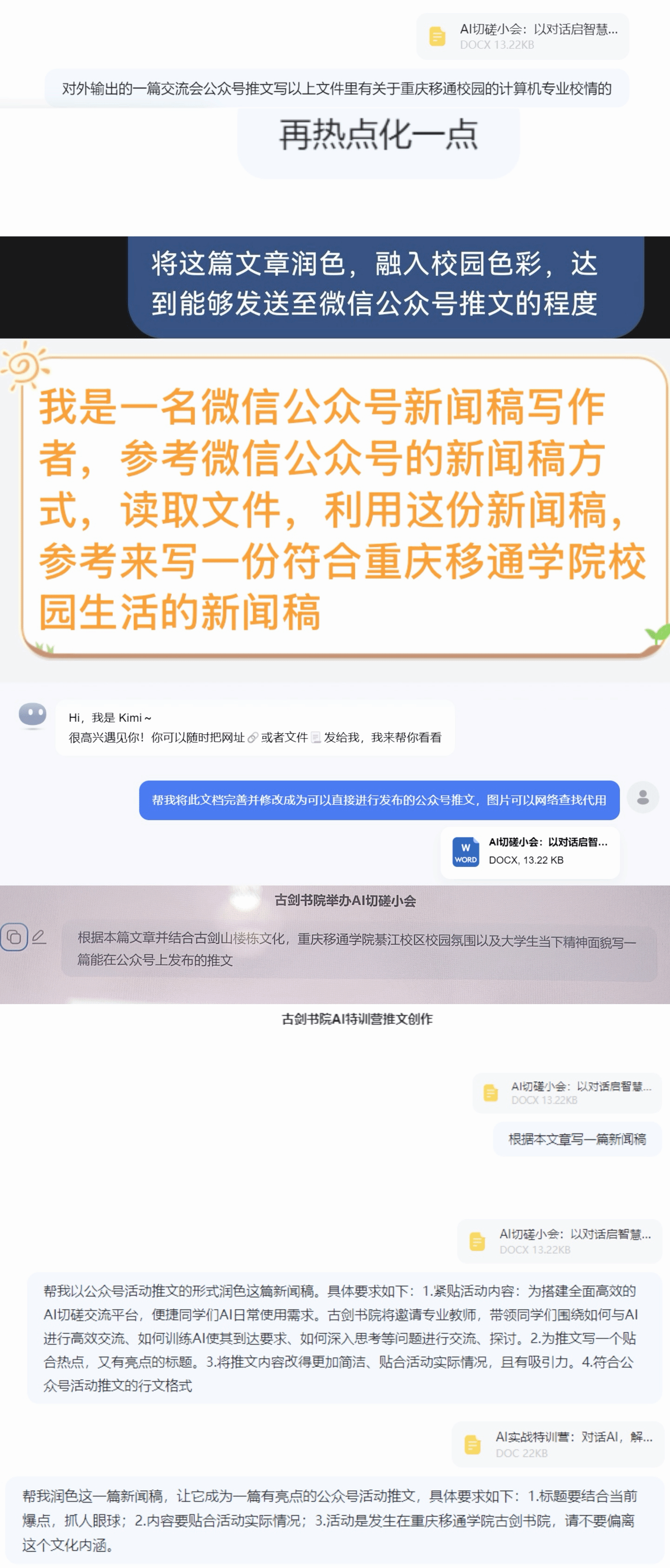 在GJ105棠溪·砚友有梗屋,学生发展导师陈芃宇以“AI赋能创作”为剑,带领学子破局传统思维!这里没有枯燥代码课,只有实战过招——用一篇新闻稿驯服AI,炼成吸睛公众号推文!语法纠错、爆点提炼、标题视觉化……学子们以指令为刃,在PK中见证AI从“工具人”进阶“脑洞王者”!