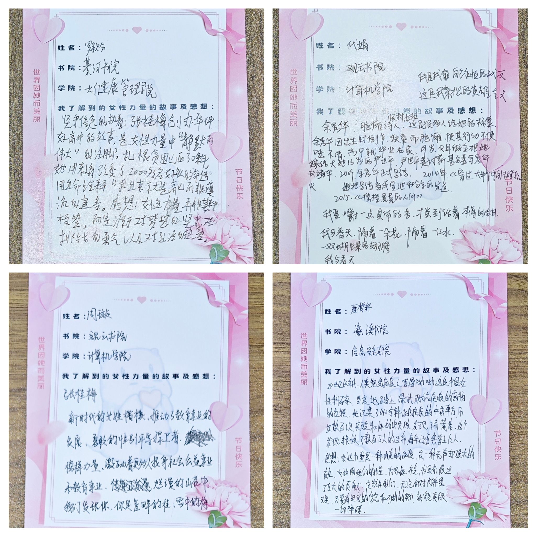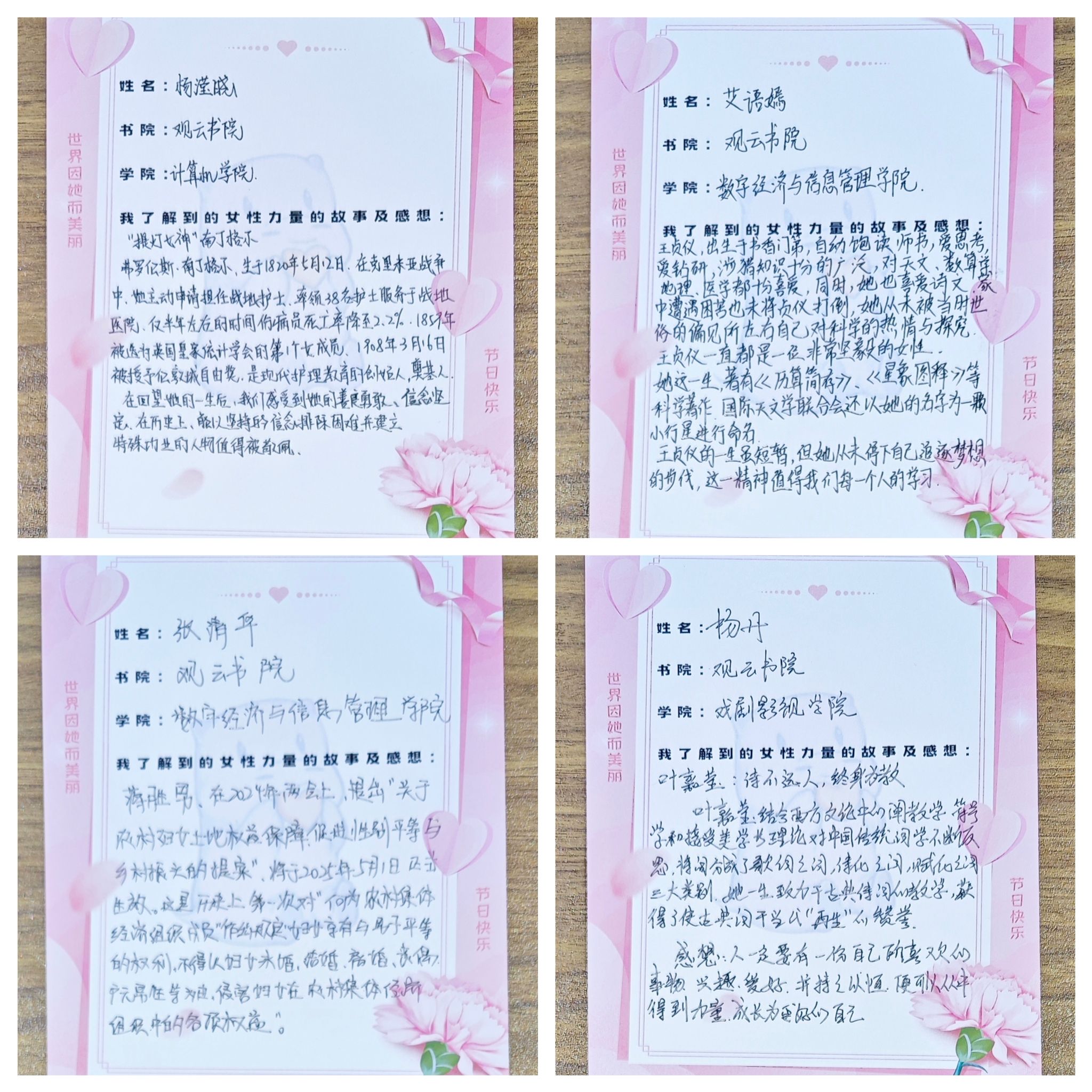 在主持人介绍完几个展现女性力量的例子后,同学们开始边思考边动笔,来自观云书院数字经济与信息管理学院的张清华同学主动上台分享她了解到的女性力量:“蒋胜男在2024年两会上提出关于农村妇女土地权益保障,促进性别平等与乡村振兴的提案。这是历史上第一次对‘何为农村集体经济组织成员’作出规定,妇女享有与男子平等的权益。”