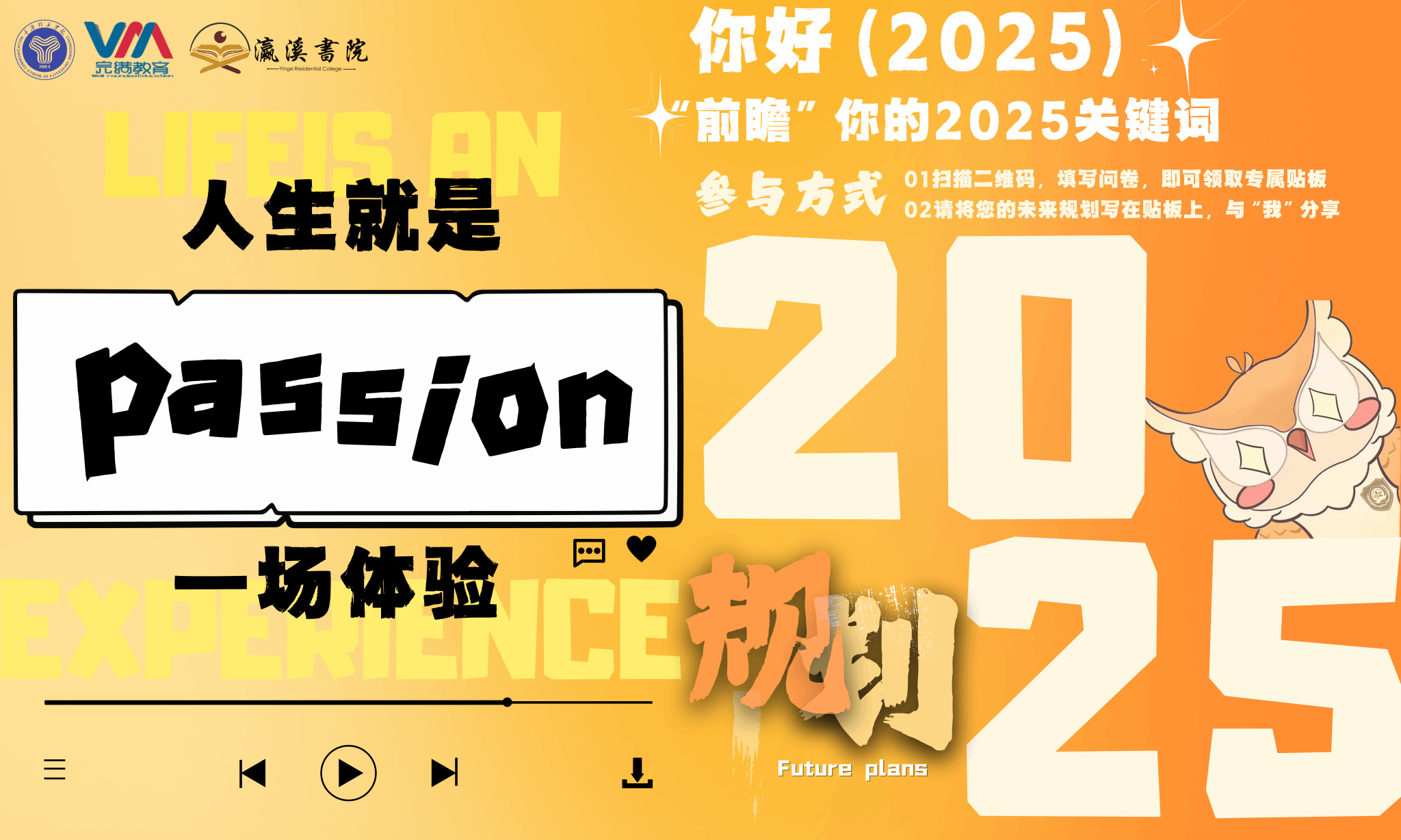 春雷惊蛰,万物竞发。随着2025年曙光破雾,新年篇章已然开启。为激励青年学子展望未来,发现2025年热爱的方向,助力规划前程,明确发展道路。瀛溪书院特此举办“人生就是要passion”前瞻你的2025关键词主题活动。