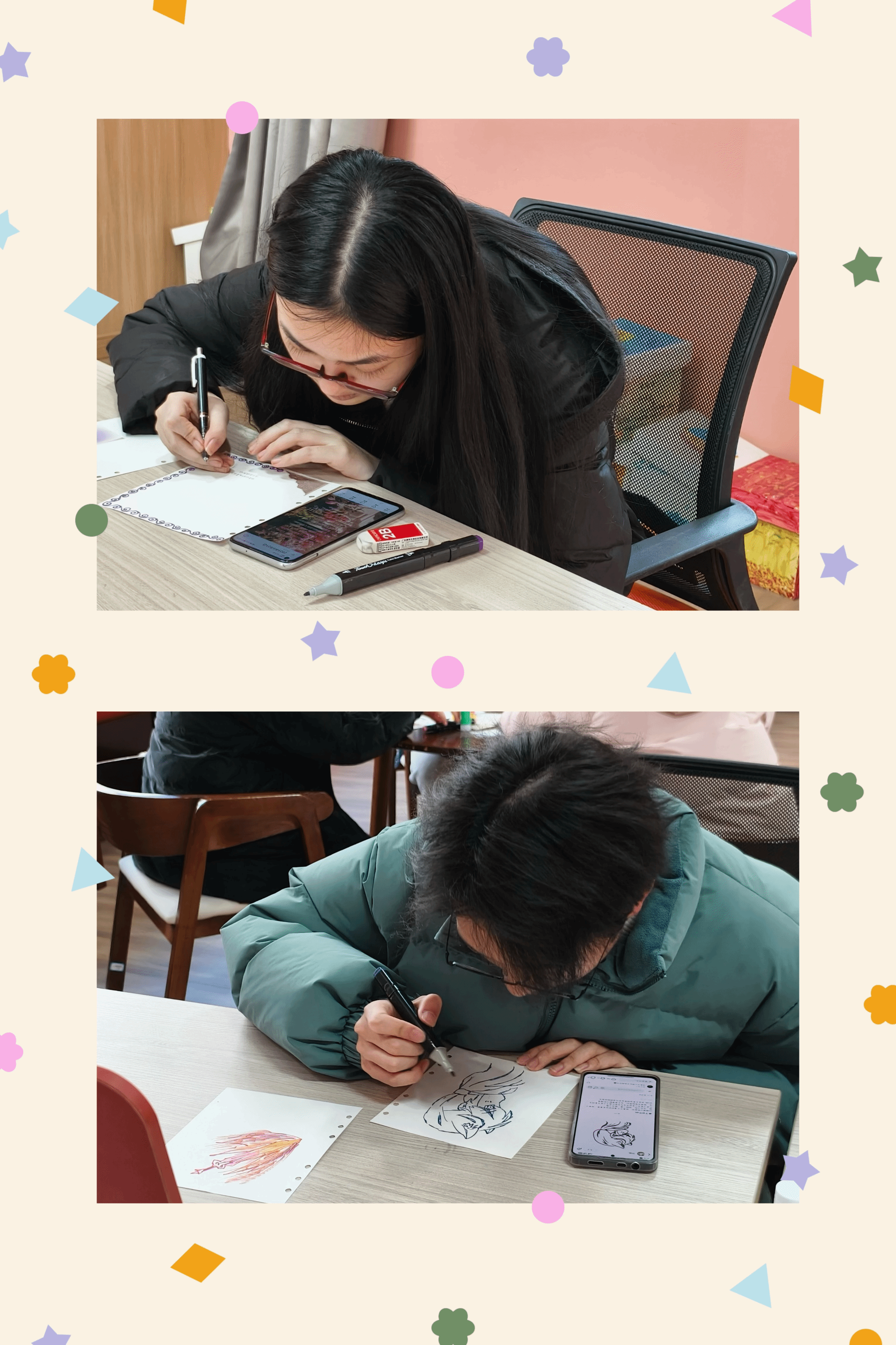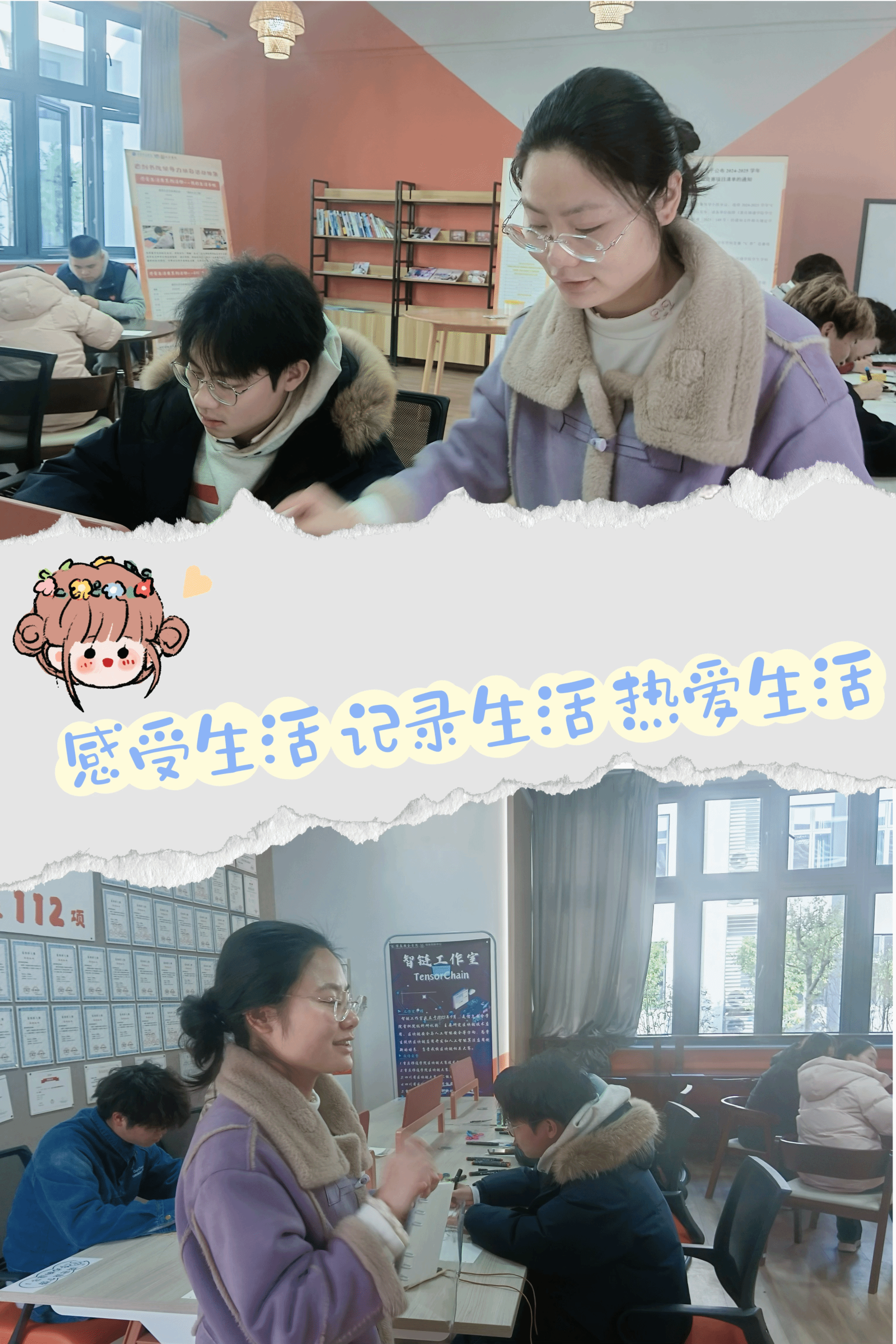 在实操环节,参与者们纷纷打开手帐本,结合老师的指导,发挥各自的想象力与创造力。有的描绘了寒假旅行中的风景,有的记录了亲友团聚的温馨时刻,还有的记录了寒假阅读的书籍和新学会的技能。活动现场气氛热烈,参与者们不仅沉浸在自己的创作世界中,还积极与他人交流分享自己的作品与心得。大家互相学习、互相启发,共同在创作中找到了乐趣与成就感。