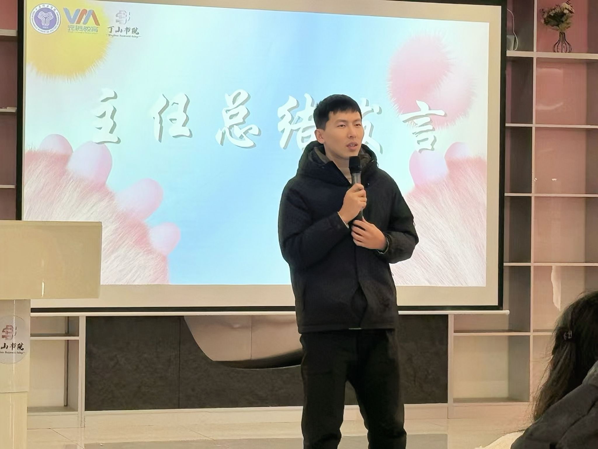 岁月因青春慨然以赴而更加静好,世间因少年挺身向前而更加瑰丽。丁山书院的三位学生发展导师袁海杰、冉酥语和黄液霖不仅对本学期的工作进行了总结和点评,还为所有干部干事和勤工送上了真挚的祝福。最后综合办公室主任赵锦阳老师对大家在工作中的成长与进步给出了高度评价,并给予寄语:“人生没有白走的路,每一步都算数”,期待在未来的广阔舞台上,见证更多丁山学子的风采。在这个难忘的夜晚,丁山书院自治委员会的成员们以饱满的热情,共同回顾了这一学期的成长历程。他们坚信,丁山书院学生自治委员会将以更加昂扬的斗志迎接挑战,共同书写丁山书院更加灿烂的明天。