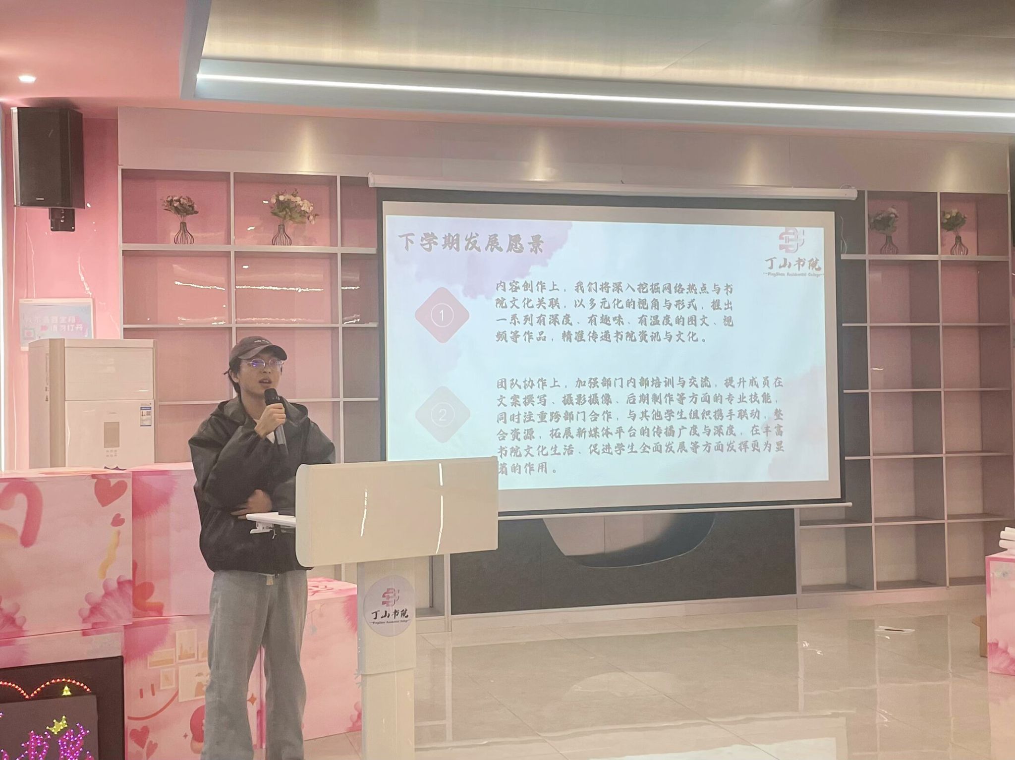丁山书院在老师和学生团队的共同努力下,圆满完成第一学期工作任务。活动伊始,活动实践部部长周语彤讲述了这一学期的收获“细节决定成败,细节对于活动而言,就如同建筑中的一砖一瓦,虽看似微不足道,却共同构筑起了整个活动的坚实基础”;新媒体技术部部长李仁斌则用数据可视化对本学期的社交媒体账号建设及宣传内容进行了数据展示,并对下一学期的宣传内容做出详细规划;综合办公室部长袁康对学生干部以及勤工团队的日常管理进行了总结,讲述了提升活动质量和管理效率的措施;其他各部门部长也都激情分享了这一学期的收获与成长,并为书院未来的发展提供了实际的改进建议。