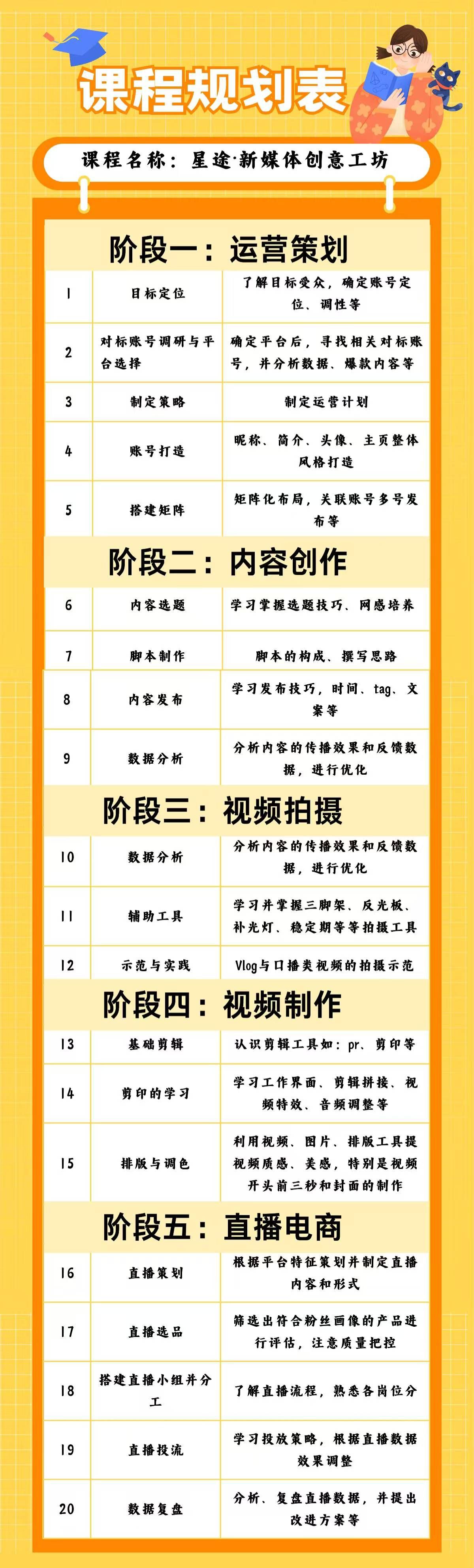 新媒体创意工作坊的培养体系聚焦实践与创新,着力提升学生在自媒体平台和融媒体策划方面的能力。联动校内外资源,紧跟数字化、智能化媒体发展趋势,以“媒体人”的视角洞悉社会发展潮流趋势,结合自身特点,进行“品牌”包装。通过自媒体运营理论与实际账号操作相结合,从运营策划、内容创作、视频拍摄、视频制作、直播电商五个阶段,学生得以在实践中打造个人IP。