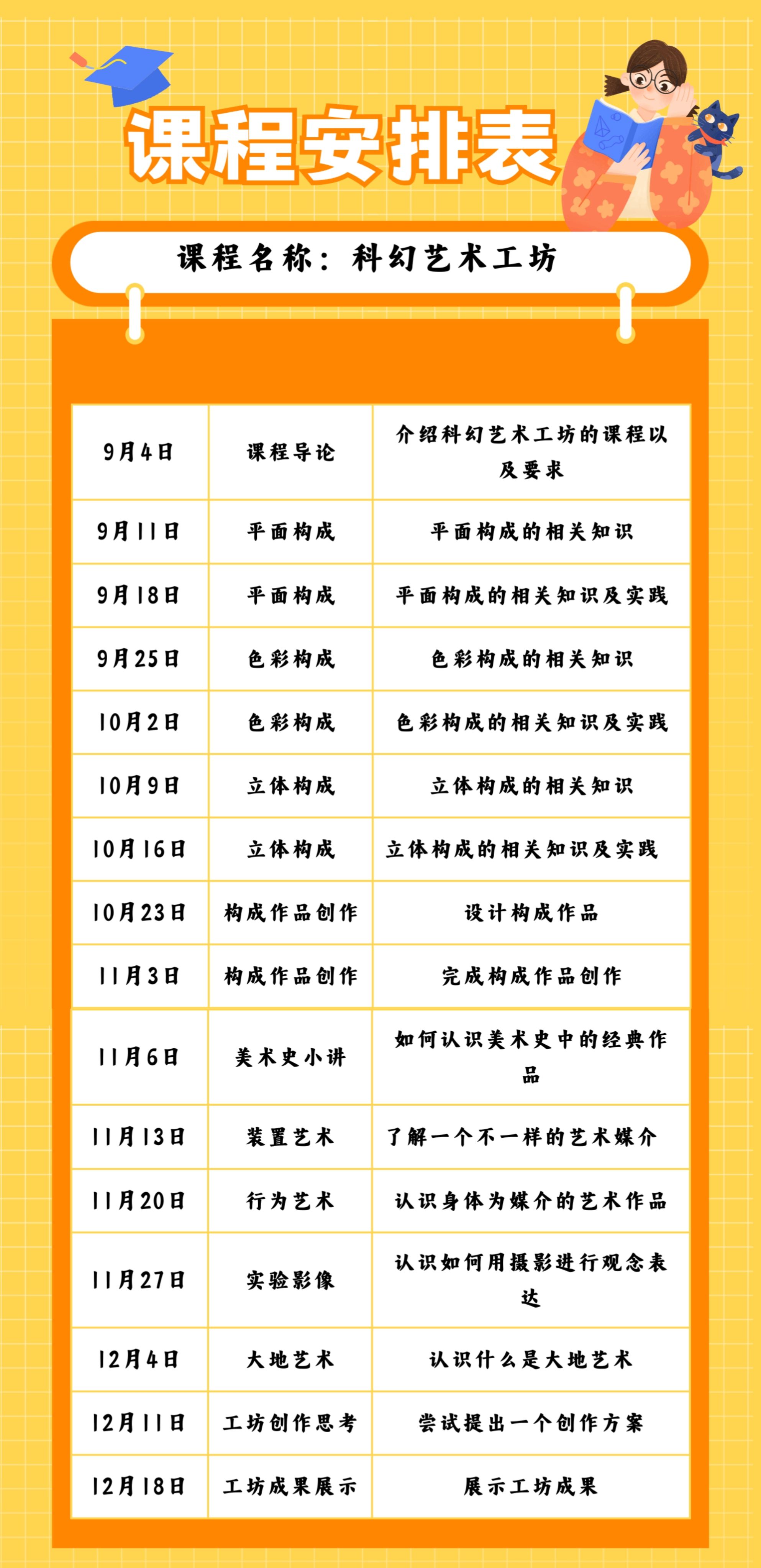 科幻艺术工作坊将当代艺术中的综合材料和新媒体艺术纳入到实践环节中,建立一个生动有趣并能够完全释放学生创新力的课程体系,帮助同学们学会用装置艺术的方式进行自我表达、自我价值提升以及多样化的解决问题。本学期工坊开设“审美基础”与“审美进阶”课程,共计16次。随着成员能力增长,还将推出“装置艺术实践”与“非遗+科幻”艺术创作课程,全方位提升学生审美、美术设计及当代艺术思维。