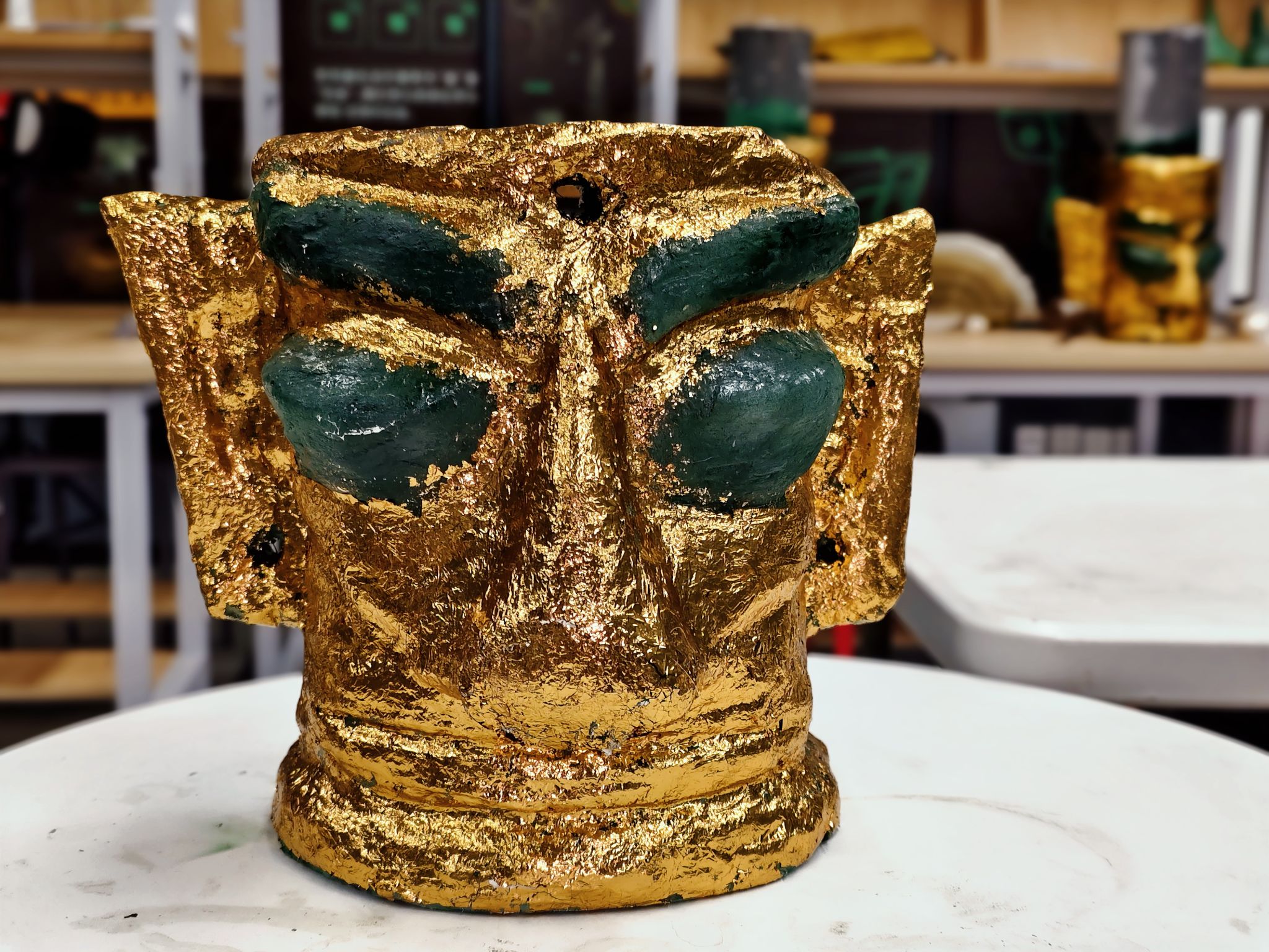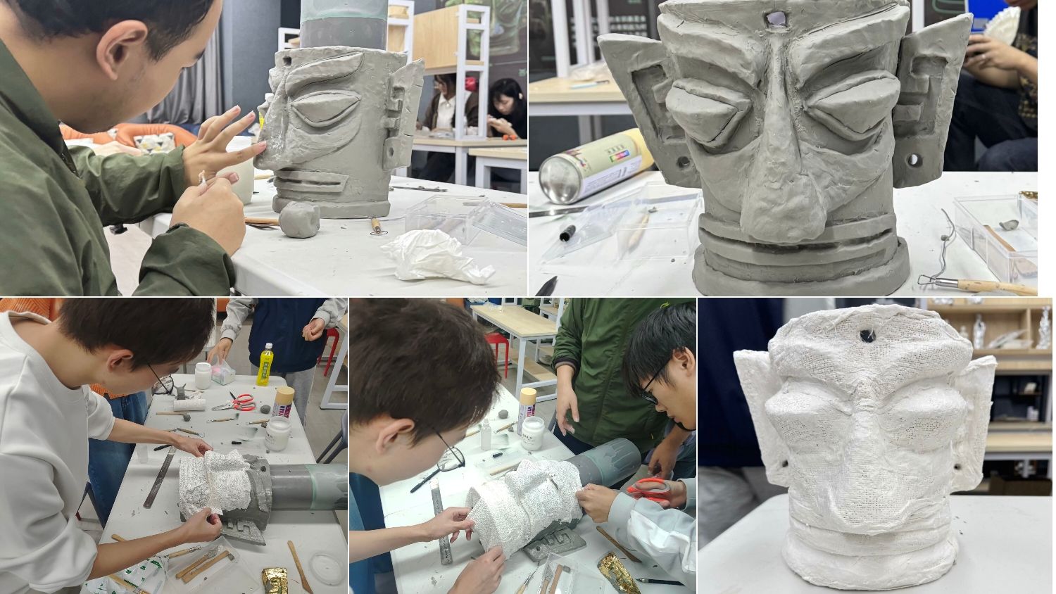 除女俑制作之外,“文物修复”小组则负责青铜面具的制作,由于材料性质特殊,前期由油泥制作的青铜面具在高温天气下出现脱落、融化,为使其可以长期保存,指导老师及工坊成员尝试更换材料进行重新制作。经过反复试验与调整,成员们发现石膏这一材质易孤型,不易受气温影响,于是同学们大胆脱离传统软油泥的塑形方式,引入石膏倒模元素,最终成功制作石膏版“青铜面具”,也解决了在多种环境下的长期保存的难题。