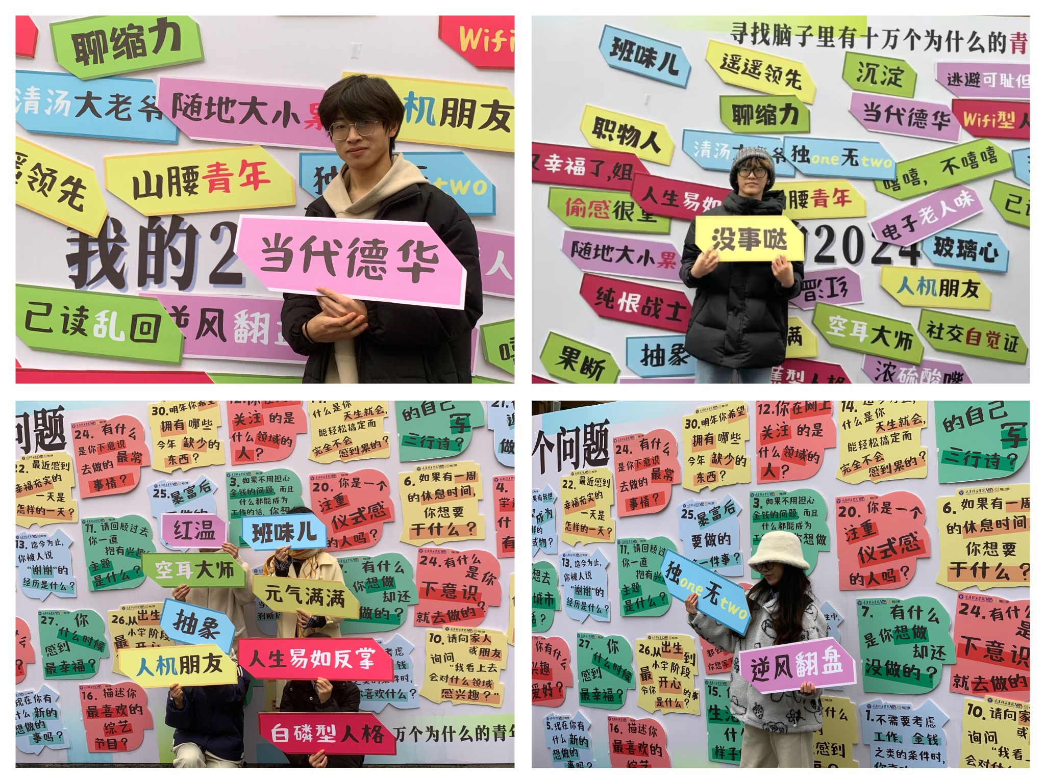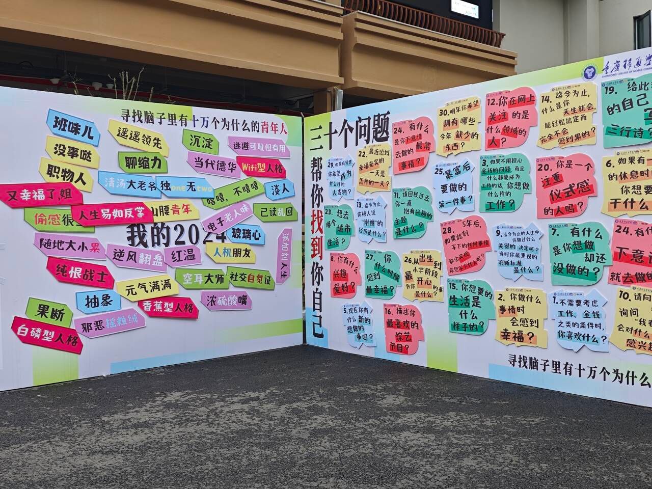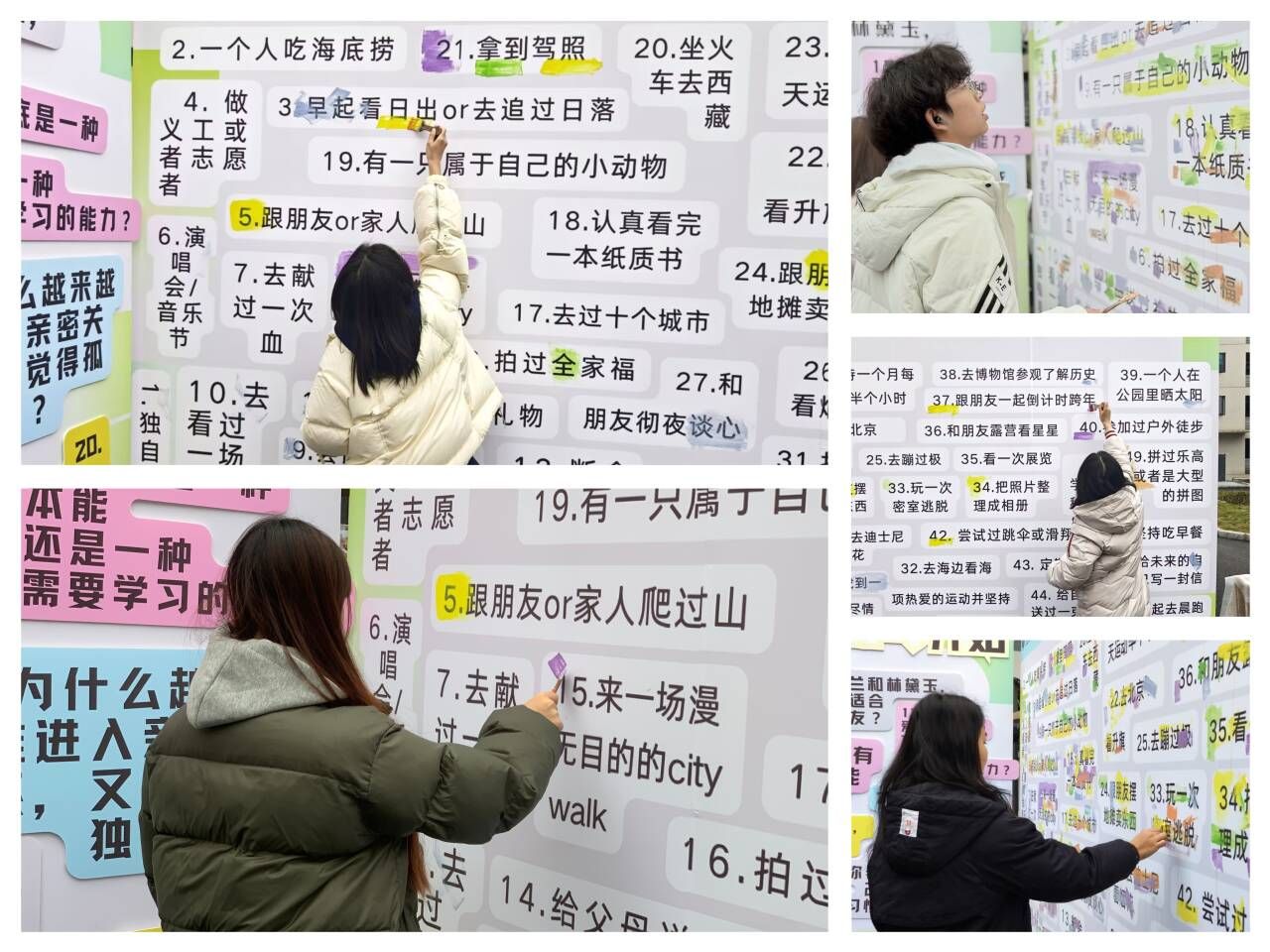 五彩斑斓的涂鸦墙,学子们以颜料为笔,将自己的故事与情感融入其中,许多学子都有过“跟朋友一起倒计时跨年”的经历,也有部分学子沉浸在“拼过乐高或大型拼图”的世界里,以行动书写属于自己的青春篇章。这些涂鸦不仅是学子们对过去的回忆,更是对自己未来的期许与憧憬,旨在鼓励学子勇于对自我提问、敢于实践,以建立更加清晰的自我认知。