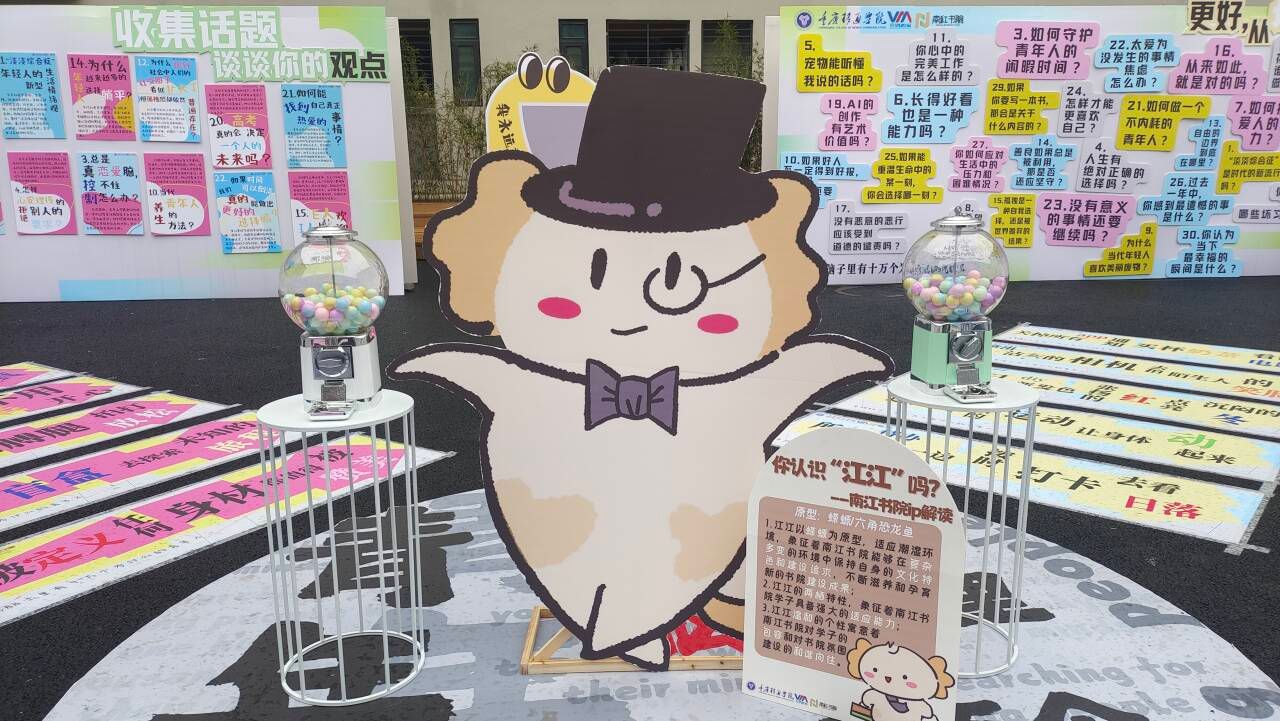 问题展依托“提问与反思”,通过前期的话题征集,旨在为青年人提供一个向自己、向社会提出问题的平台。问题展整体呈长方形,从中间出发,向四个角投射形成“斑马线”,其内容为给青年人一个增添生活趣味的idea——做从未挑战过的事,给自己一个新的成长机会。Q版“江江”首次亮相与扭蛋机落座于问题展中间,扭蛋内藏着“人生哲学”等你探索!