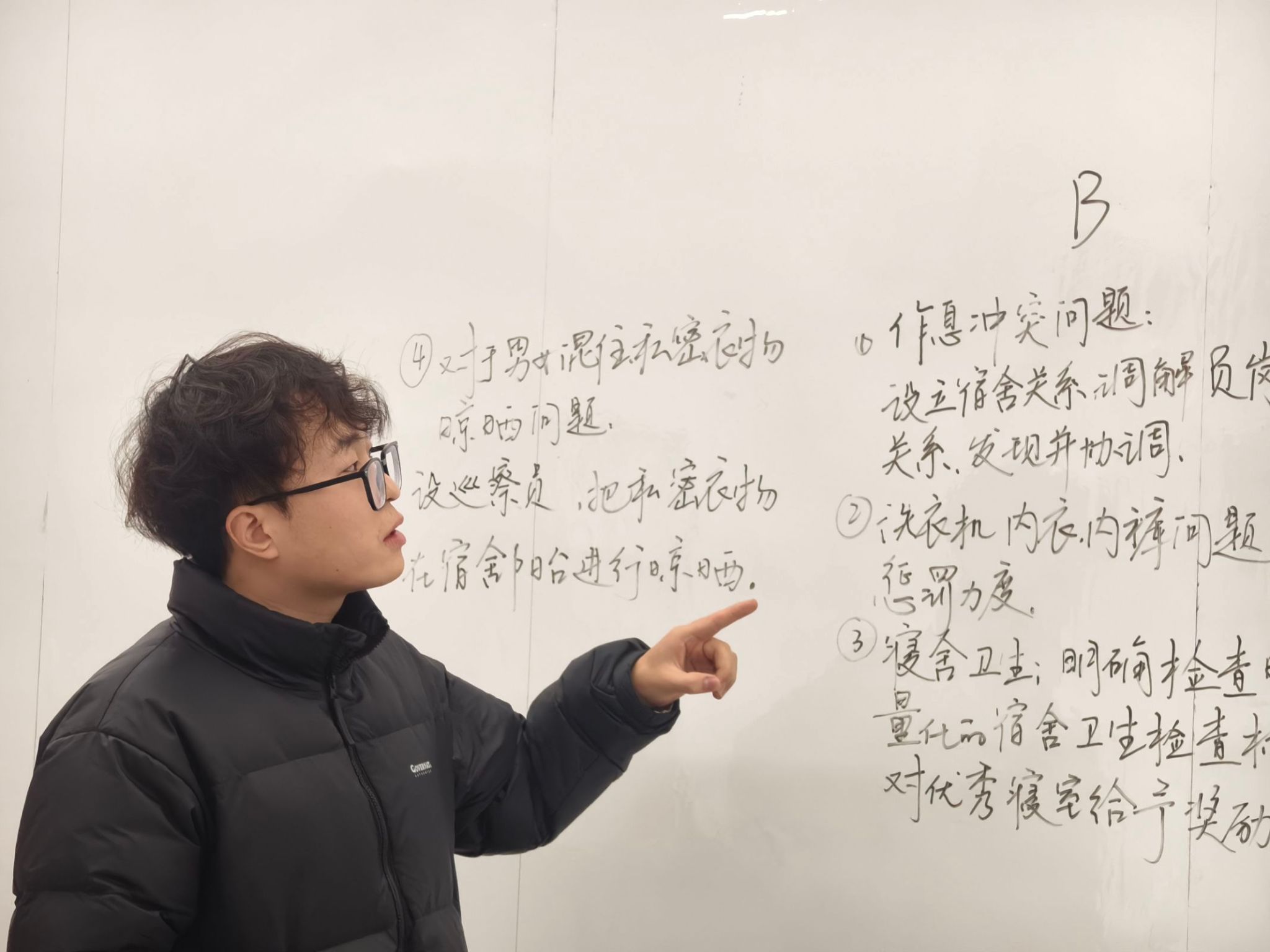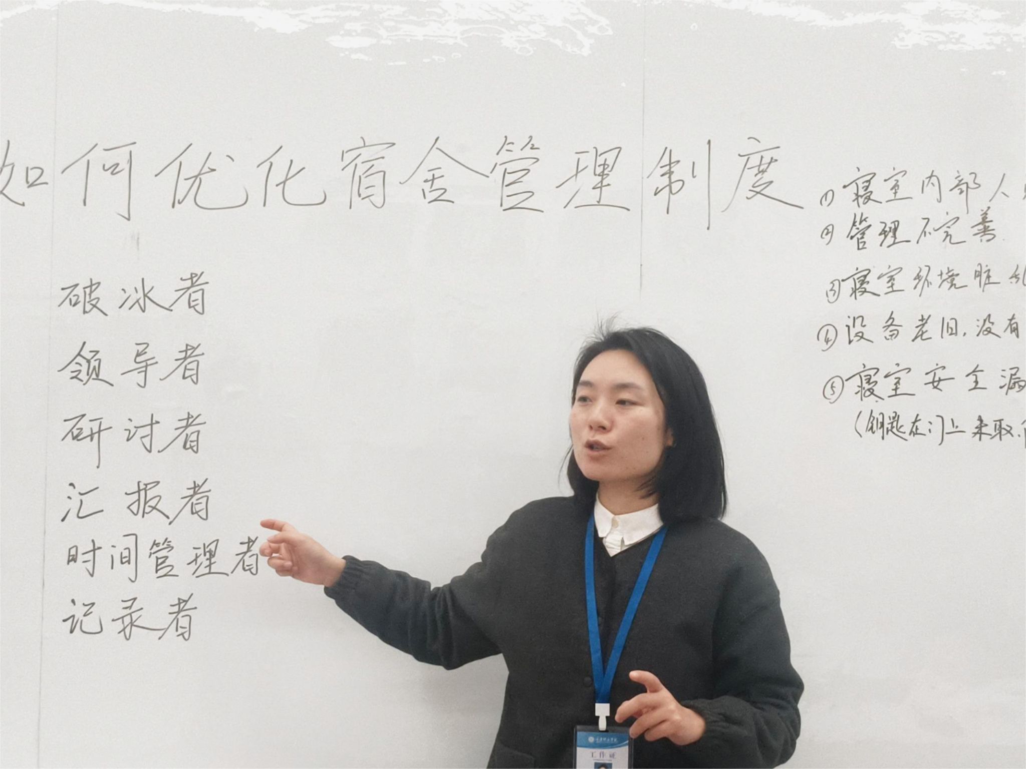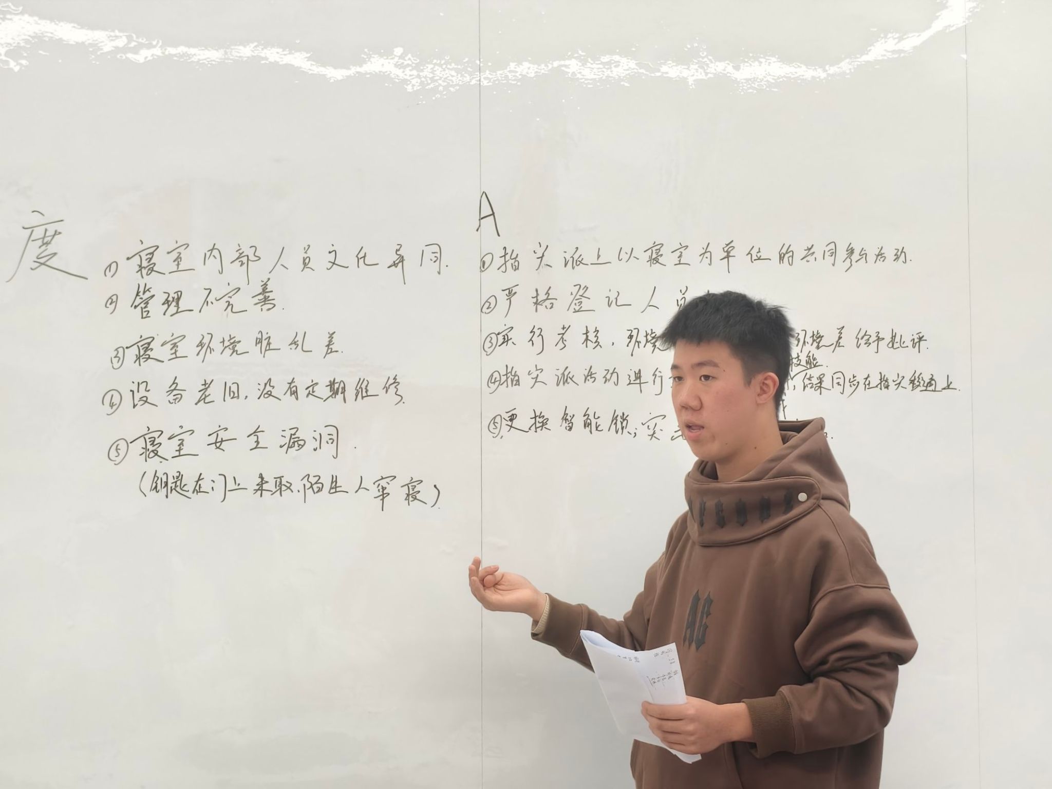 此次活动中,同学们展现出高度的关注、热情、团队协作精神和责任感。A组同学表示寝室安全问题有很大隐患,要定期开展安全教育活动,包括消防演安全意识练、防诈宣传等,提高学生的安全意识和自我保护能力。B组同学则重点表示宿舍卫生不达标现象明显,要制定详细的宿舍卫生标准,包括地面、墙面、桌面、床铺、卫生间等方面的清洁要求。同时定期进行宿舍卫生检查,对卫生不达标的宿舍进行通报和整改,确保宿舍环境的整洁和卫生。在讨论过程中,同学们相互倾听、相互尊重,注重用事实说话,寻求共识和解决方案。