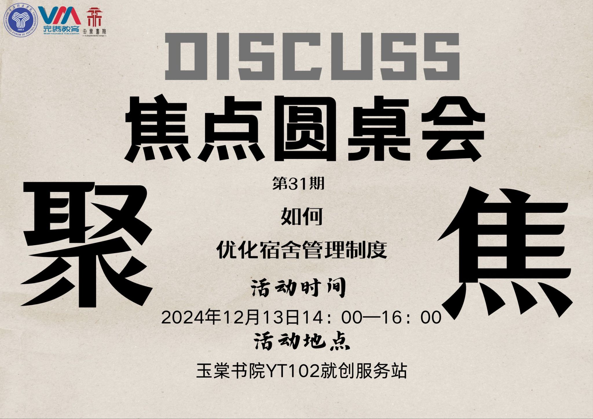 此次焦点圆桌会第31期的成功举办,不仅为同学们提供了一个交流和学习的平台,也为优化宿舍管理制度、提升宿舍管理水平提供了有益的参考和借鉴。玉棠书院将不断优化此系列活动,为同学们打造一个更好的展示自我、表达自我的平台。