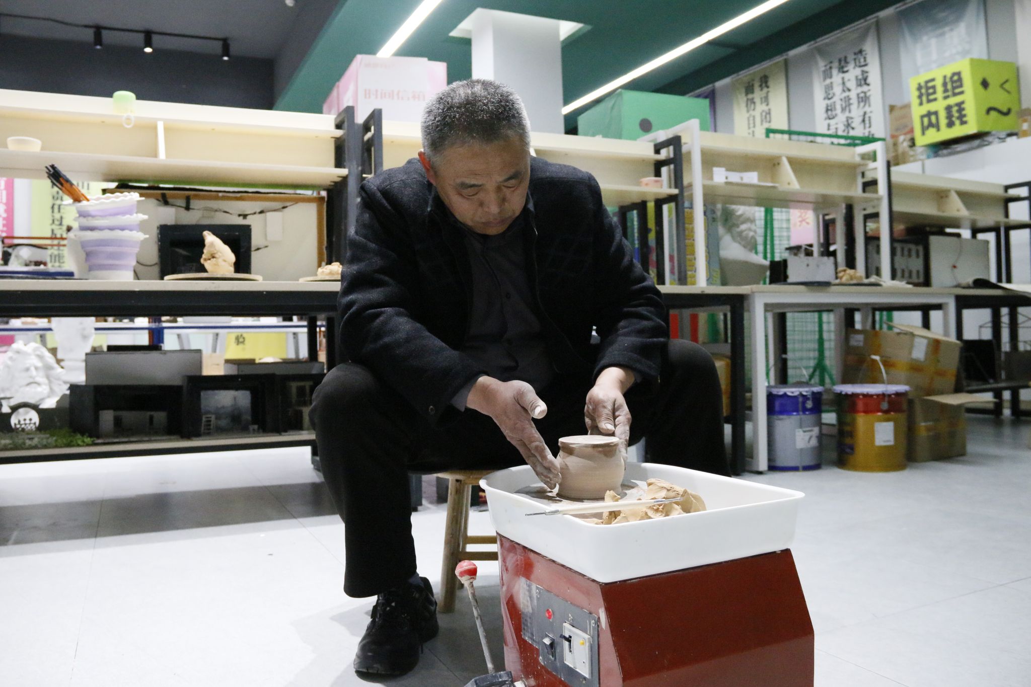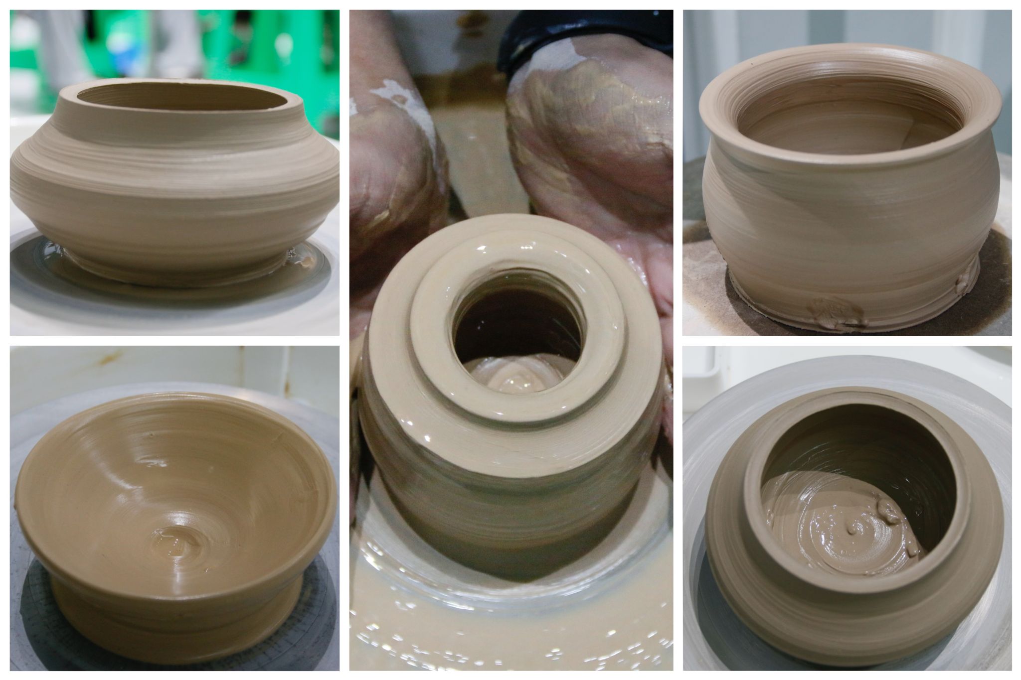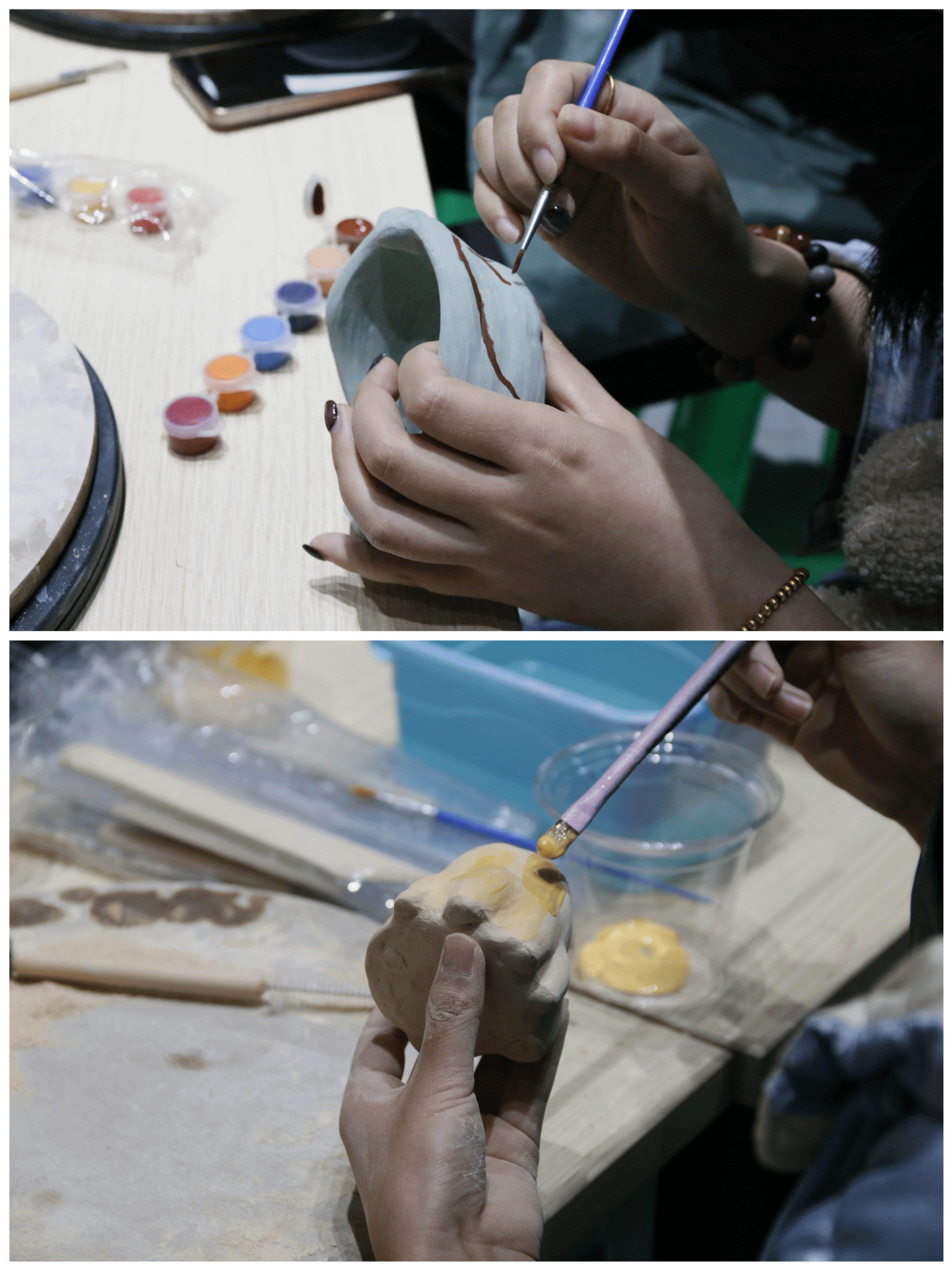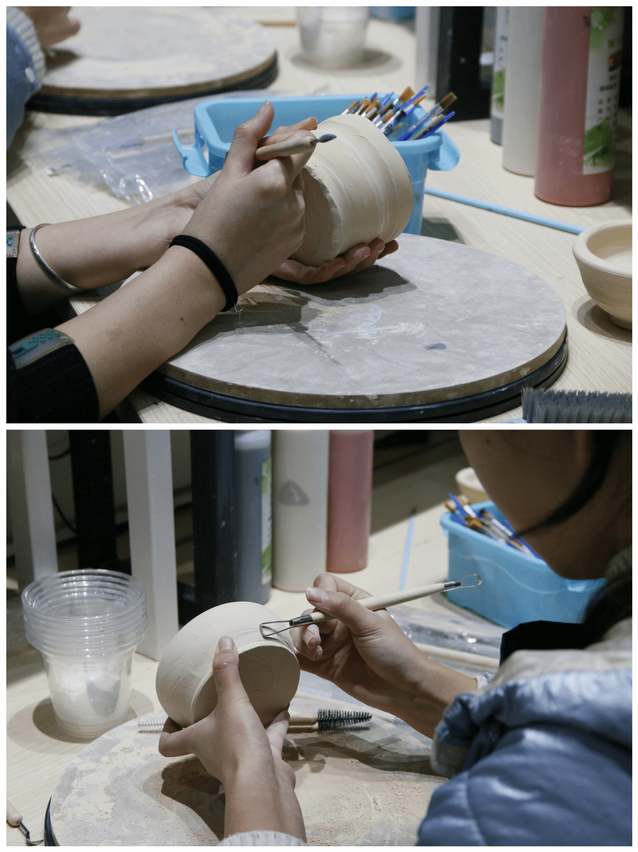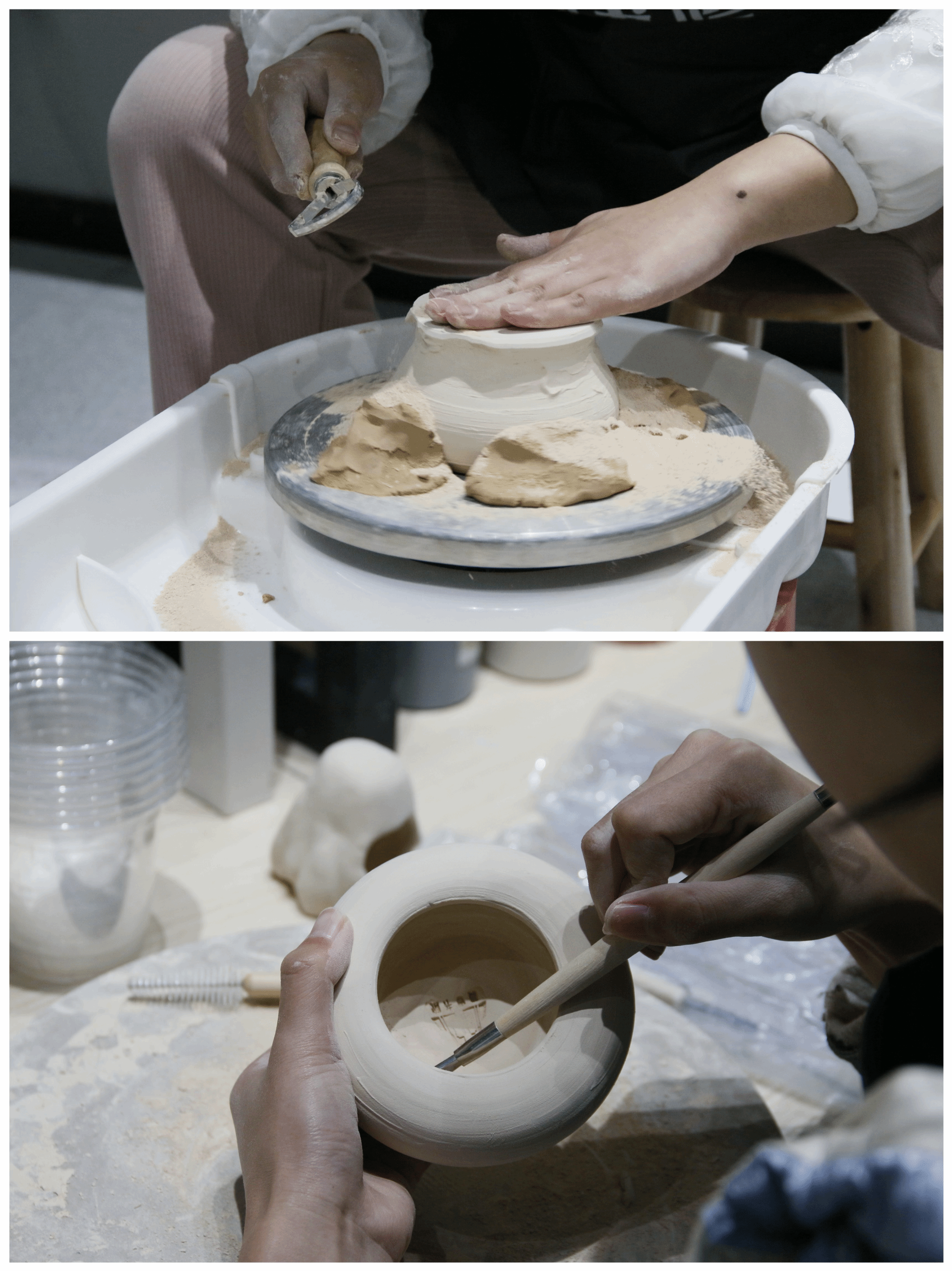 “三分做,七分修”,无论是传统陶艺还是现代陶艺,修坯技法不可或缺!连勇师傅用他那宽厚而富有技艺的双手捧起一只泥胚说道:“陶艺的精髓在于用心的雕刻,雕刻的技巧在于手勤、手稳、手准、手快”。只见连勇师傅刀刃锋利角度适中,通过连续的、轻柔的切削动作将手中的素胚雕刻成形态优美、线条流畅的陶瓷艺术品。同学们对连勇师傅几十年练就的精湛手法发出阵阵惊叹,在沉浸式观摩完修胚后便尝试着将手中的泥胚雕琢成自己心中的模样,亲身感受着陶艺修坯的魅力与挑战。