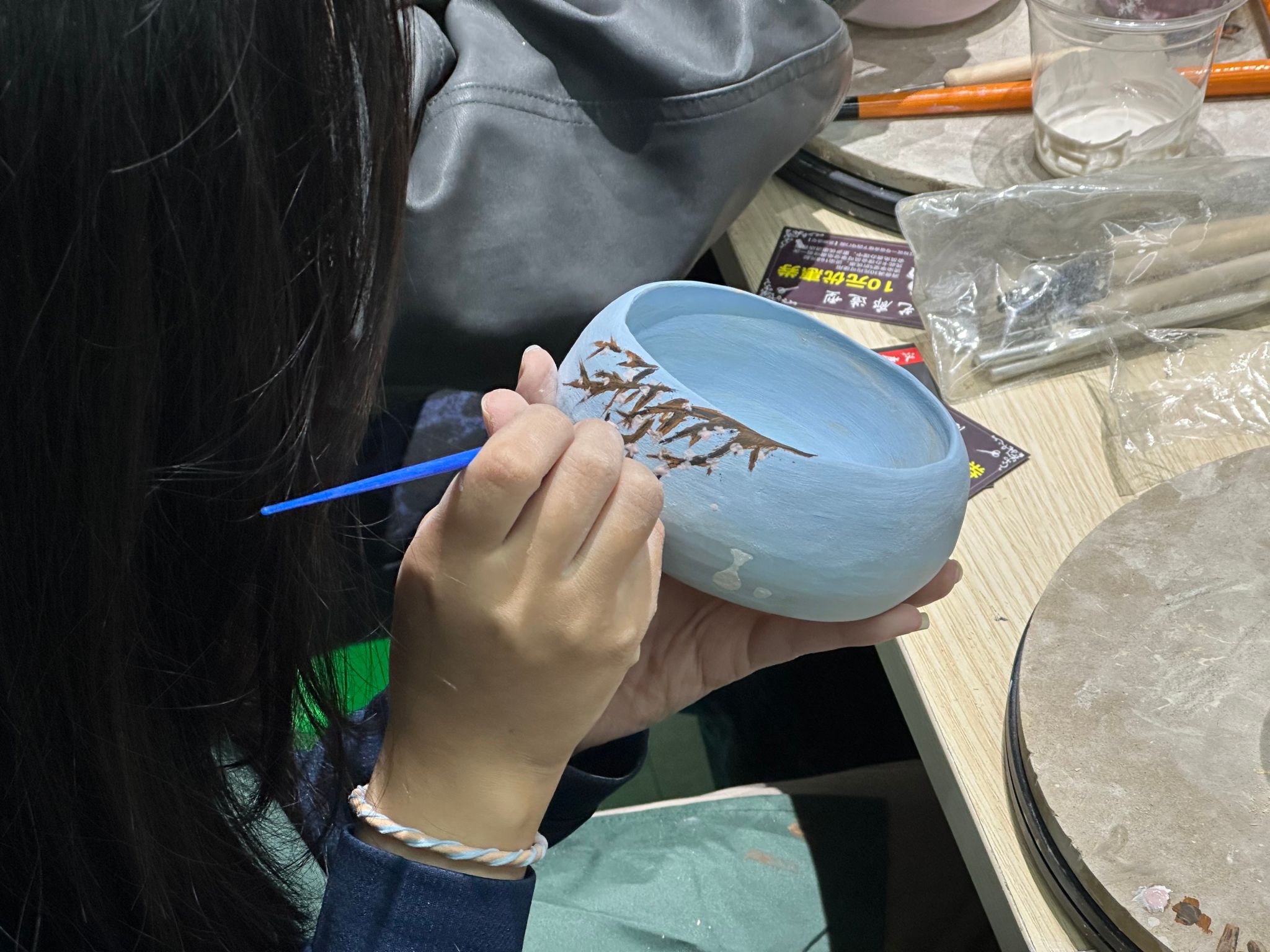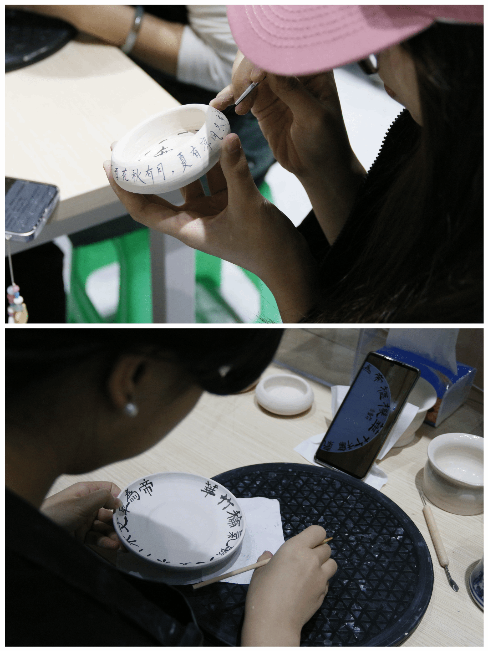 为让工坊成员学习陶瓷制作到装饰的全过程,感受传统与创新的完美融合。连勇师傅为大家讲解了陶艺独具特色的装饰艺术——题词上釉。古诗词与色彩的碰撞产生了强烈的美学元素,书院学子们巧妙运用色彩调配与古诗句融合,感受了一次别具风味的装饰美学体验。釉色让陶瓷增添光滑温润的触感,更使其焕发处晶莹剔透、色彩斑斓的迷人光泽;陶瓷上的古诗词为观者提供了视觉上的美感,更通过诗词的内容引发人们的情感共鸣和心灵触动。书院学子们在题词上釉的过程中提升了自己的文化素养与审美能力。
