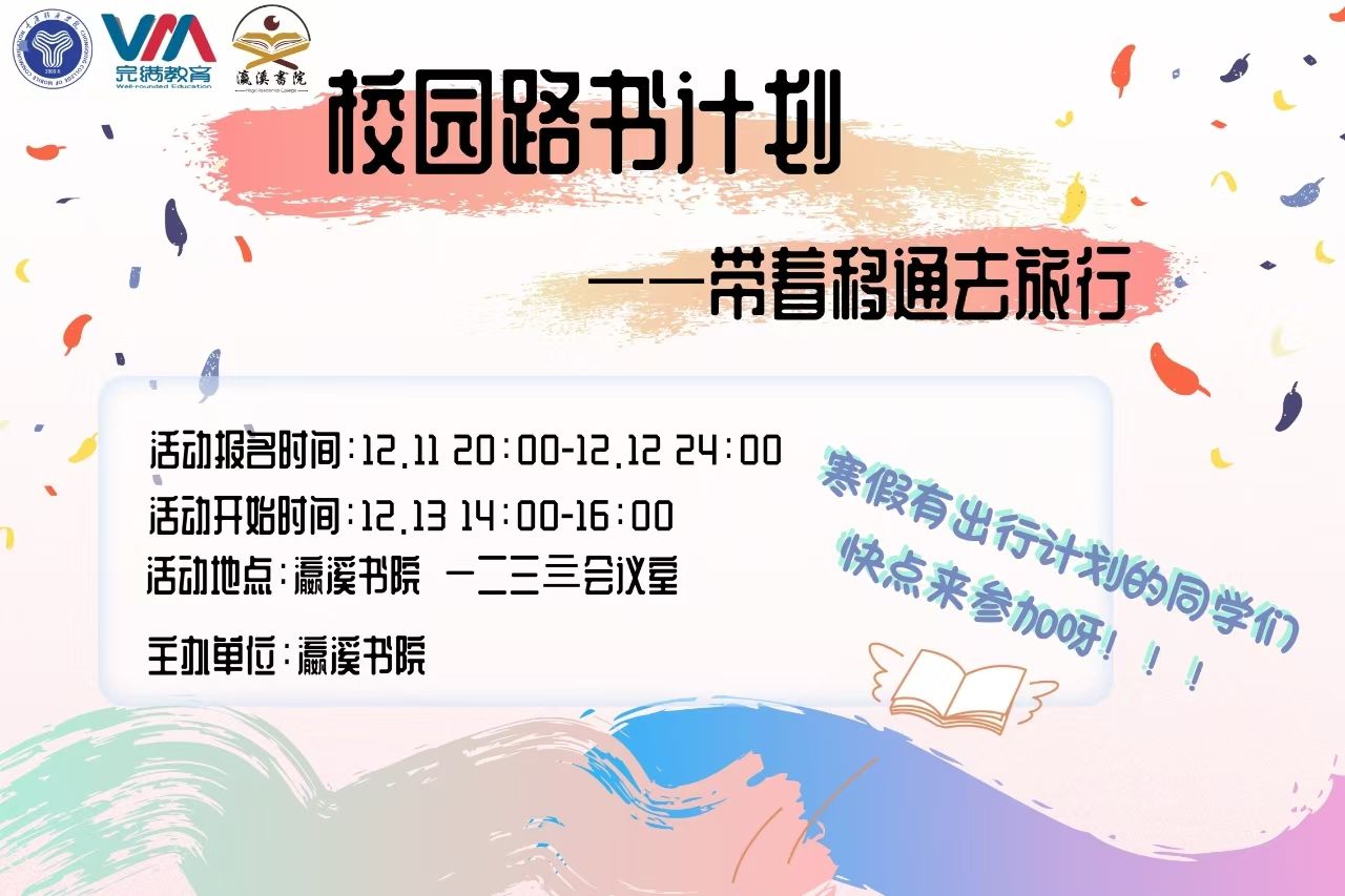 为此,瀛溪书院开展“带着移通去旅行--校园路书计划”活动。“路书”的制作能让参与者更深切、近距离地了解到访的城市,提前预判或感知目的地的魅力,设定自己的期待值以及预期。通过旅行,参与者可以亲身体验不同的地理环境和文化背景,拓宽视野,增长见识,感受自然和历史的魅力。特此召集有意愿的同学们来参加,让大家在游历千山万水的世界之书中,分享心之所感,共踏青春之程,记录下与移通相伴的每一段精彩旅程,展现出青春的活力与探索的勇气。