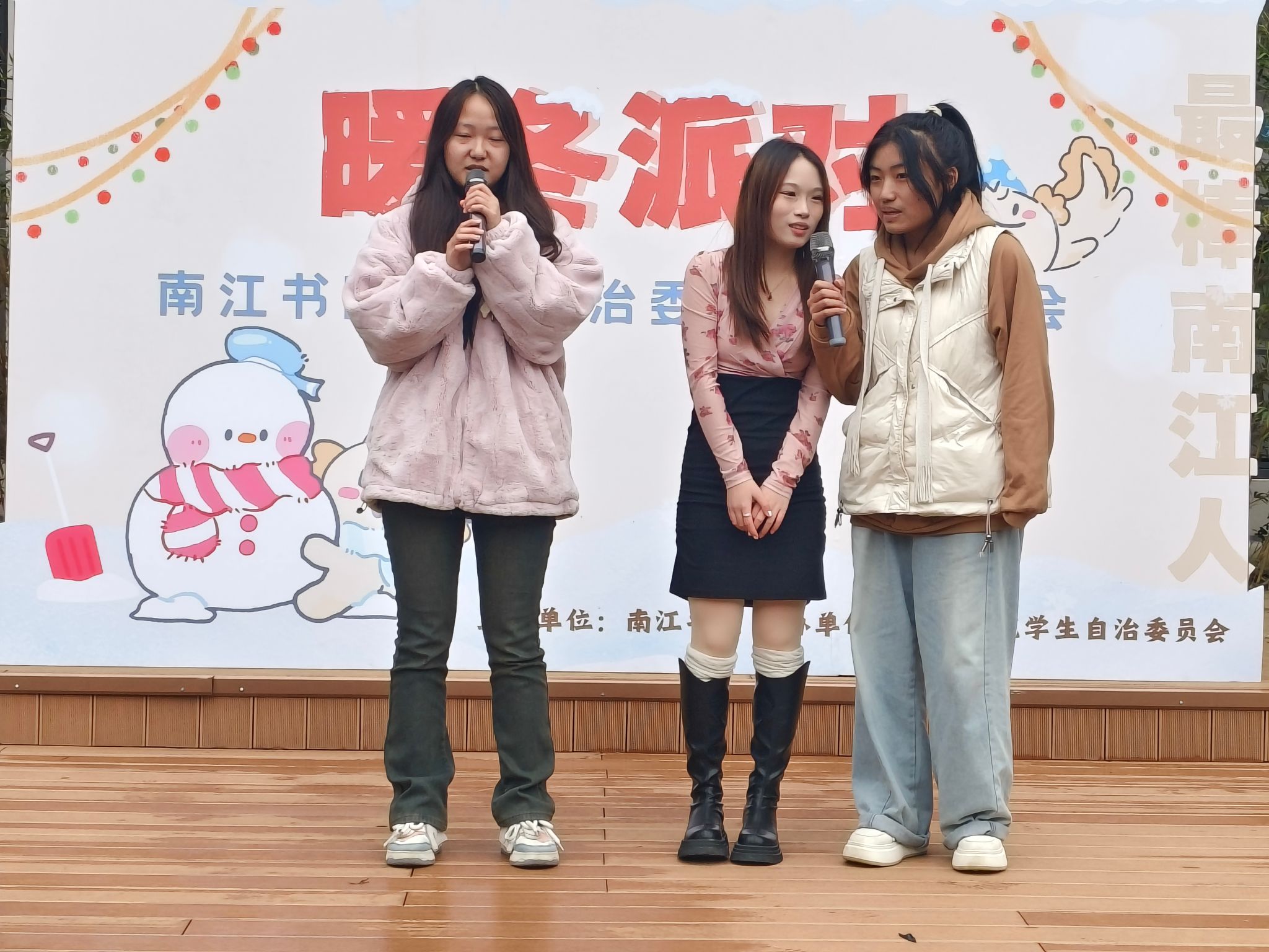 酒会上,各部门都展示了他们的风采与活力。以主席合唱的《岁月神偷》开场,各部门干部干事一起进行表演,传递温馨能量。在刚进入南江之时,连拍大合照都是局促不安,在一学期之后,大家真正以家人之名,展现部门风采,书写南江故事。“飞花令”游戏更是将气氛推向高潮。各部门选派代表参与,围绕与冬季相关的词语展开激烈角逐,同时也拉近了成员们与南江书院学生自治委员会这个大家庭的距离。后续团建活动中各部门团队协作激烈角逐,多样游戏集趣味性、竞技性于一体,为师生呈上活力四溢的冬日盛宴,促交流、凝情谊,成美好记忆。