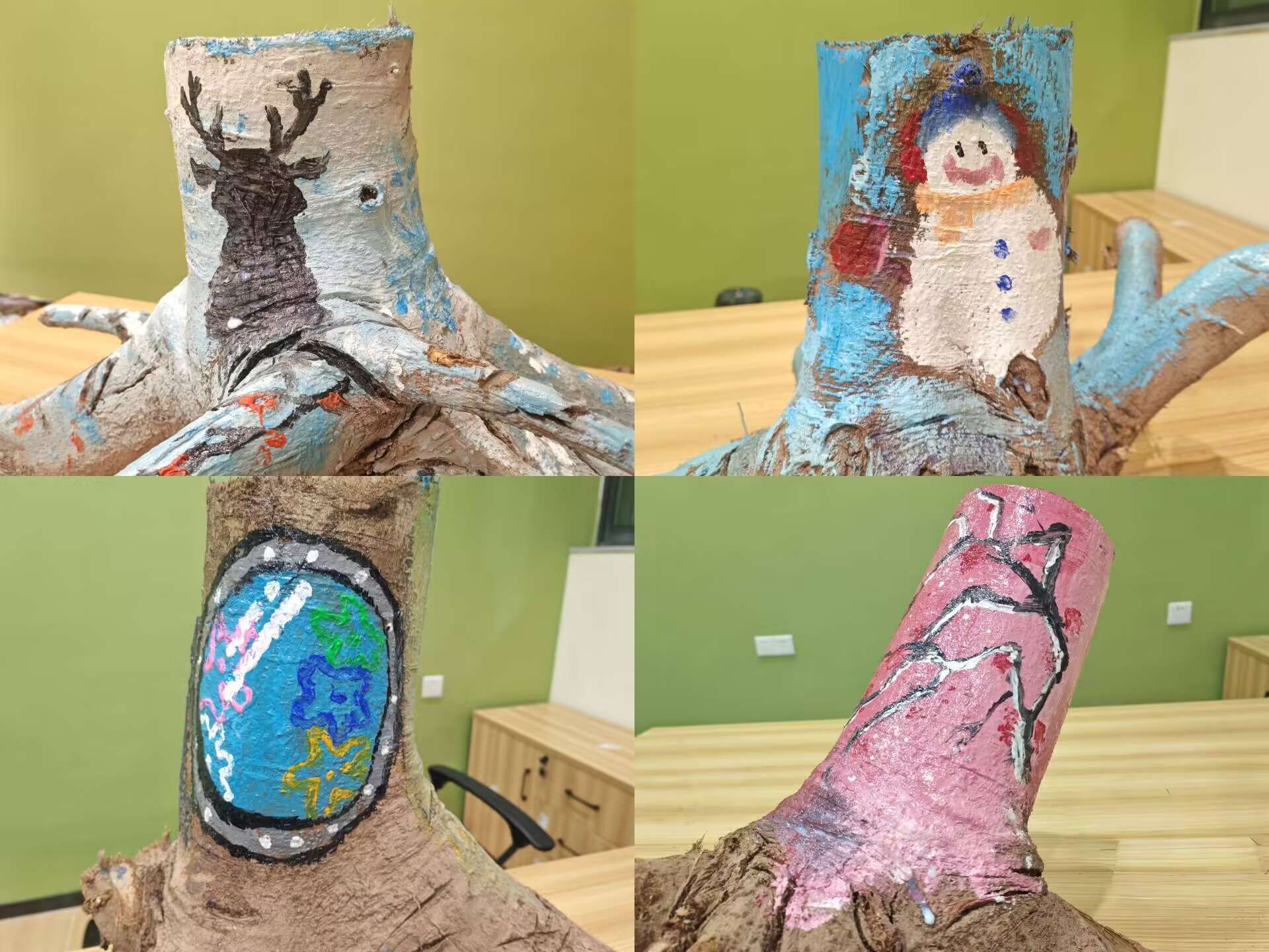 “桩上雕塑家”:这次木桩画画的主题是大雪,一说到大雪,我就忍不住想到“墙角有几枝梅花,在寒冷中独自绽放”、“宝剑的锋利是经过磨砺得来的,梅花的香味是经过严寒才有的”这些诗句,让我更懂得梅花的美和坚强,梅花也是我最喜欢的花呢。
