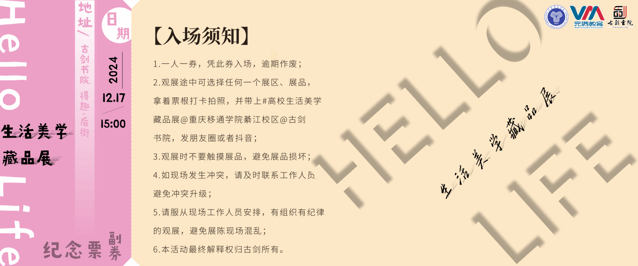 每位观展者可在现场领取生活美学藏品展纪念门票,即可入场参观。在观展途中,您可以根据自己的喜好,选择任何一个展区或展品,并拿着票根拍照打卡。同时,我们鼓励您将这些美好的瞬间分享到朋友圈或抖音,带上#高校生活美学藏品展@重庆移通学院綦江校区@古剑书院的话题标签,让更多的人感受到生活美学的魅力。