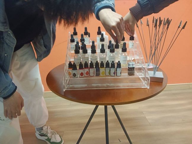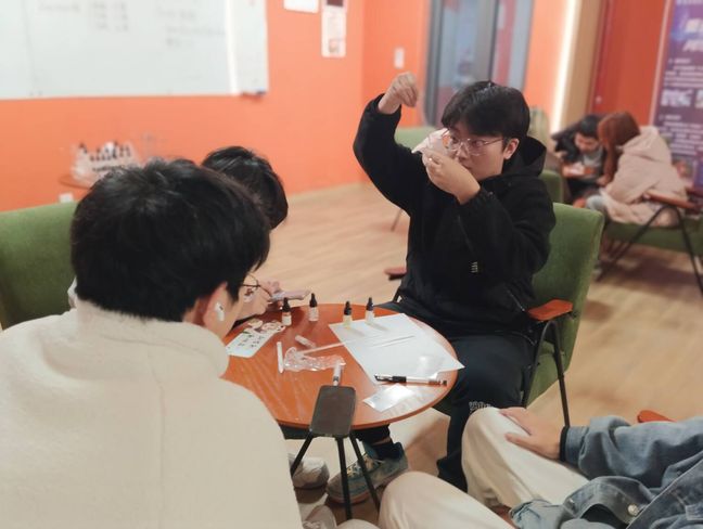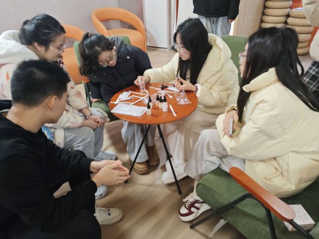 活动现场,多款香料和调香工具整齐摆放,清淡的香气扑鼻而来,大家在轻松愉悦的氛围中,开启了此次香氛美学之旅。老师向参与者们展示了各式各样的香料,并详尽地介绍了它们的特性、香型以及香水制作的具体步骤。参与者们纷纷化身为“调香师”,凭借对香气的独特感知和个人创意,精心挑选并调和各种香料,调制出了属于自己的独特香水。现场气氛认真而专注,空气中弥漫着丰富多变的香味,仿佛置身于一个充满无限可能的创意空间。