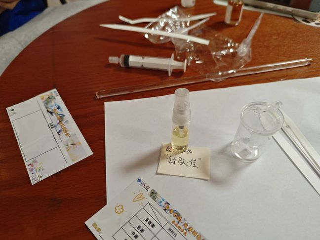 完成调香后,大家将自己精心调配的香水缓缓注入精致的香水瓶中,并在小卡片上细心地记录下团队名称与独一无二的香水配方。活动进行中,参与者们相互交流品鉴,从香调的和谐性、独特韵味等多个角度进行评价,分享彼此的香水创作灵感与心得。