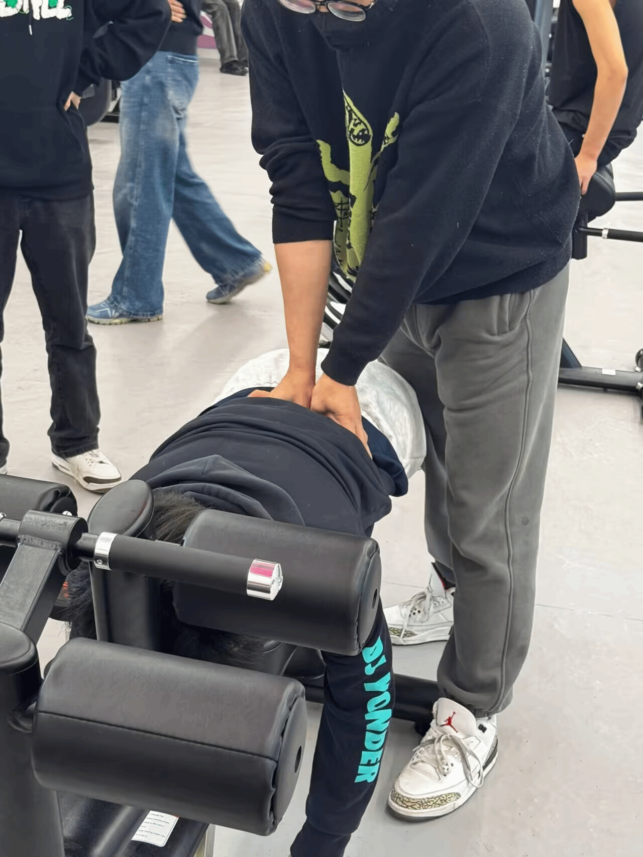 在课程中,另一位指导老师因近期高强度比赛而肌肉紧张,张老师借此机会为其进行现场按摩放松示范。同学们围聚一旁,仔细观察张老师如何精准找到肌肉紧张点,并运用专业按摩手法有效缓解肌肉紧张。张老师同时讲解了运动后正确放松肌群的重要性,他指出:“合理的放松是健身过程中不可或缺的环节,它能够帮助同学们避免运动损伤,提高健身效果。”