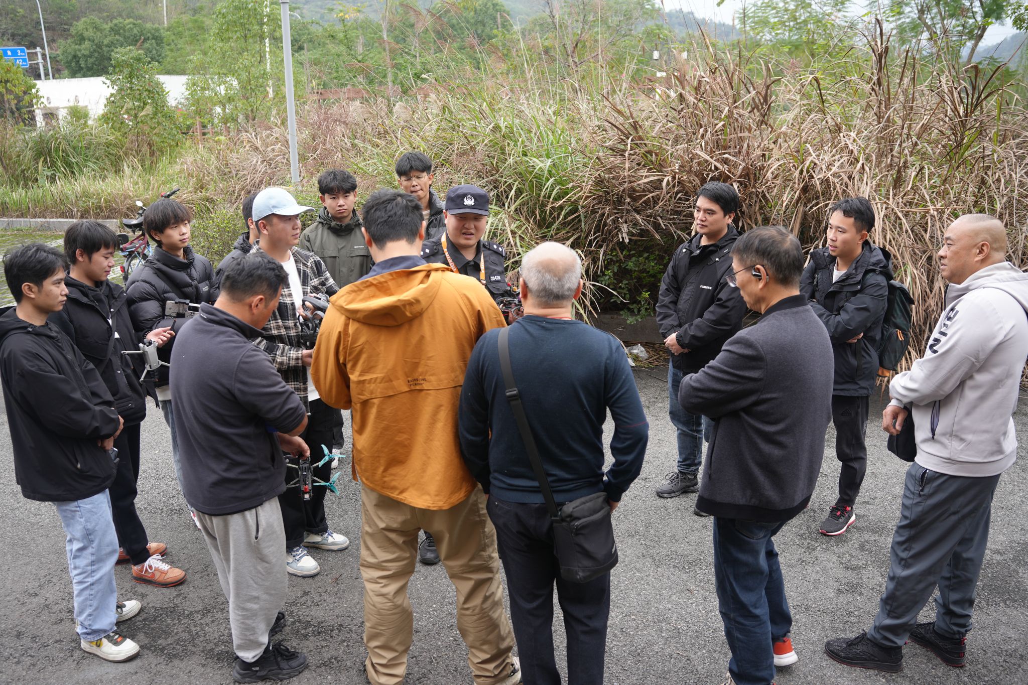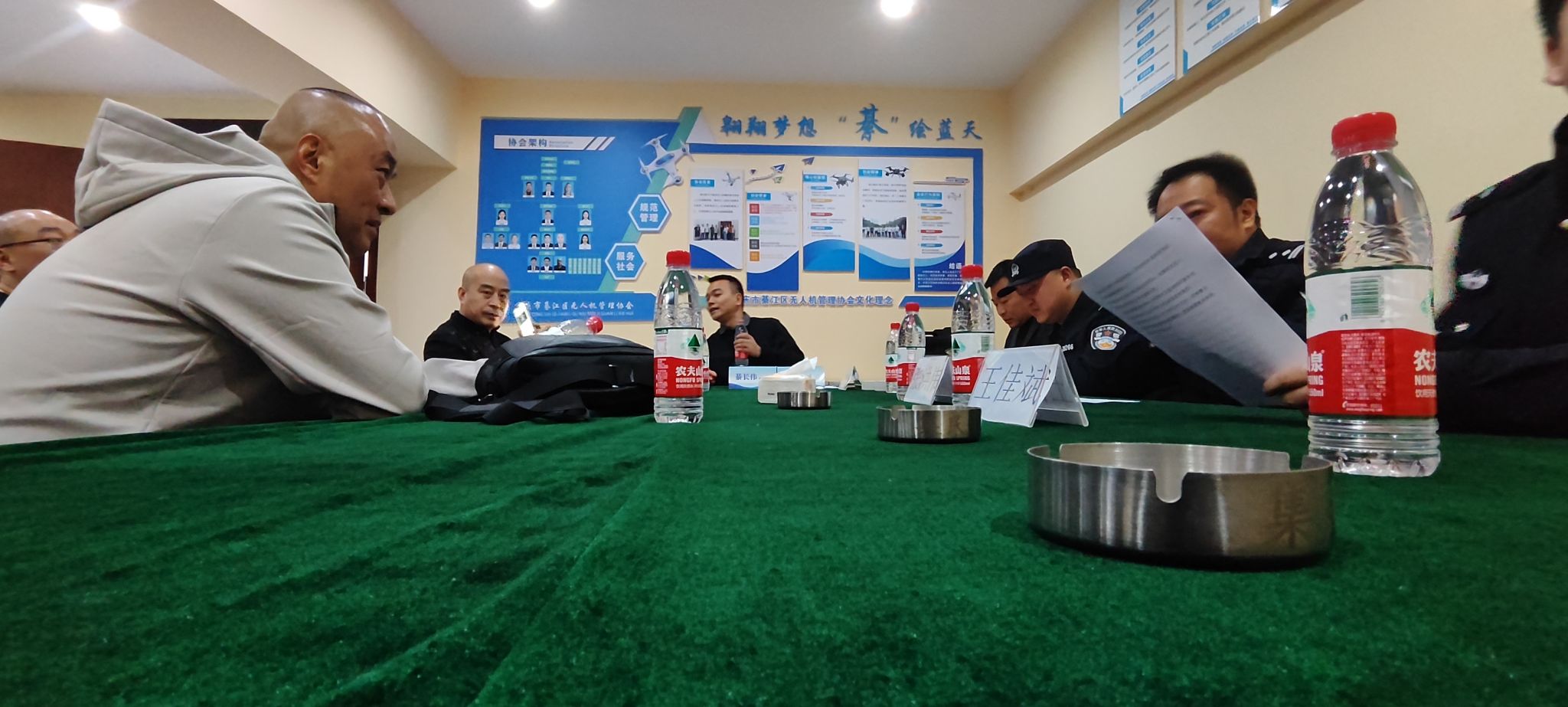 活动开始前,宋洋老师与工坊校外指导老师:綦江区无人机协会的负责人綦长伟老师,綦江公安局无人机大队三位警官,在綦江区无人机协会基地,进行了简短而亲切的交流会面。会议中,公安局关于近期綦江区“黑飞”事件通报,并在深入开展新时代低空经济,并就新形势进一步规范无人机合法合规飞行作出了指示,协会对自身工作发展进行了梳理与展望,校工坊分享了工坊的学习成果以及未来的发展方向,并表达了对无人机技术深入研究的决心和期待。公安局领导与协会会长对学生们的学习热情和探索精神给予了高度评价,并提出了进一步深入合作的期望。