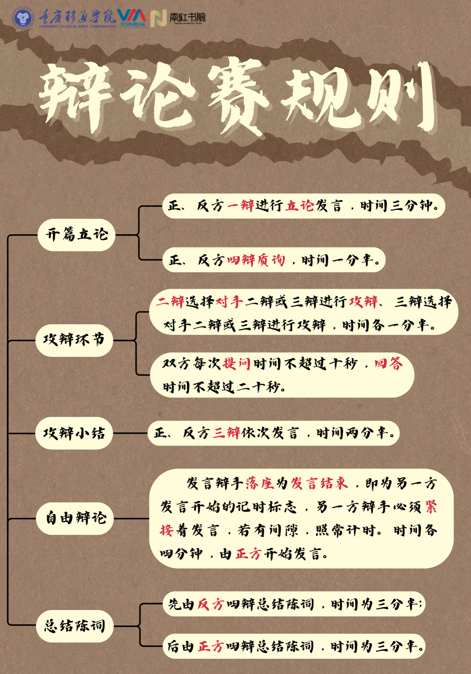 辩论赛正赛采取“4v4”团体辩论赛形式,每场辩论赛具体环节由开篇立论、攻辩环节、攻辩小结、自由辩论、总结陈词五个环节组成。
