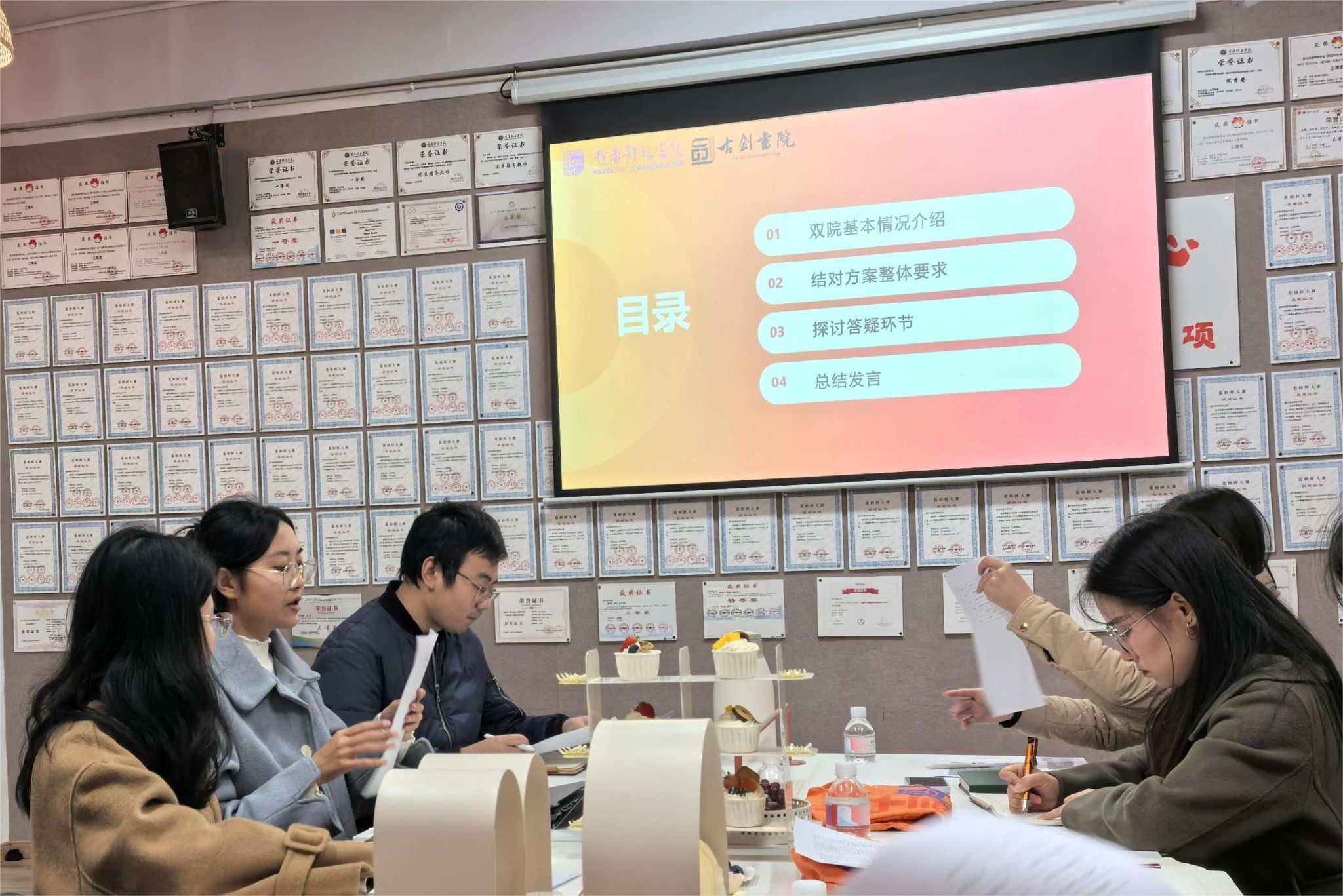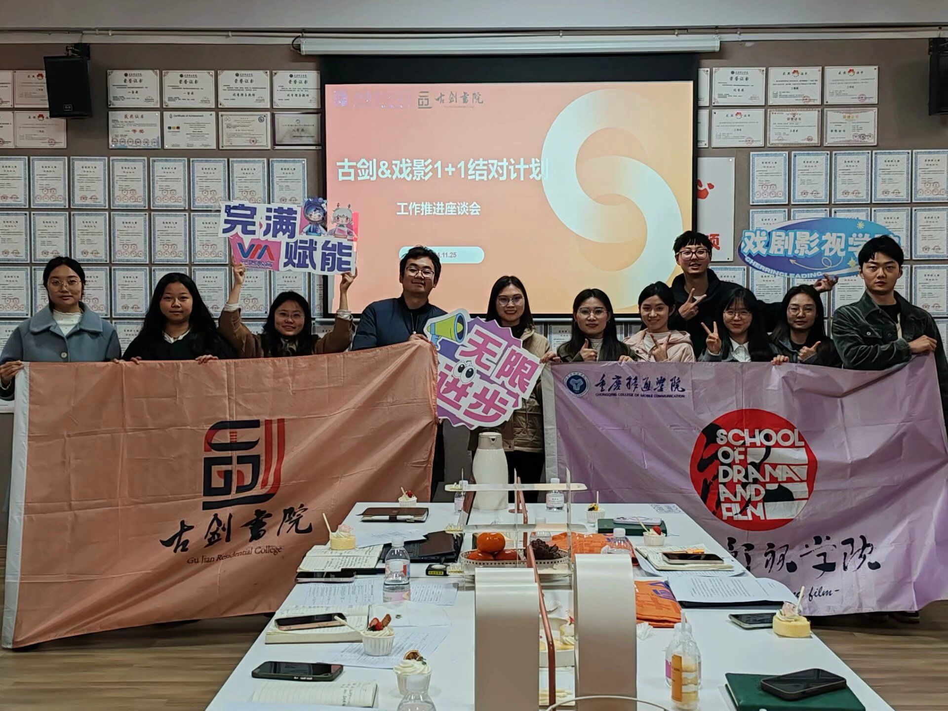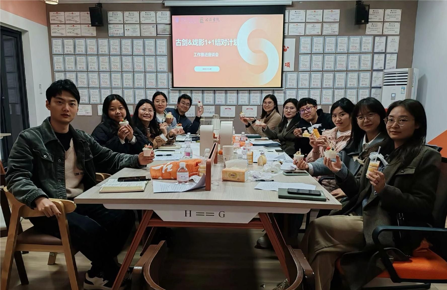 2024年11月25日,在GJ105棠溪·砚友有梗屋内,古剑书院教师团队与戏剧影视学院学工团队齐聚一堂,共同参加了双院融合工作推进座谈会。此次会议旨在通过深入交流,明确双方合作的基础与方向,为未来的合作奠定坚实基础。