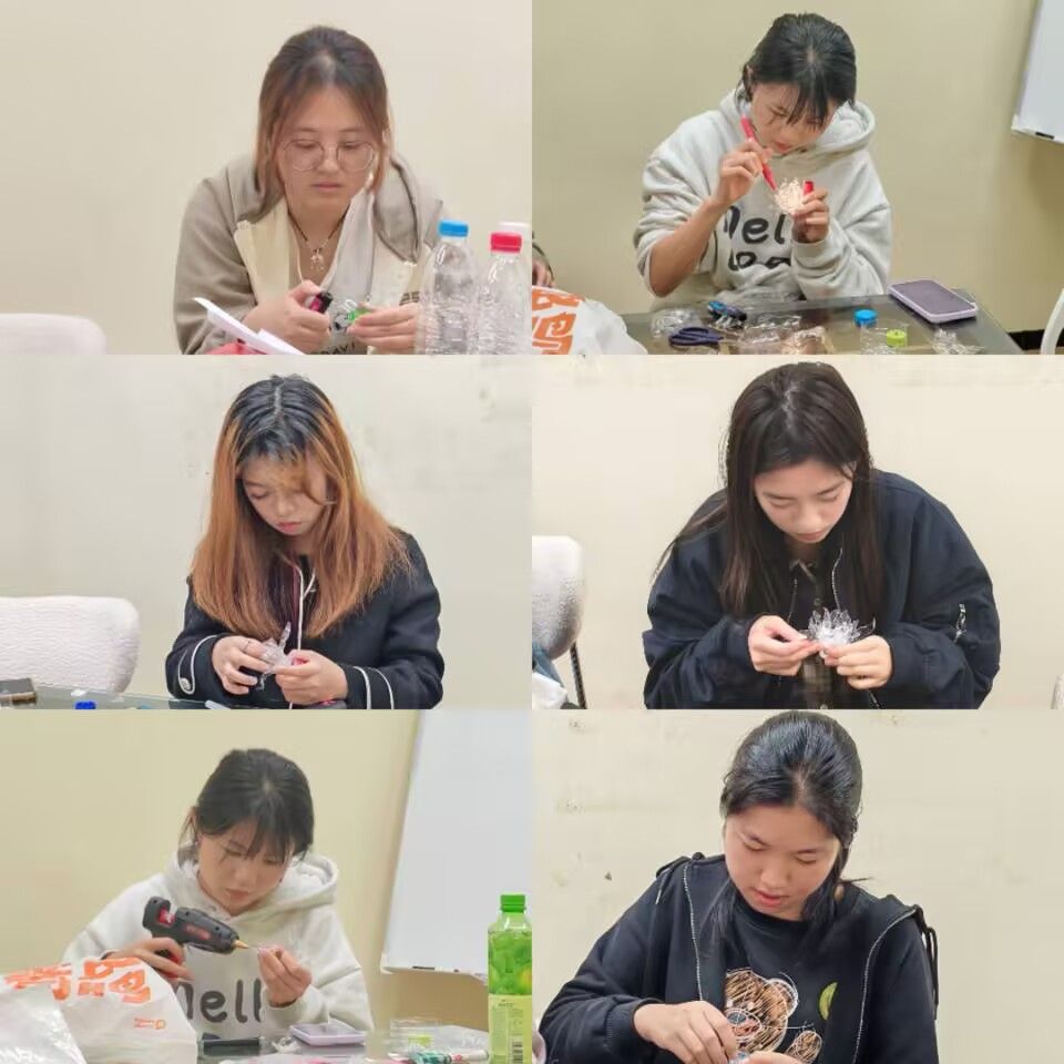 活动现场,学生们沉浸在制作塑料花灯的过程中,每一个步骤都显得格外用心。他们手持剪刀,小心翼翼地剪开塑料瓶,用铅笔在塑料上轻轻画出花瓣的大致形状和布局,剪下花瓣形的塑料片,用打火机烧热形成花瓣状轮廓,用胶水将剪裁好的塑料片一点一点粘合在一起。