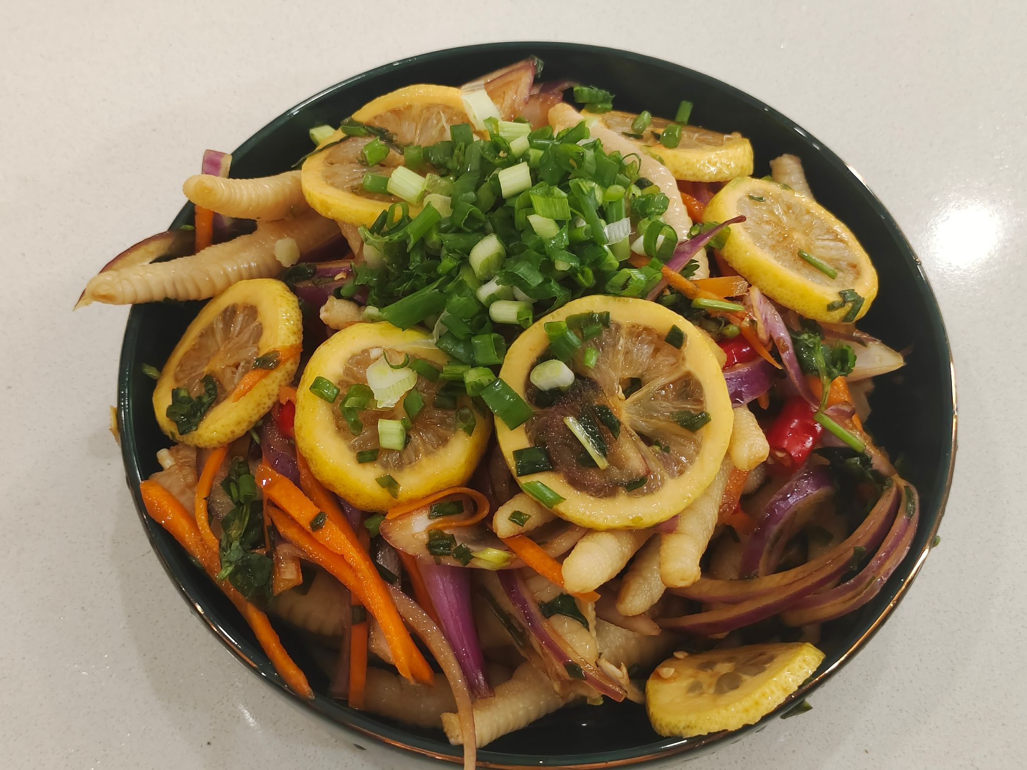 浸满调料的手舂鸡爪色泽诱人,酸辣香甜,层次感丰富,柠檬的酸甜清香,遇上小米椒的火辣,凤爪皮脆,筋道弹牙,骨香入味,简直就是一场味蕾的盛宴。