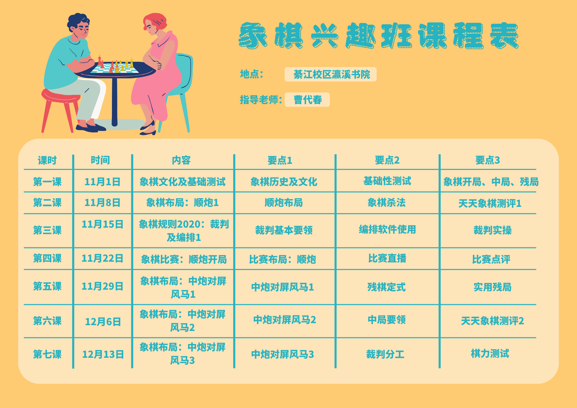棋类运动历经数千年的演变与发展,深受传统文化的浸润与影响,铸就了其独特的东方文化印记。为加强棋类文化的宣传普及和棋类运动的深远影响,打造积极向上的棋类文化氛围,培养一批高水平棋艺类人才,推动棋类人才培养路径和模式向未来工作靠近,启迪智慧、陶冶情操,同时锻炼学生立足当下、着眼未来的思维方式,塑造并提升移通学子的全局思维和前瞻眼光,促进参与者在棋类活动的学习和实践中增进知识、享受乐趣,瀛溪书院和弈秋棋社通过联合綦江区三大棋协,于11月1日在瀛溪书院YX333非正式空间和YX111语者演讲培训室,举办了“棋行妙手,弈棋成长”——高校棋类课程班活动,并于每周五照常开展。