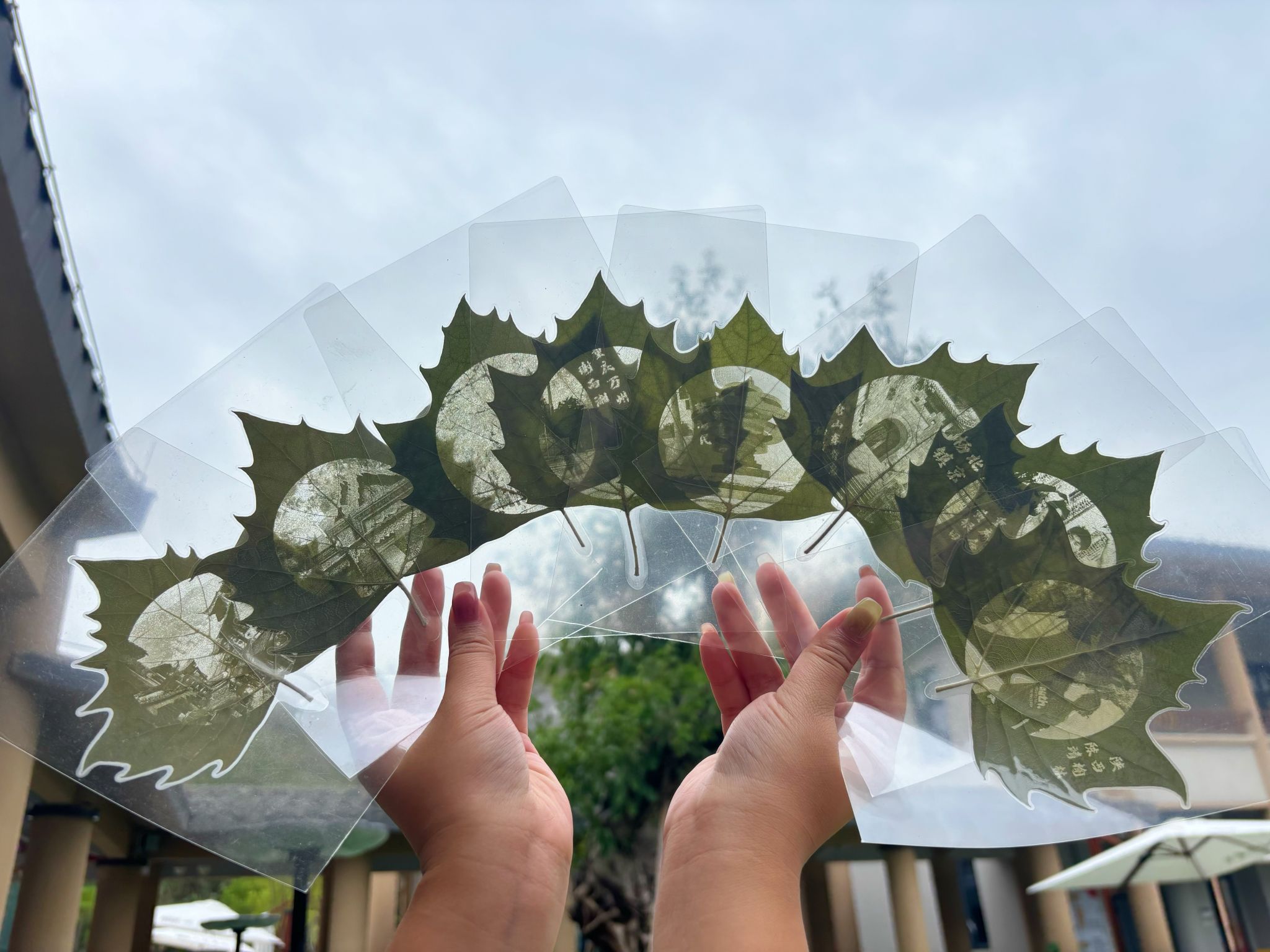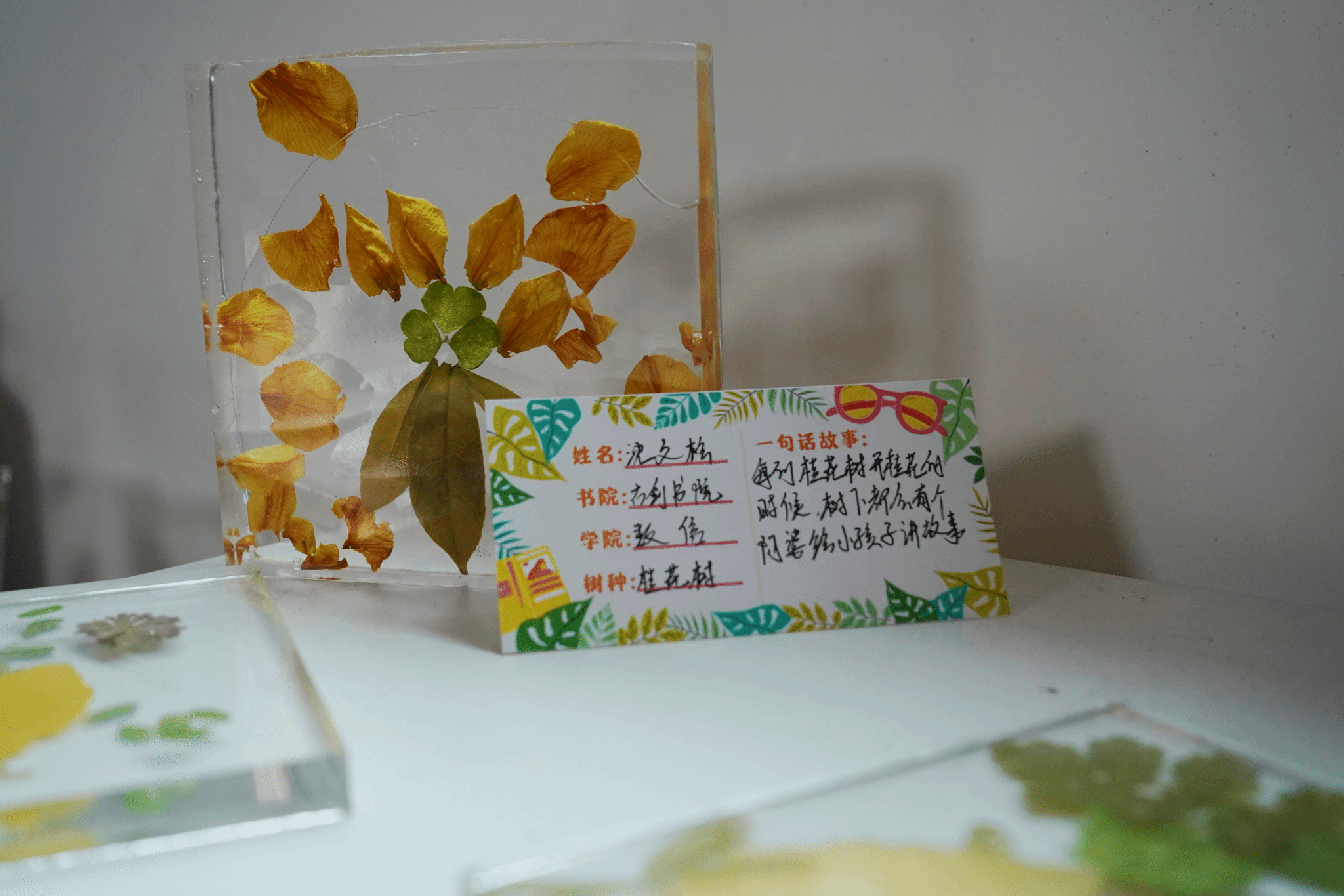古剑书院为学子们准备好滴胶和模具,引导他们将家乡的叶片转化为滴胶艺术品,并写下自己与家乡叶的故事,用滴胶将这段家乡记忆封存,展示在家乡的文化展示区中。有的学子在叶上绘制自己的名字,以此与家乡紧密相连。