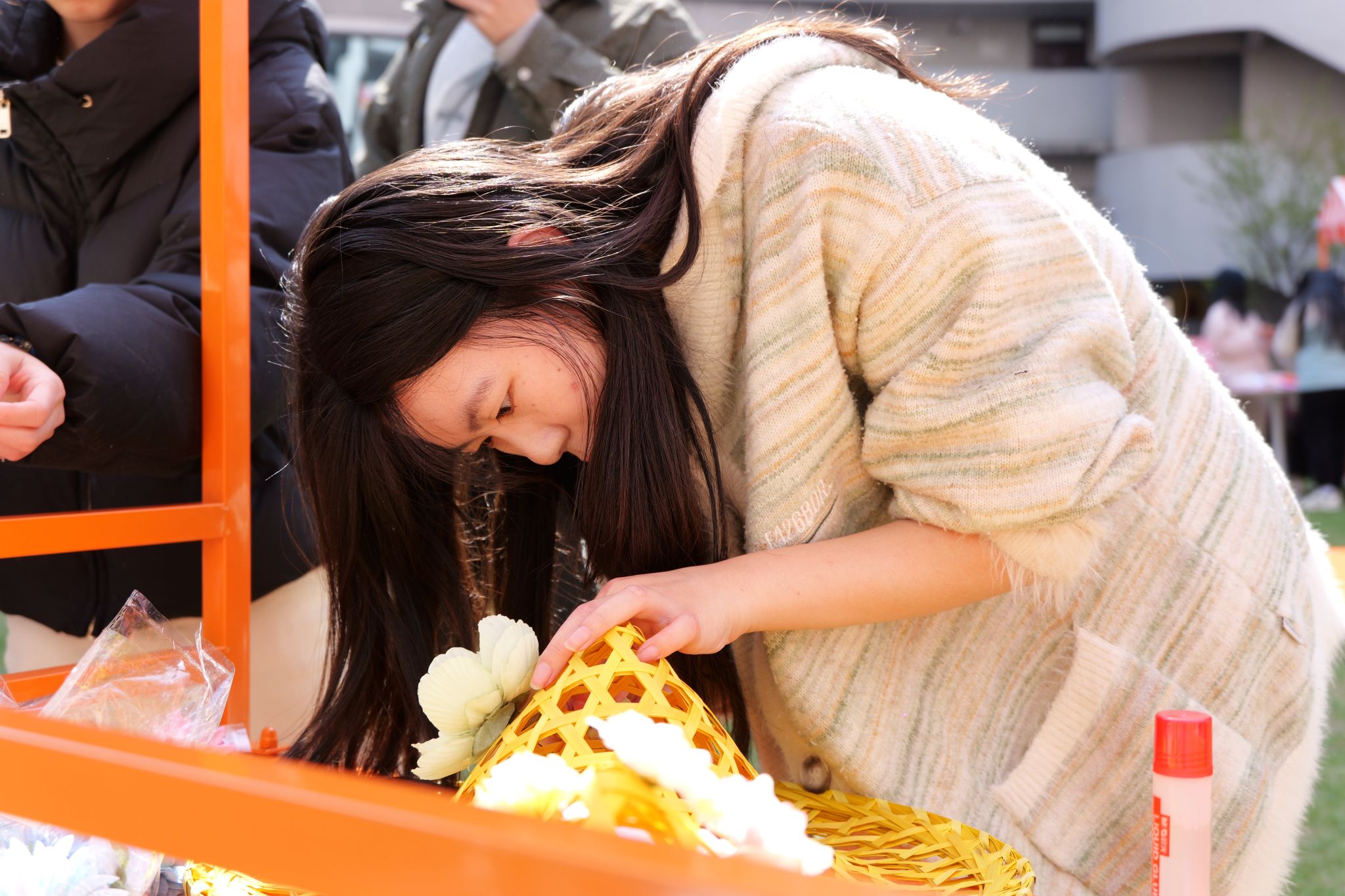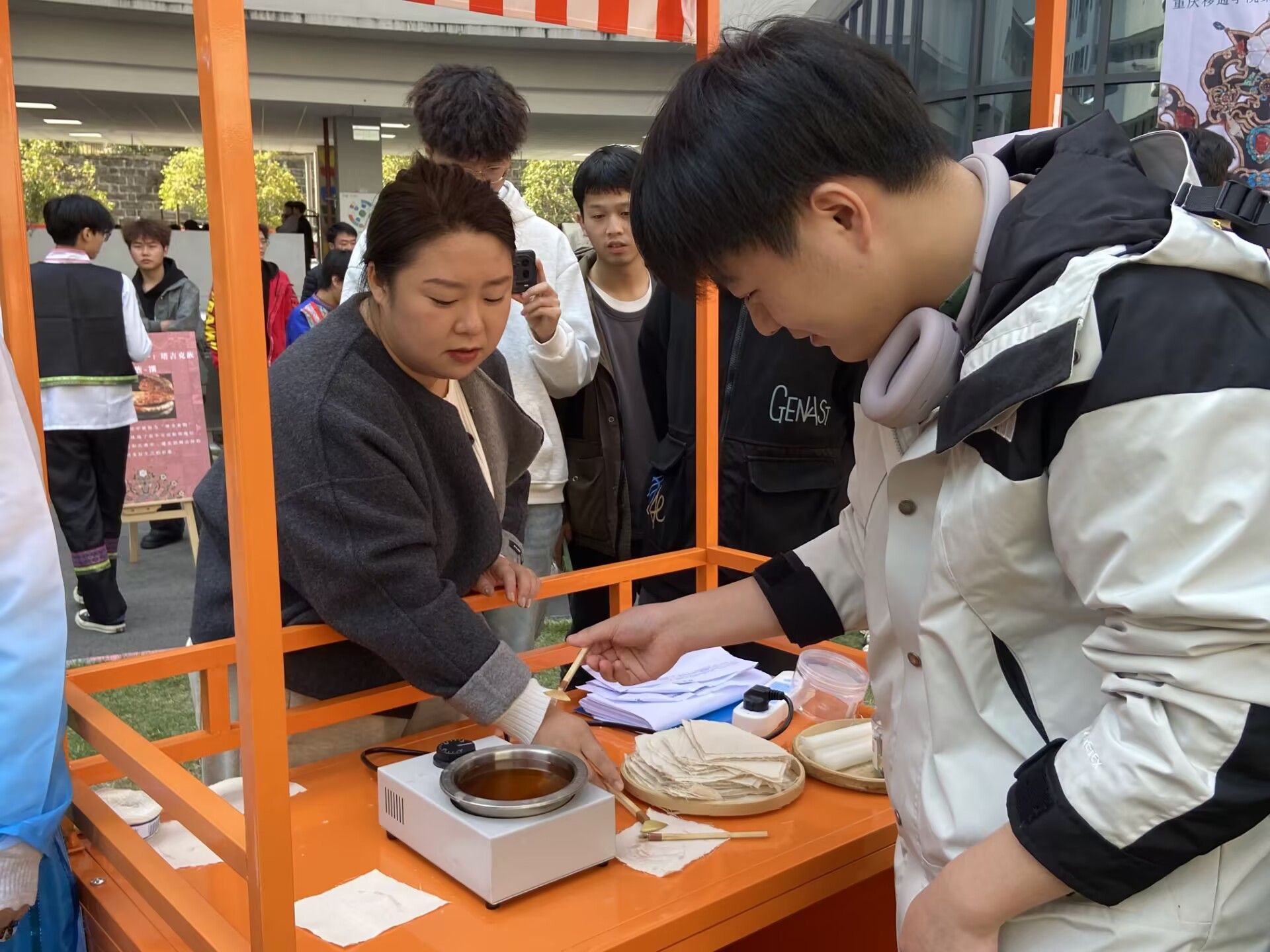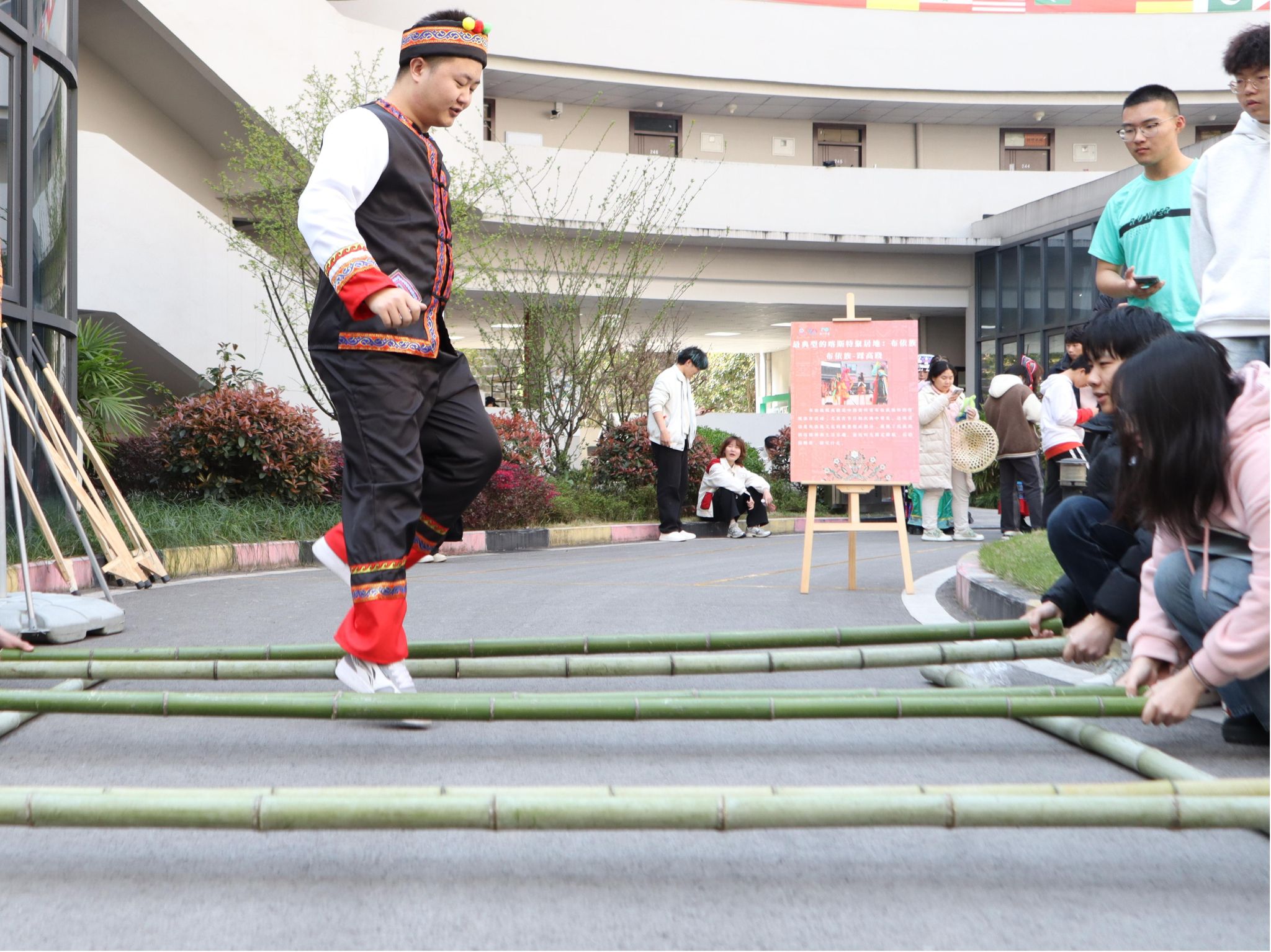 学子们参与到布依族踩高跷、壮族跳竹竿、珞巴族射箭等特色活动中。在跳竹竿互动区,师生们随着节奏轻快的竹竿敲击声,体验了壮族传统舞蹈的韵律与活力。七大手工体验项目成为文化传承的生动课堂——苗族蜡染的蓝白交织、毛南族花竹帽的精细编织、赫哲族鱼皮画的独特工艺,吸引了众多学生驻足尝试;在藏族面具彩绘与黎族藤编摊位前,学子们亲手触摸文化的脉络,将传统技艺与现代创意相结合,赋予古老文化新的生命力。