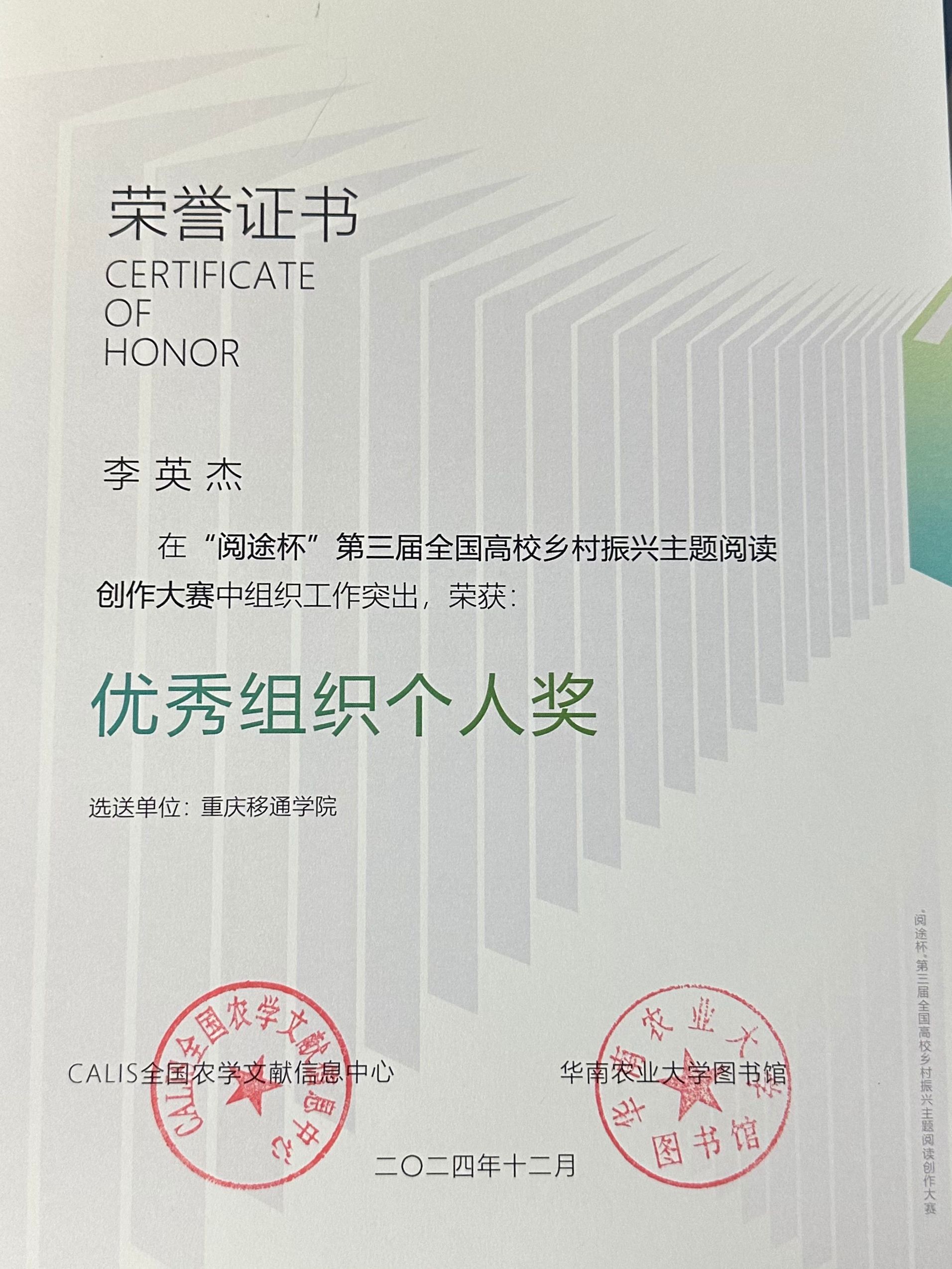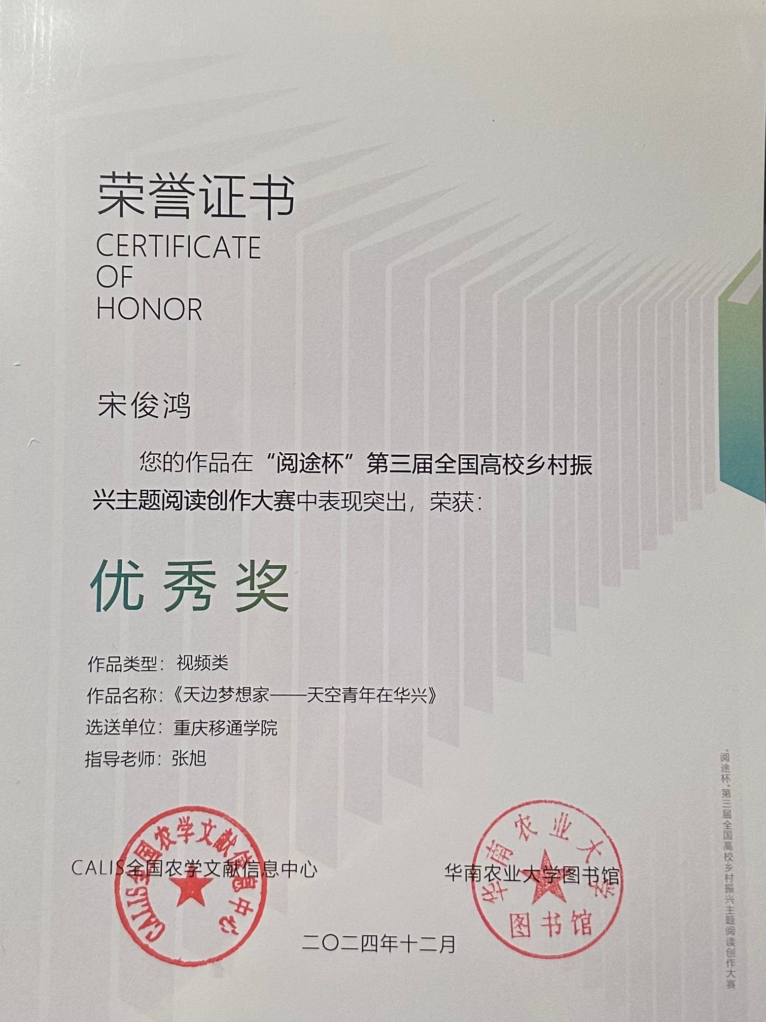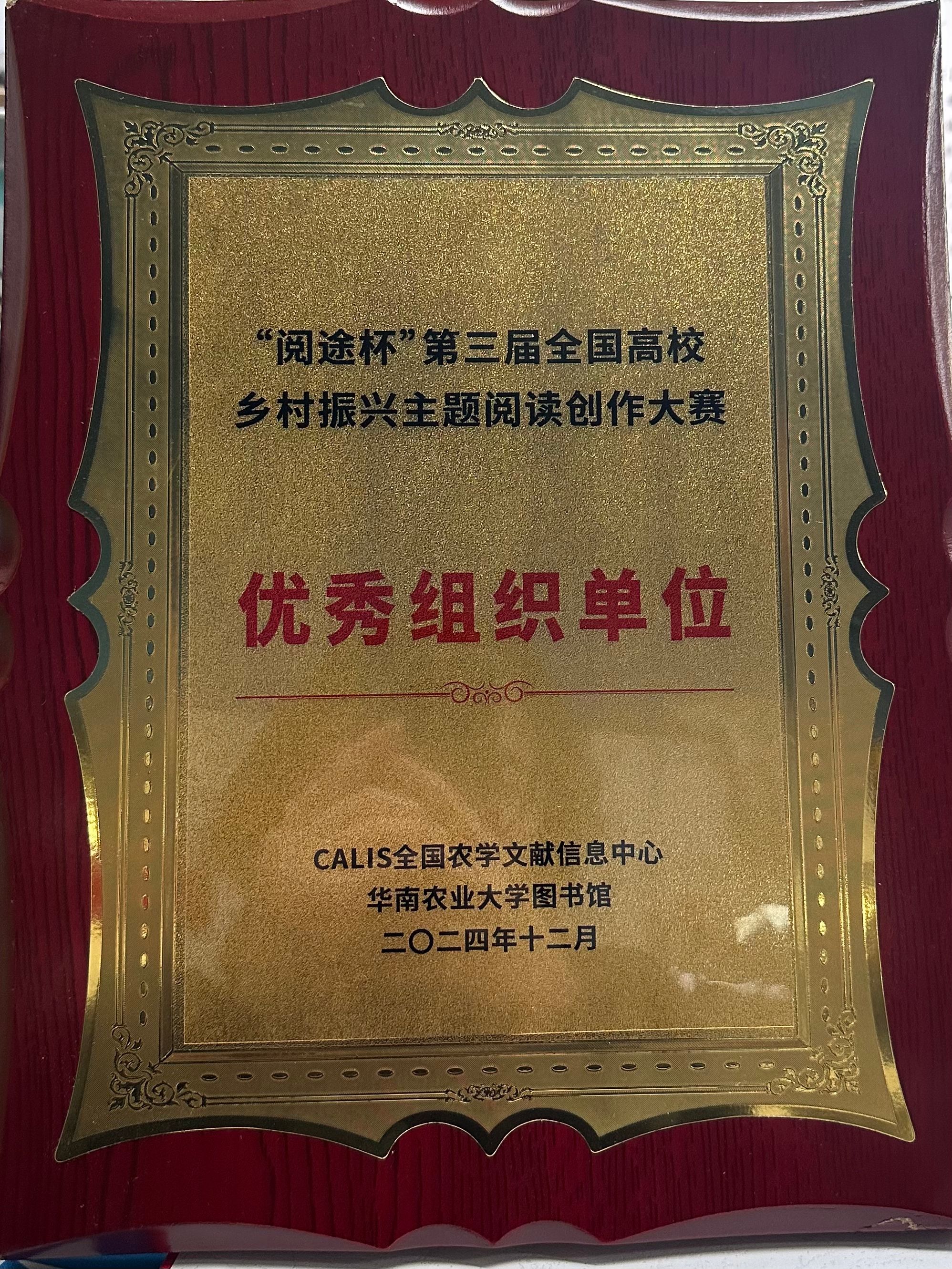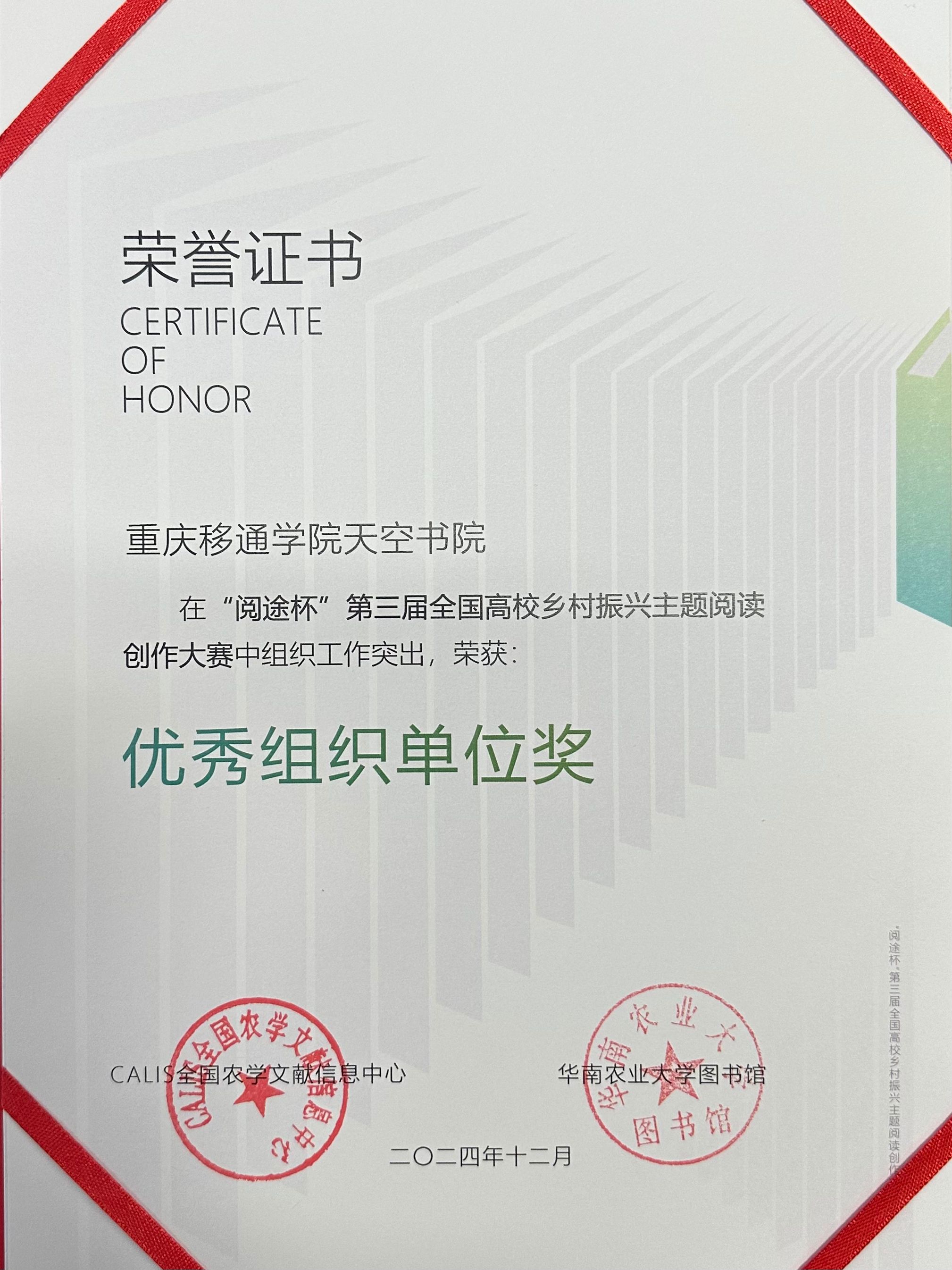 为全面贯彻落实党的二十大和二十届二中全会精神,深入贯彻落实习近平总书记关于“三农”工作重要论述,CALIS全国农学文献信息中心、华南农业大学举办“阅途杯”第三届全国高校乡村振兴主题阅读创作大赛。天空书院结合2024暑期“三下乡”社会实践活动,指导团队成员将实践素材与赛事主题融合创作,积极投稿参与此次大赛,自大赛启动后至2024年9月20日,共吸引了中国农业大学、华中科技大学、西南政法大学等全国183个高校参与组织,经过严格审核天空书院选送作品《天边梦想家——天空青年在华兴》获视频类优秀奖,天空书院获“优秀组织单位”称号,李英杰、张旭获“优秀组织个人奖”。