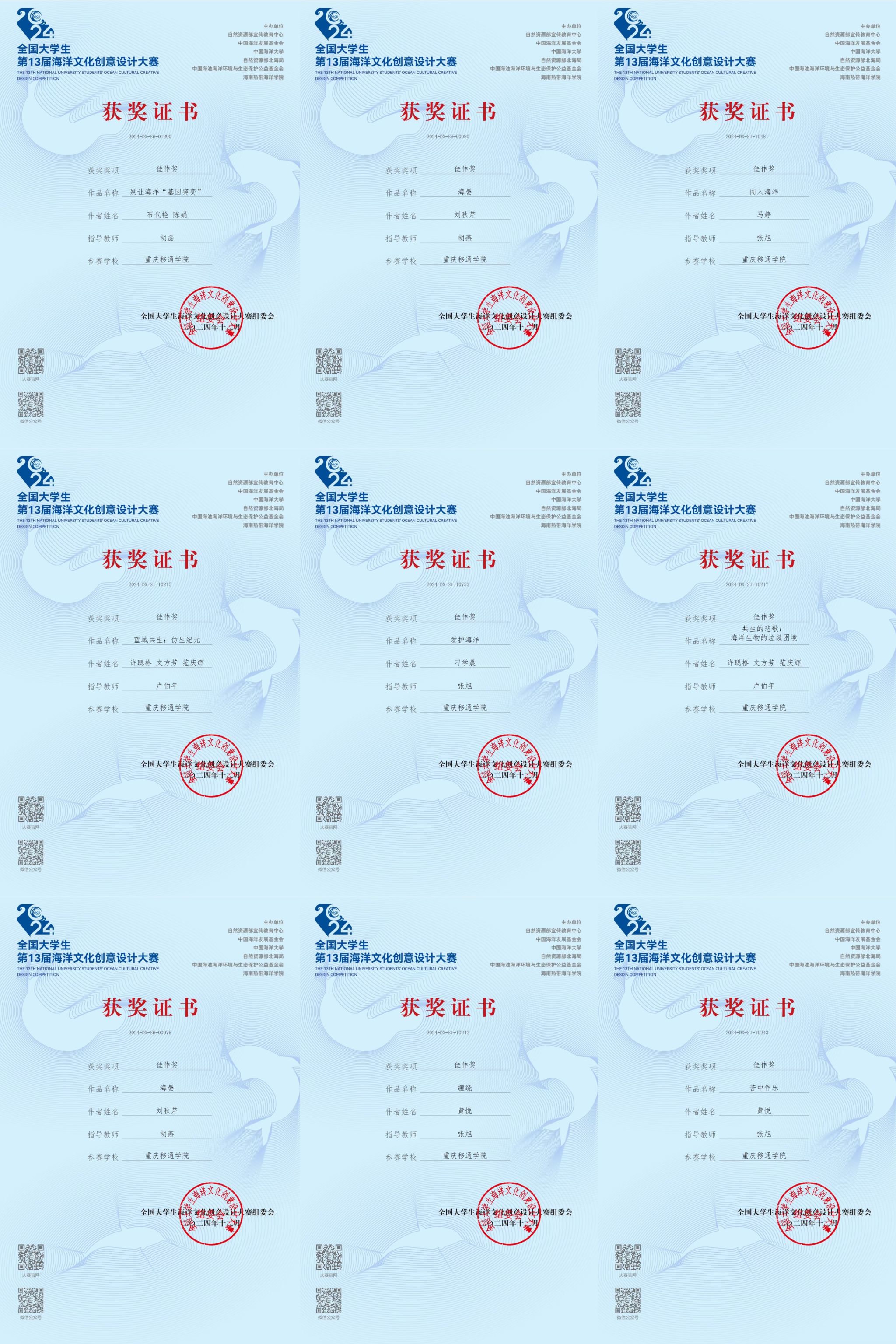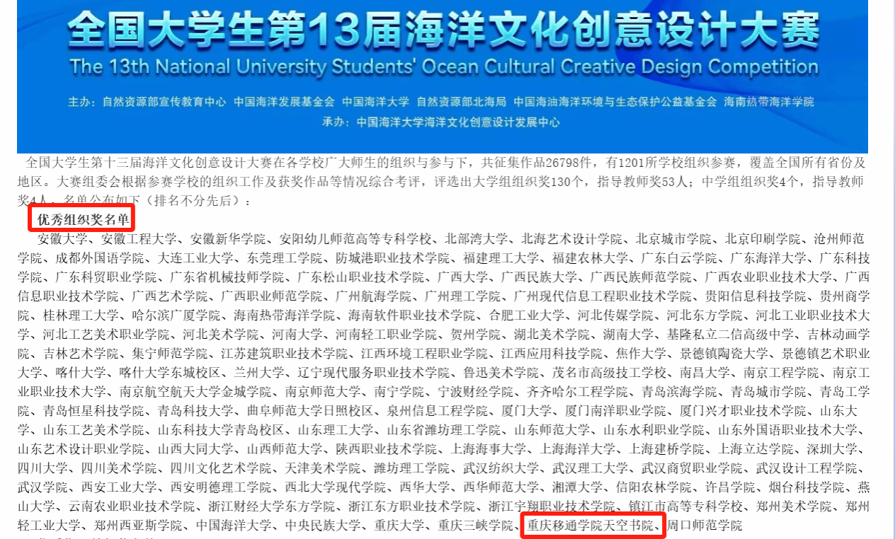 为积极响应国家发展海洋强国的战略号召,推动海洋文化的创新与发展,提升移通学子的专业素养与实践能力、促进双院融合,天空书院联动艺术传媒学院积极推动由自然资源部宣传教育中心,中国海洋发展基金会等单位联合开展的第十三届全国海洋文化创意大赛在我校实践落地,立足“描绘,精研,博闻”的培养基点,以“海洋·共生·未来”为主题,培养学子想象力。天空书院选送海报设计、视频、还包含AIGC、动画、IP设计、UI界面设计、文创、插画绘本等90余件参赛作品,最终14件视觉传达类作品和1件AIGC作品从全国26798件投稿中脱颖而出获“佳作奖”,天空书院获“优秀组织单位”称号。