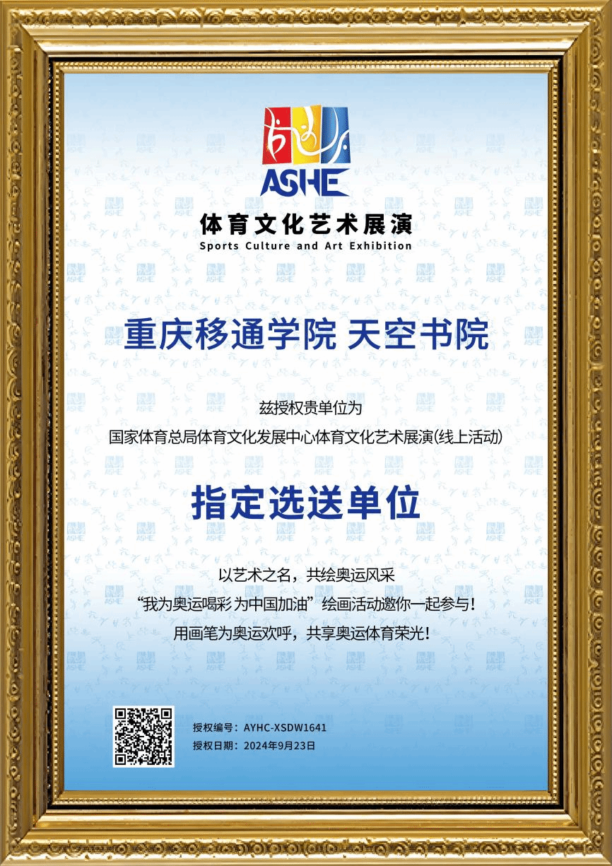 为进一步发挥文化的育人功能,弘扬中华体育精神,国家体育总局体育文化发展中心开展2024体育文化艺术展演项目。联动全国优质运营单位,以“体育+文化+艺术”融合发展模式为引领,搭建体育文化艺术交流共享平台。天空书院依托写意天空系列活动,链接名誉院长优质资源,积极申报本次文化艺术展演线上活动,并被国家体育总局文化发展中心认定“指定选送单位”,本次活动在天空书院名誉院长指导下创作出一批优秀的书画作品。