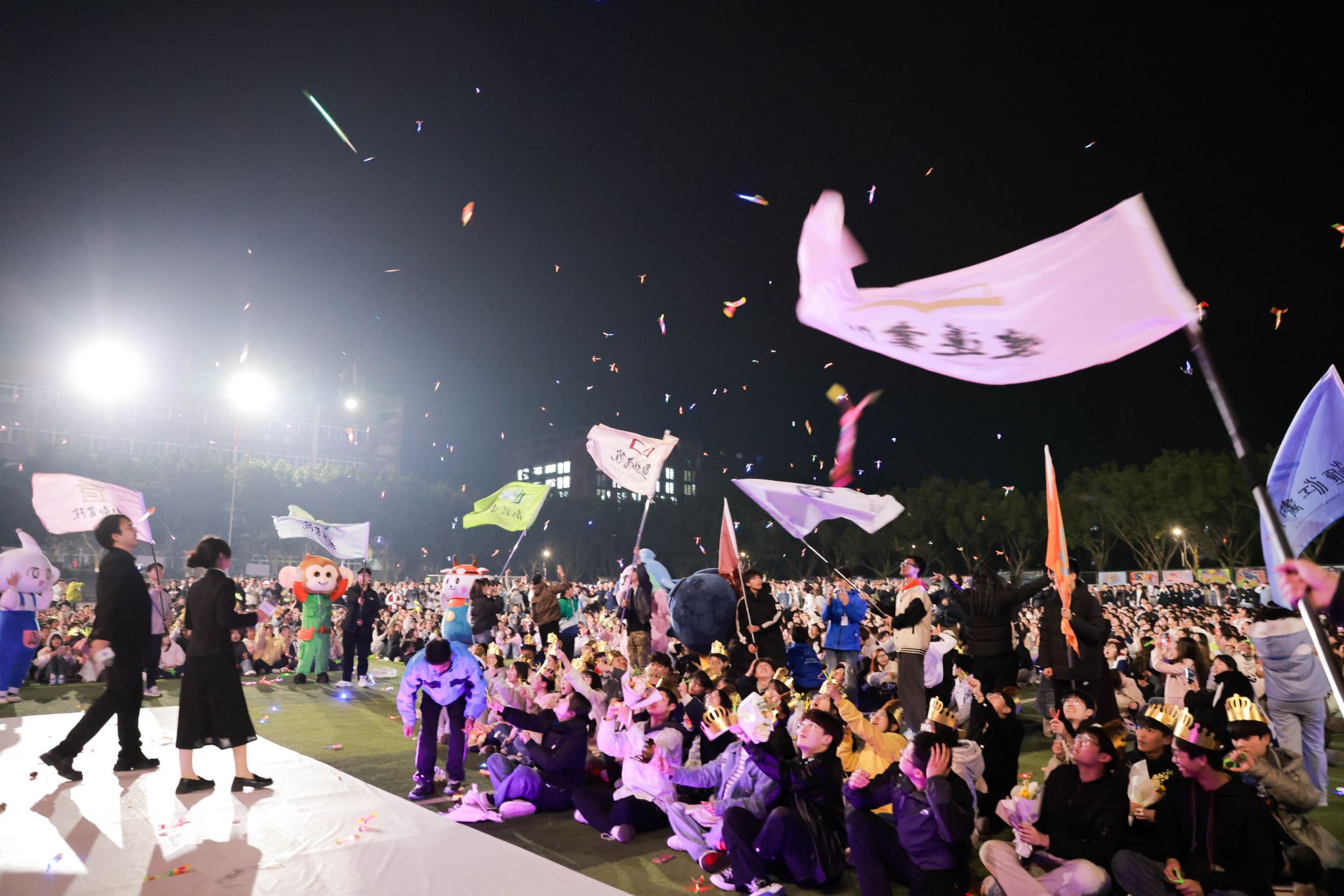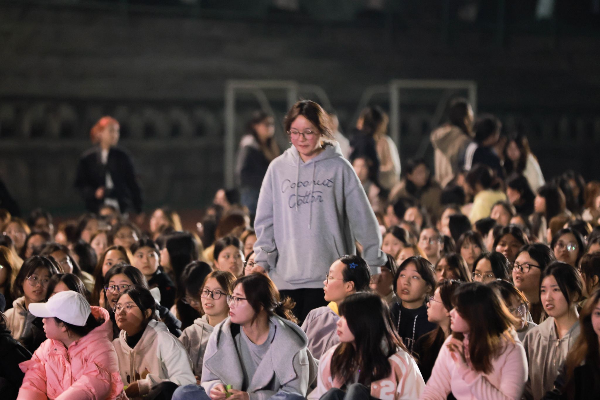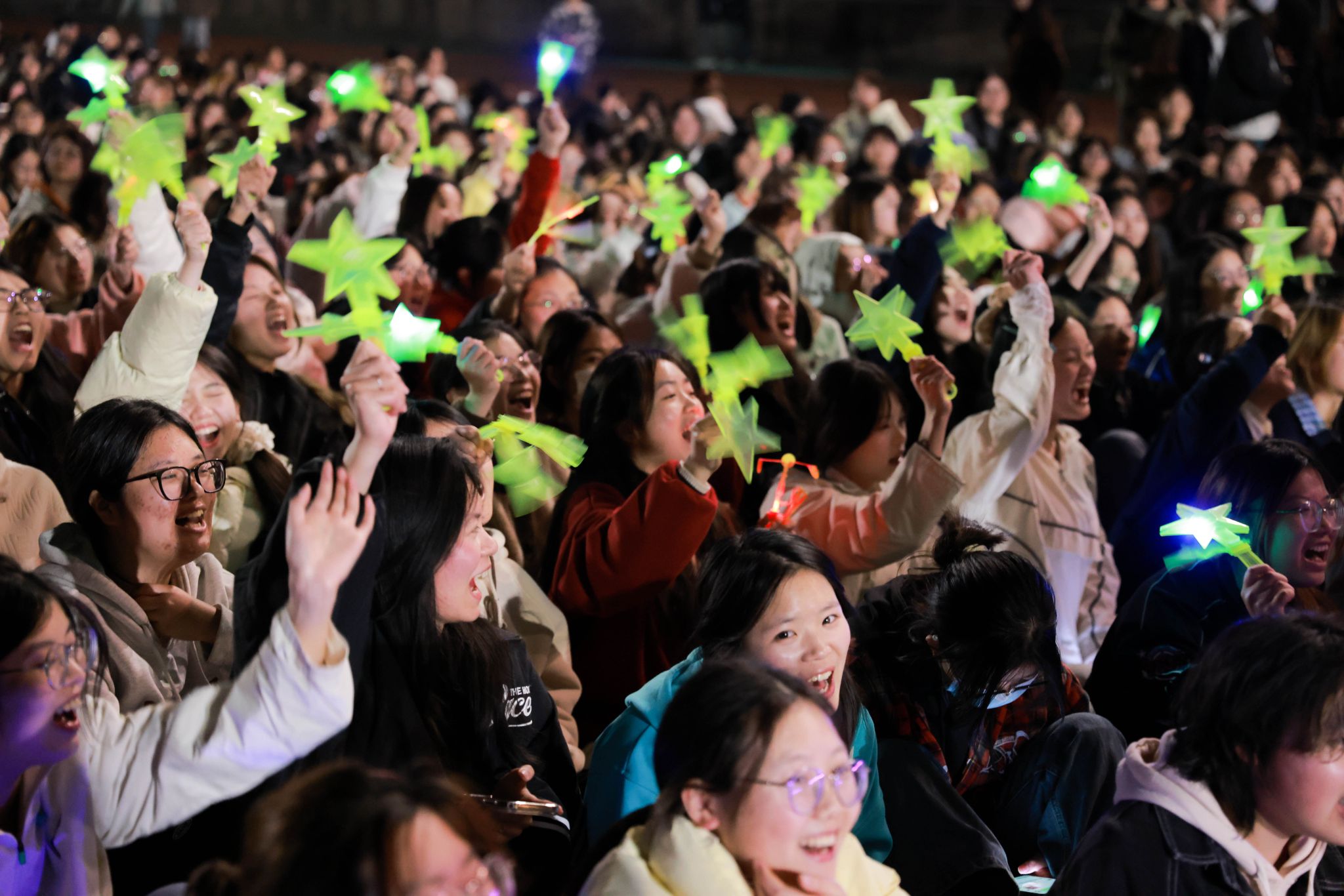 各书院萌力全开的吉祥物团队突然从观众席“空降”现场,与五千余名师生展开热情互动,当特制的星空糖果与飞天弹弓热闹分发时,此起彼伏的欢呼声瞬间点燃移通的夜空。随着《生日快乐》旋律响起,长达2米的“巨无霸”蛋糕在追光灯下缓缓登场,寿星们共点蜡烛,纷纷双手合十、闭目许愿、齐声祝福的瞬间,焰火直冲夜空,书院旗帜迎风狂舞,将氛围推向高潮。“对所有的烦恼说拜拜,对所有的快乐说嗨嗨,亲爱的亲爱的生日快乐,每一天都精彩”5000人的共唱生日歌堪比演唱会现场,当千余枚彩色弹弓载着愿望划破天际,有新生兴奋喊道:“这绝对是年度最酷的许愿方式!”