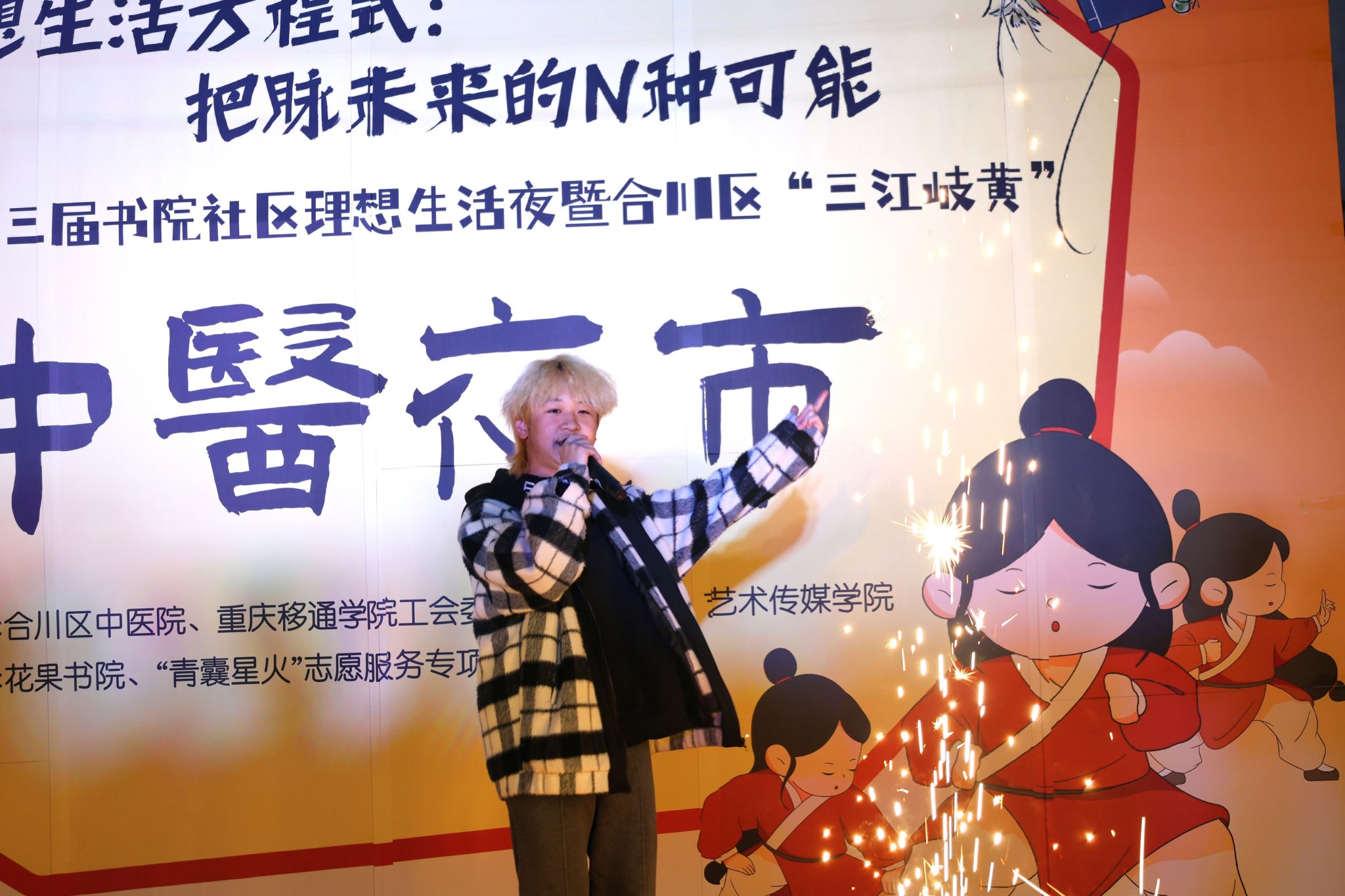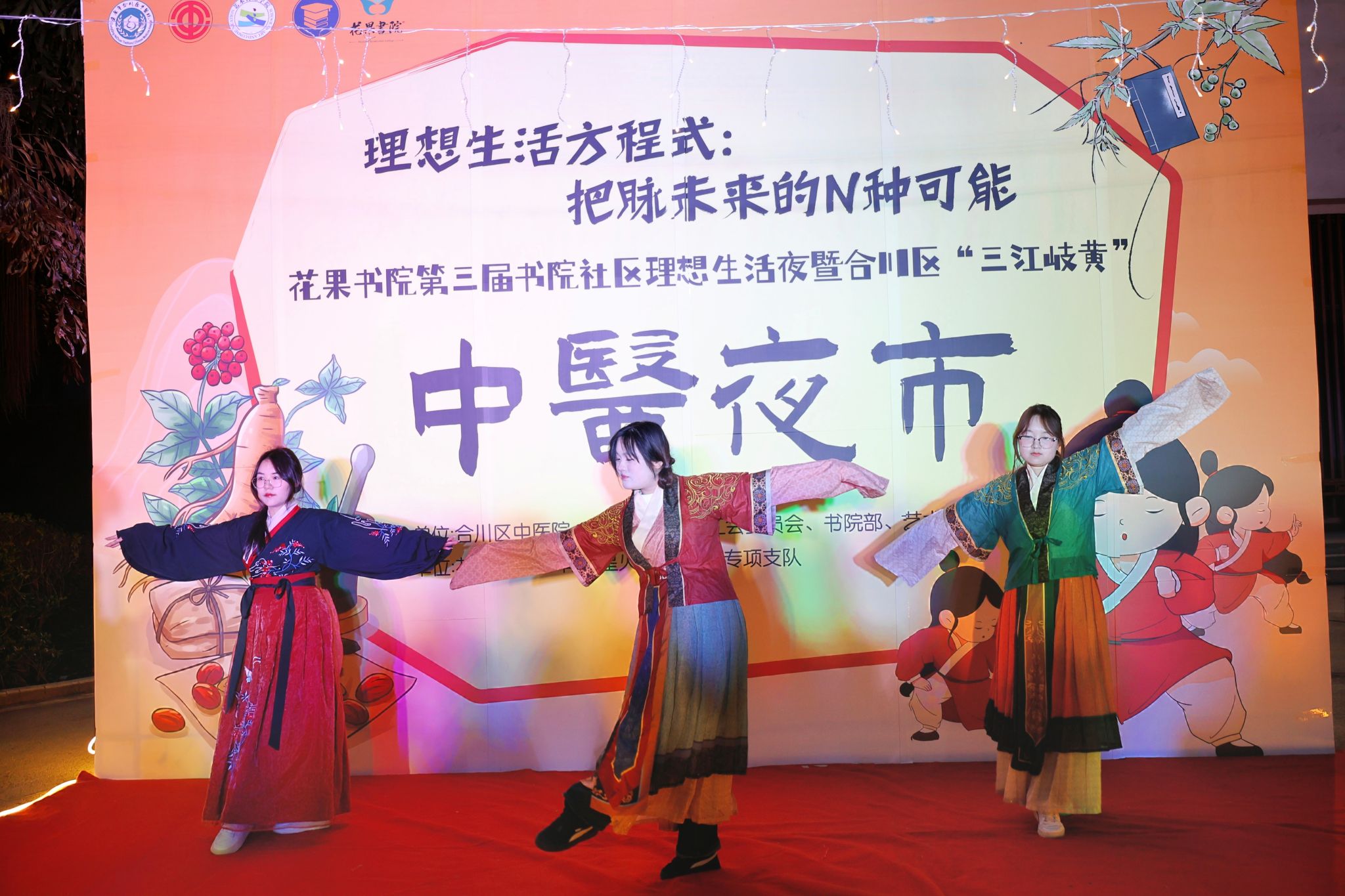 以快乐入药,唤醒你的生活能量场。合川中医院传统功法研习队以一段古韵悠长的八段锦拉开中医夜市的序幕,让千年养生智慧在书院广场焕发新生;杨静霄同学用《本草纲目》开启国潮remix模式,在“如果华佗再世”的音乐旋律中,潮流文化与传统中药文化碰撞出出新的火花;由舞蹈社带来的古风舞蹈《怎叹》与汉服社的同学们相映成趣,上演一幕跨越时空的东方美学,展现独属于书院社区的顶级中式浪漫。