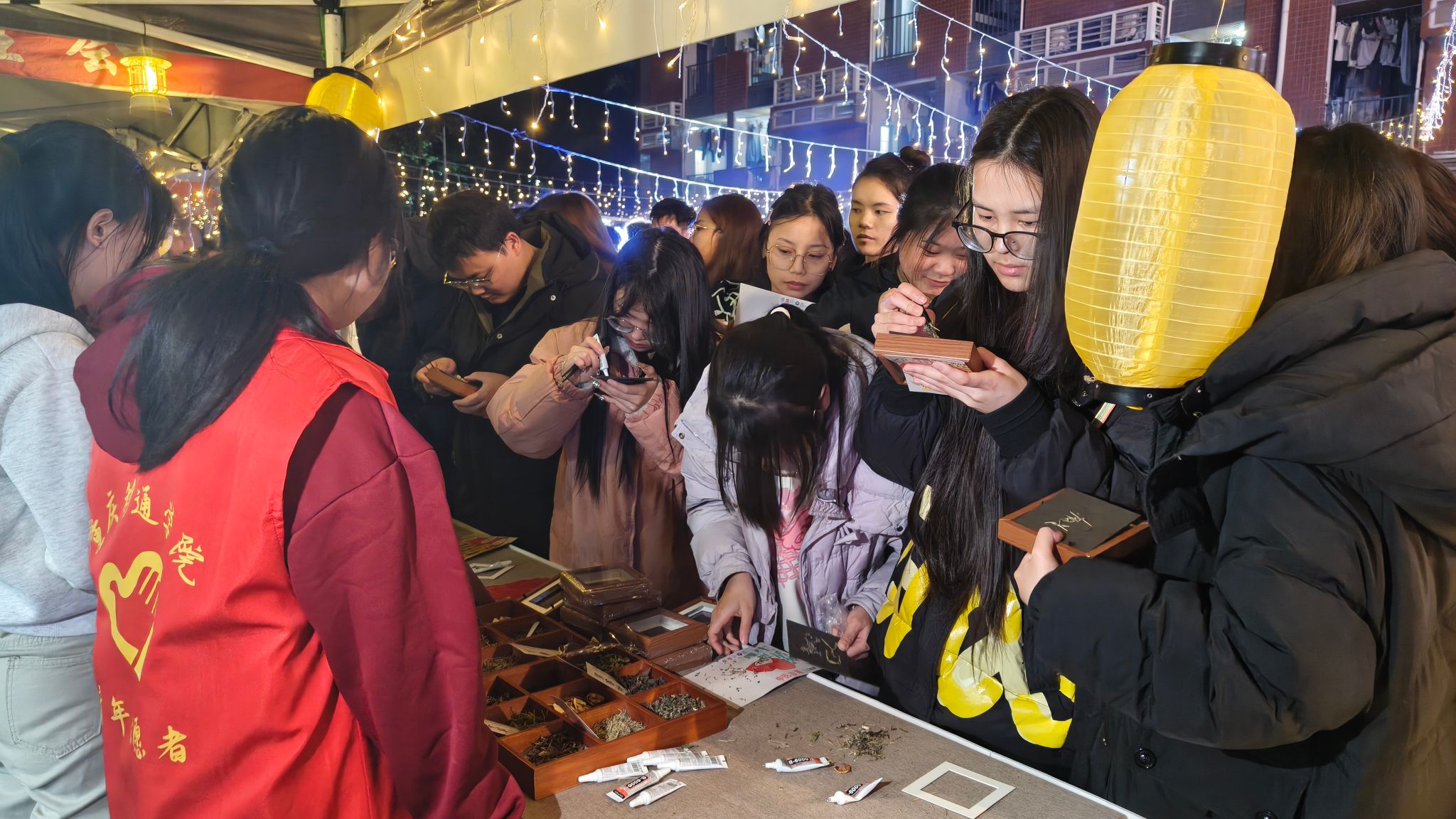 让本草智慧碰撞青春创意现场同学们利用枸杞、菊花等多种中药进行创意DIY,将中药的自然之美定格于相框之中;结合五行理论编织手环,在互动中探秘五色丝线背后相生相克的古老智慧;体验非遗香牌制作,按比例添加檀香、艾蒿等药材,亲手制作驱蚊安神的古法香牌;通过趣味飞镖,解锁随时随地可操作的按摩养生妙招。同时,中药材名与传统民间文化形式——谜语趣味融合,引发现场同学们热烈竞猜。将传统中医药智慧转化为可感知的生活美学,为中医药文化传播推广注入青春动能。