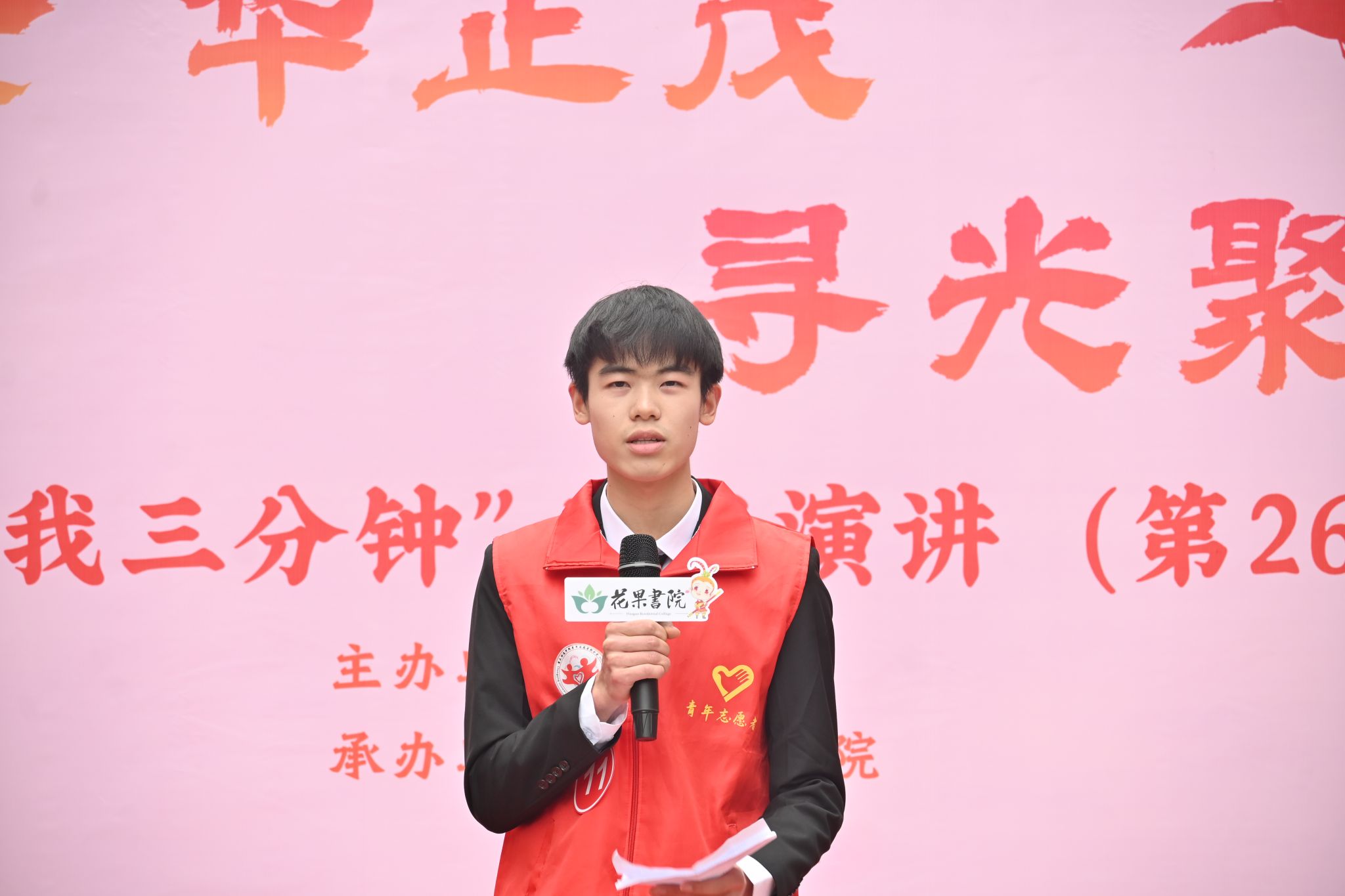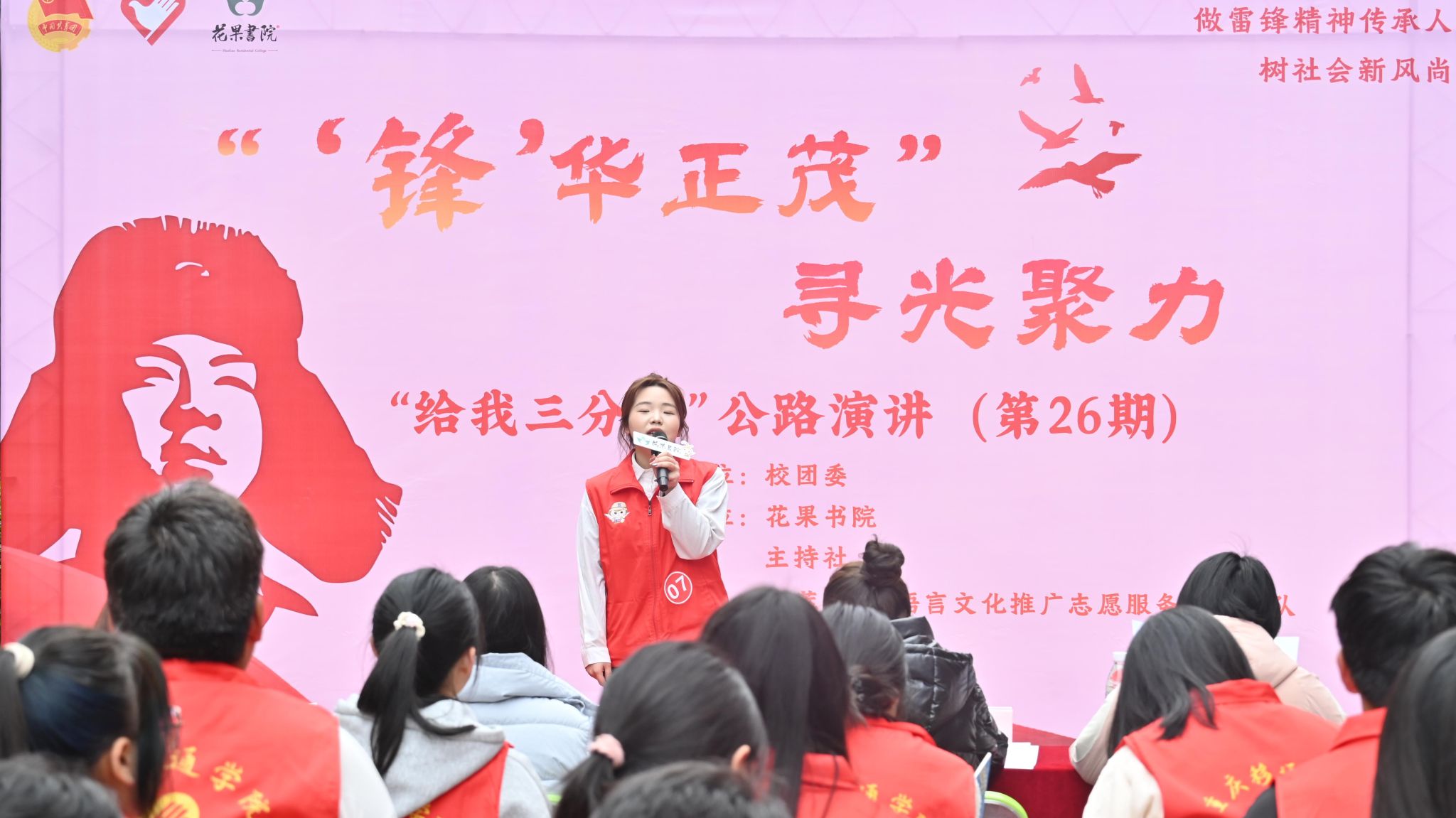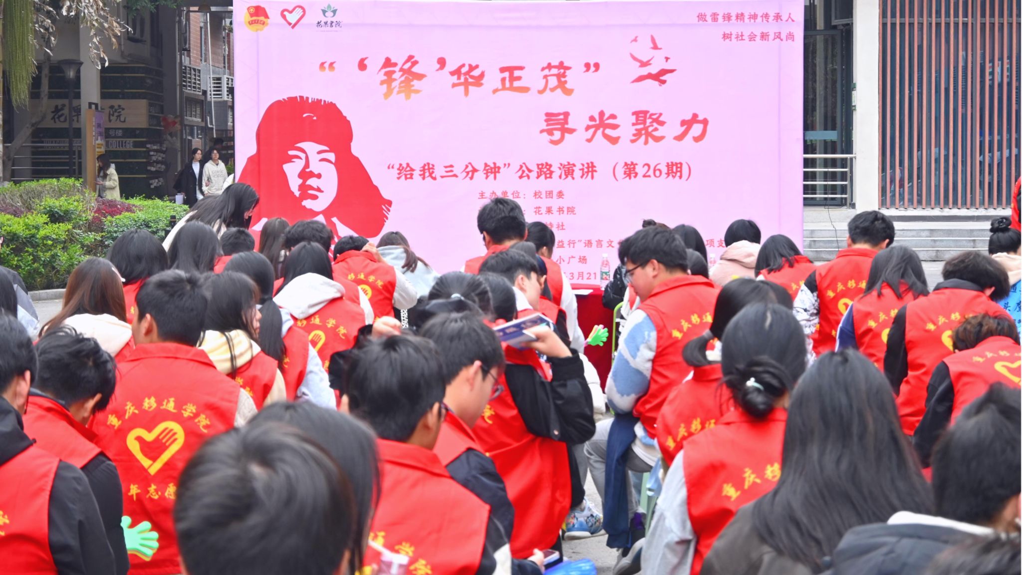 用三分钟丈量志愿情怀,以青年声音讲述雷锋故事。3月21日14:00,由校团委主办,花果书院、青年志愿者联合会承办,主持社、“语萃益行”语言文化推广志愿服务支队协办的“‘锋’华正茂·寻光聚力”——“给我三分钟”公路演讲活动在花果小广场圆满举行。来自全校范围的16名青年志愿者代表,用三分钟讲述他们的志愿服务故事,展现新时代移通青年对雷锋精神的深刻践行。
