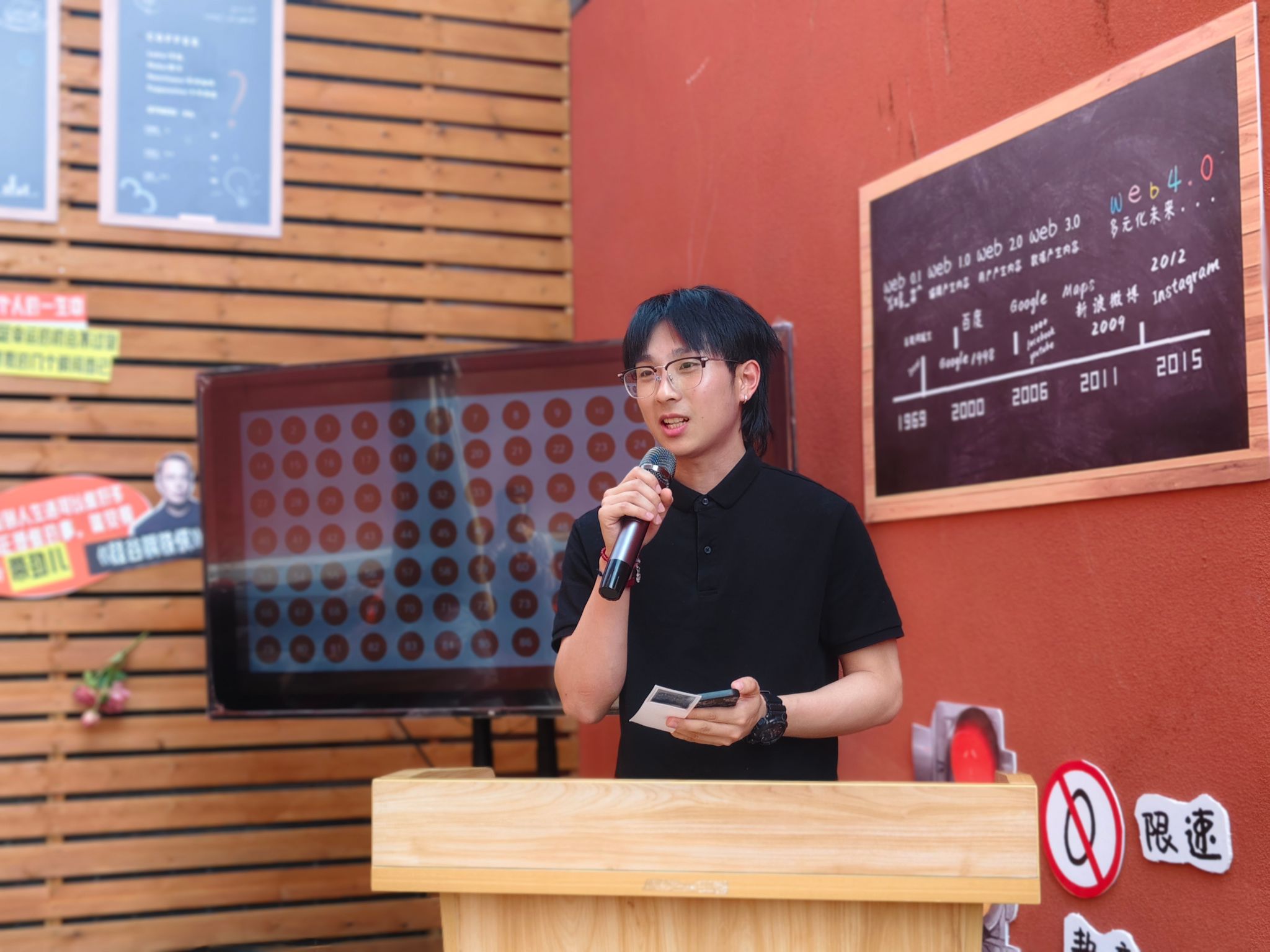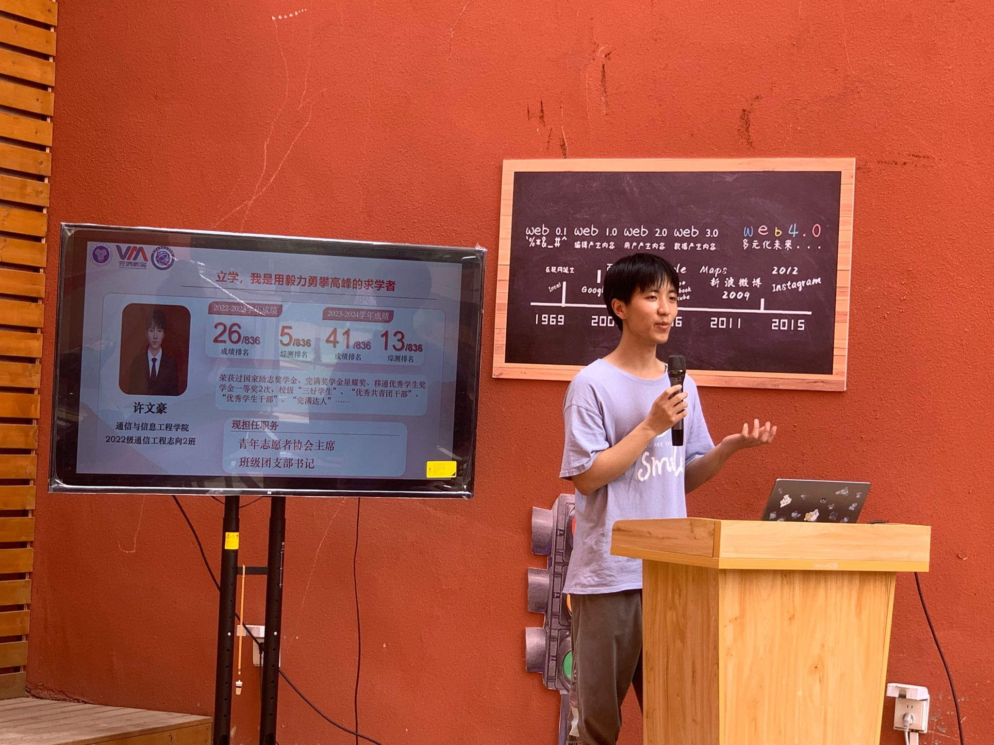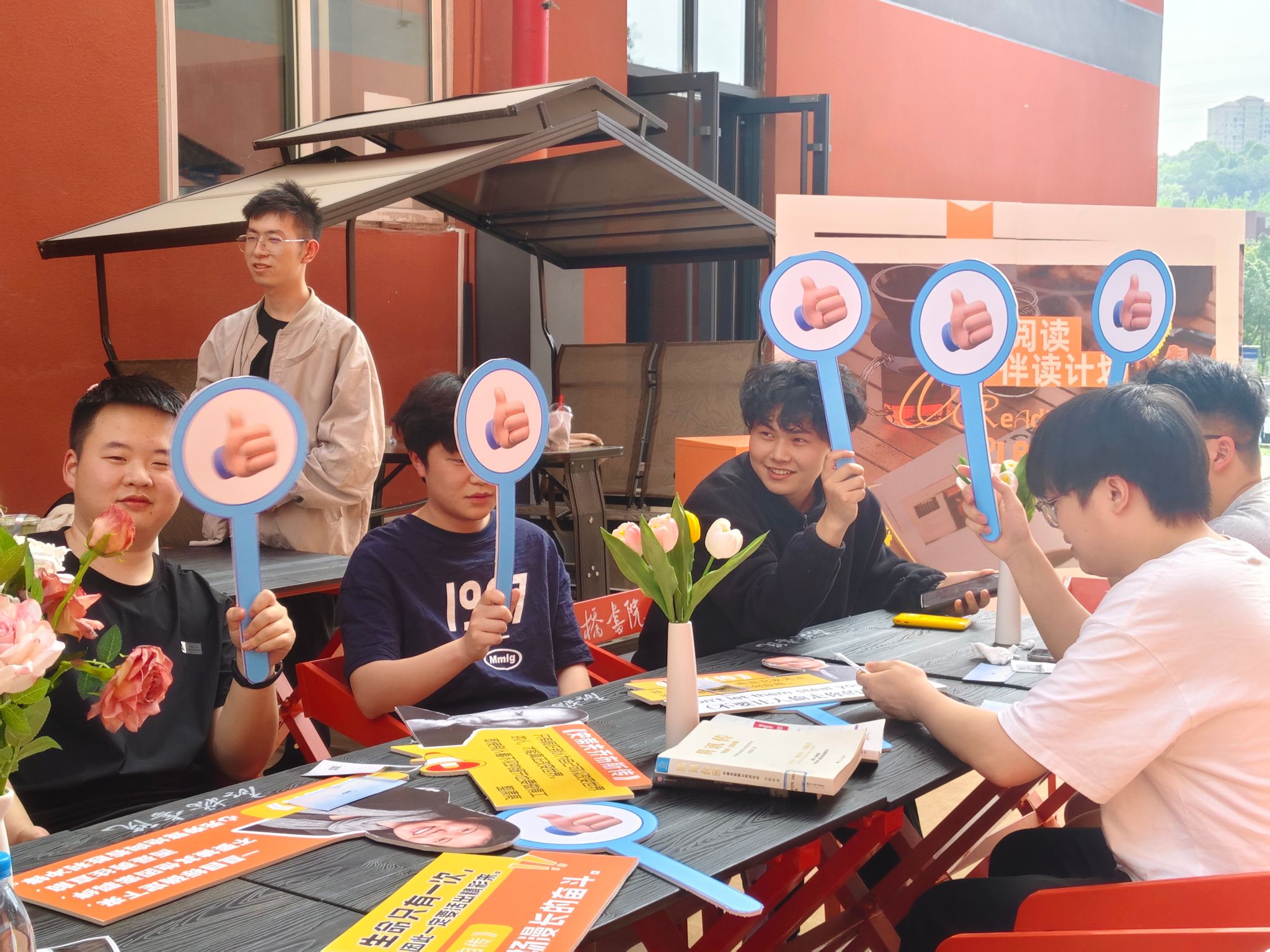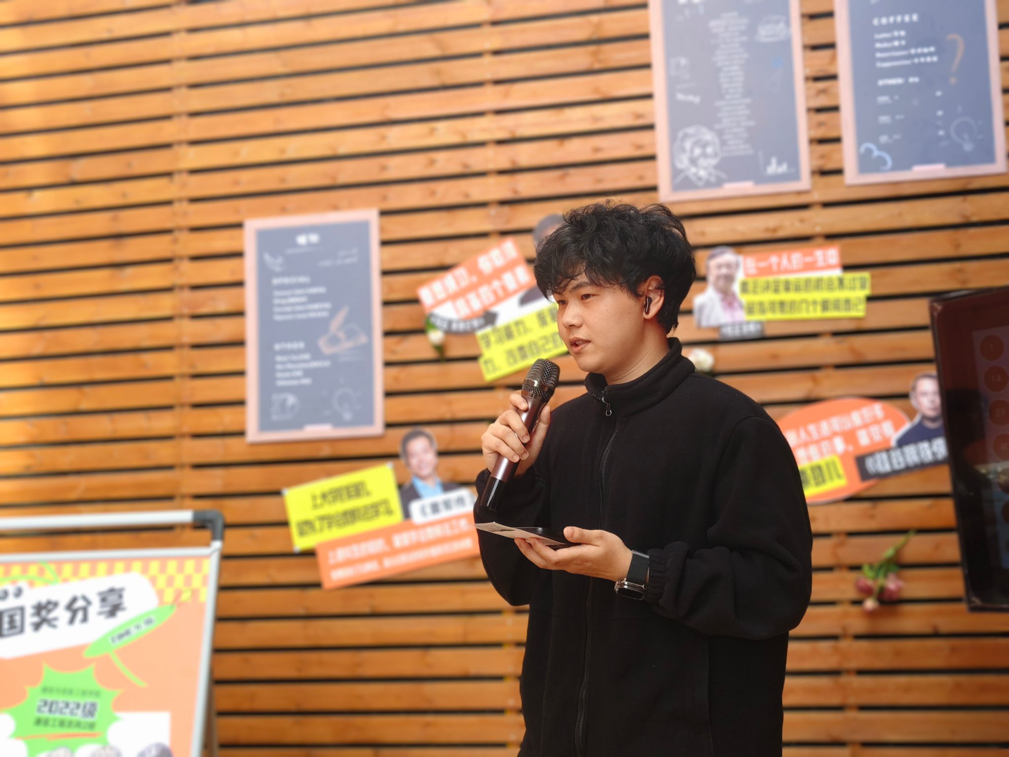 在主持人的热情开场下,现场氛围迅速升温。活动现场布置得别具一格,按照大咖人物马云的咖啡馆进行还原,为参与者营造了一种沉浸式的阅读体验空间。活动中,国奖分享者许文豪同学结合自身经历,以“踔厉奋发,勇毅前行”为主题进行了精彩的大咖阅读分享。他以饱满的热情和真挚的情感,从勤学、思想、实践三个角度分享了自己的成长经历和心得体会。他的演讲内容丰富、条理清晰,既展现了个人在完满教育下的成长与蜕变,也表达了对未来的美好憧憬。
