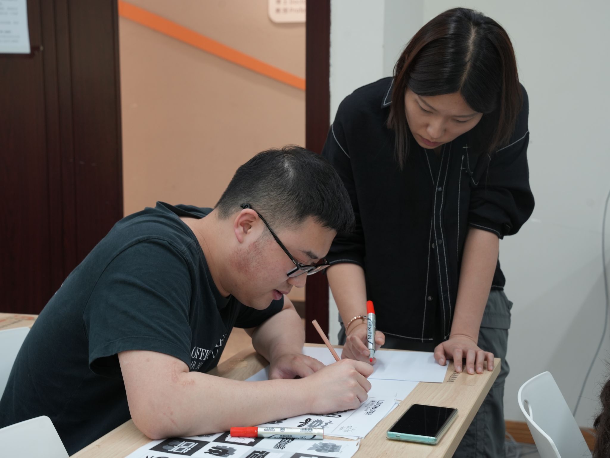 讲完字体设计案例后,张潇丹老师带着大家动手练了起来,张老师挨个进行指导:“笔画别太挤,留些空隙才好看,就像重庆的马路要留出走路的地方。”有同学把弧线画进“中”字,她说:“关键是让形状本身传递信息,比如笔画粗代表厚重,细线条体现灵动感。”