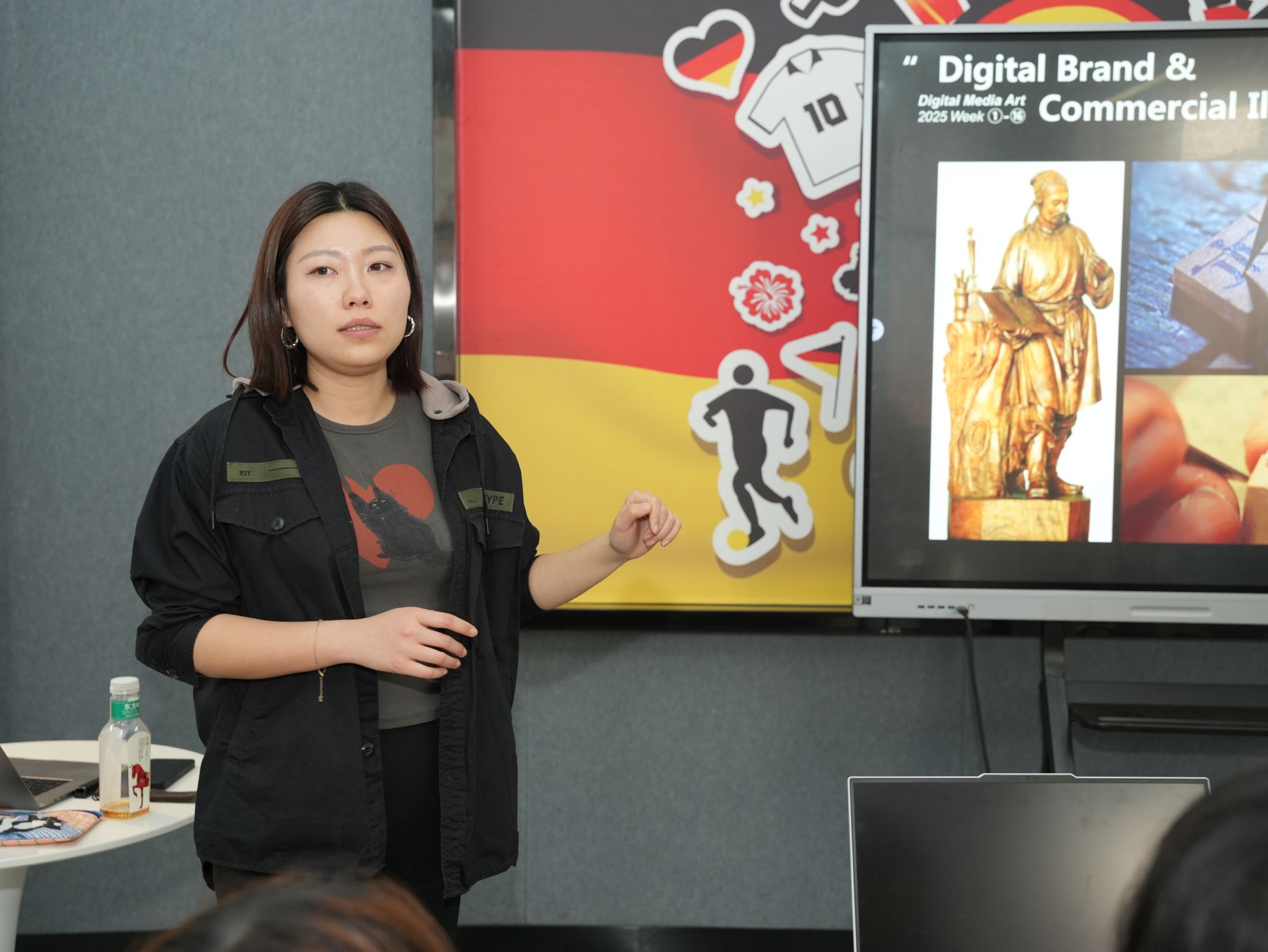 此次课程并非单方面的知识灌输,而是一场热烈的思想碰撞。同学们积极踊跃,纷纷就自己在设计实践中遭遇的与语言相关的难题向张老师请教。有的同学提出在设计排版时的困惑,有的同学则对不同文化背景下设计元素的理解差异表示好奇。2024级数字媒体艺术专业的杨瑞同学举着自己的版式设计稿提问:“在同时使用中英文的海报里,如何让两种文字既保持各自的视觉美感,又不显得割裂?”张老师接过画稿,在黑板上画出网格示意图:“中文标题用粗宋体现庄重感,英文副标题搭配无衬线字体,就像给两种语言各自‘穿上合适的衣服’,再通过色彩明度统一整体调性。”面对同学们的问题,张老师一一耐心解答,给出了实用且具针对性的建议。这种良好的互动氛围,不仅让同学们解决了心中疑惑,更极大地拓宽了他们的设计视野,激发了无限的创新灵感。