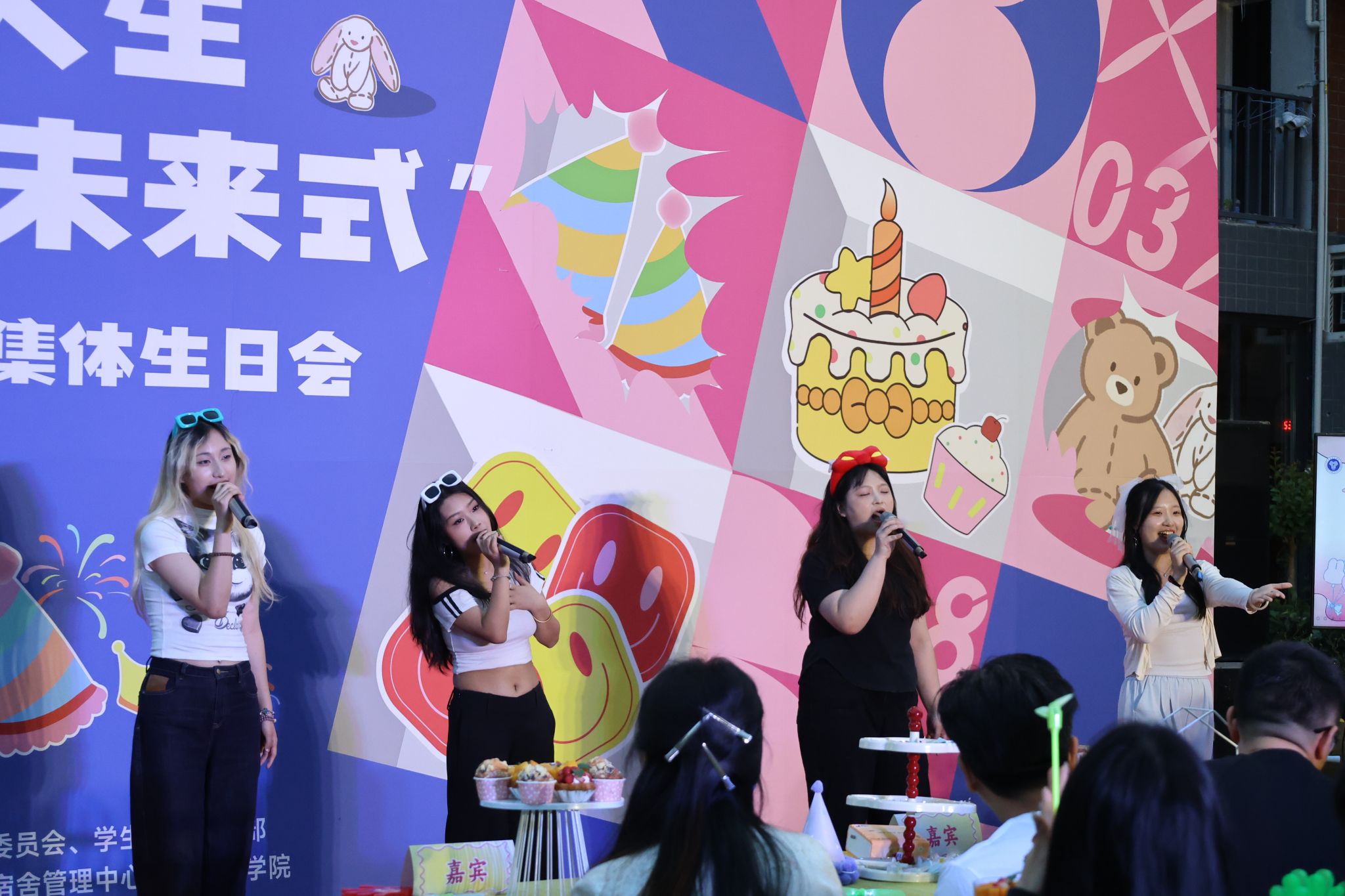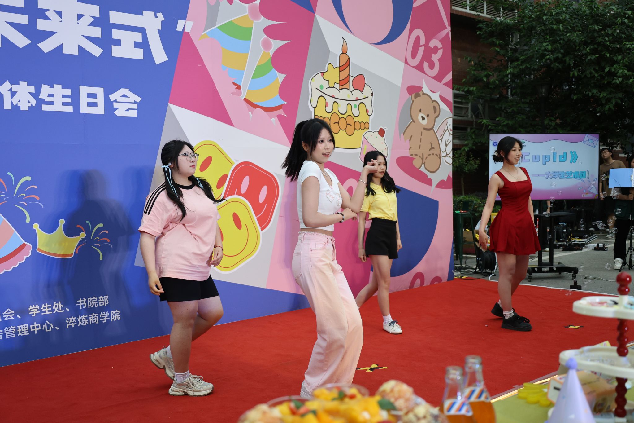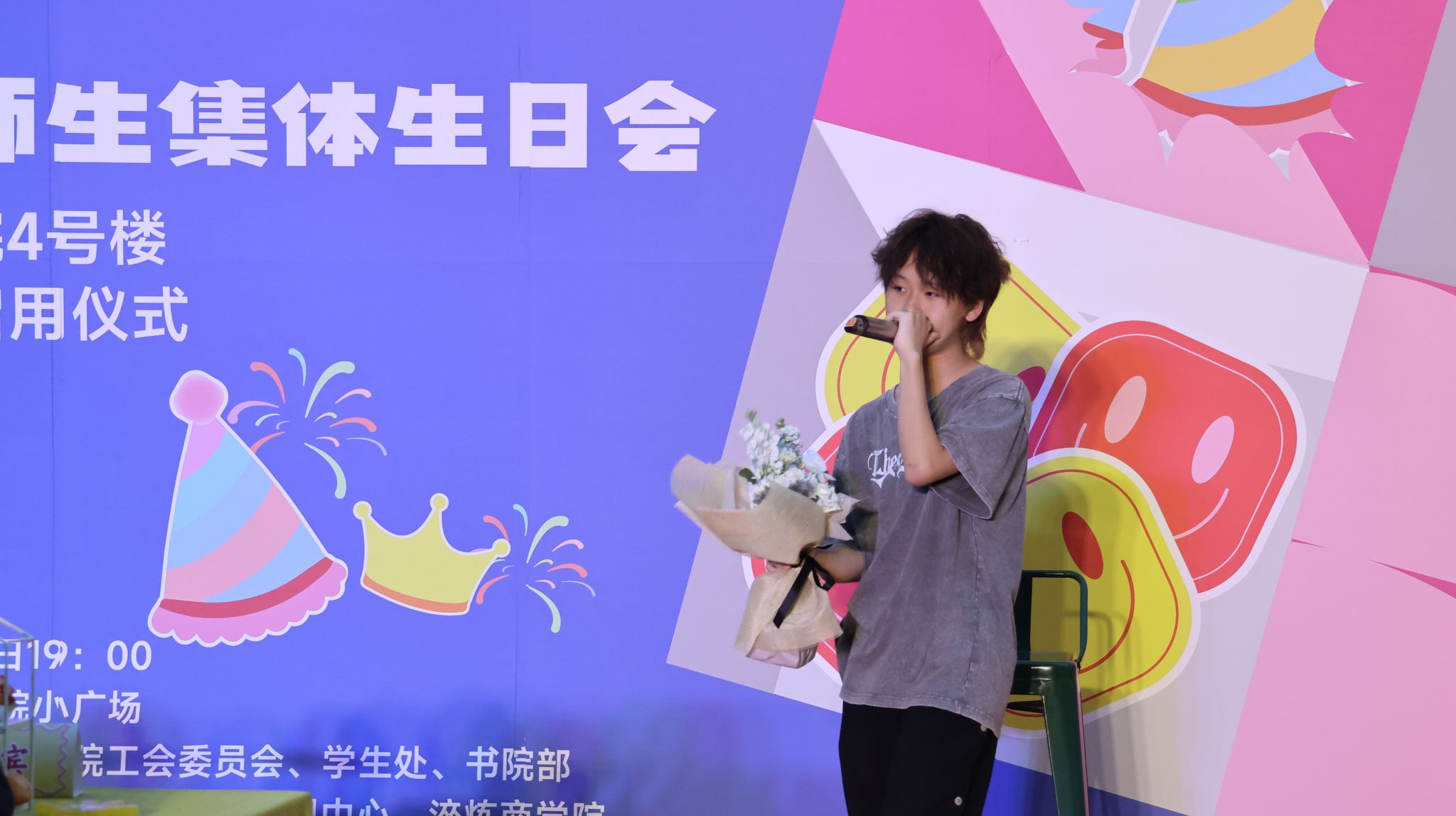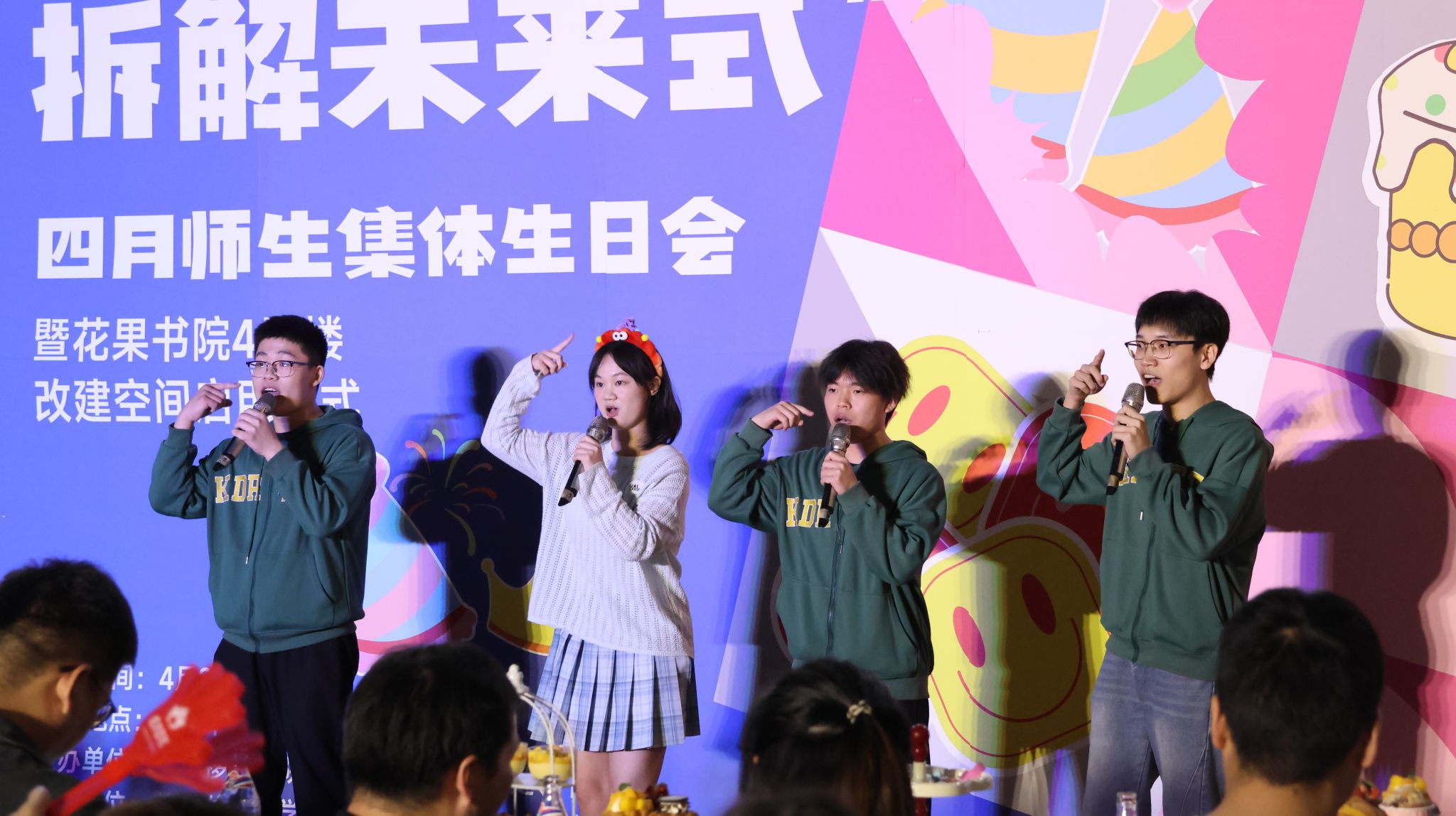 大学生艺术团的同学们以活力满满的《Cupid》舞蹈表演拉开了本次生日会的序幕,让移通师生一键开启快乐模式;师生共乐、邻里互动永远是书院社区的主题词,廊桥书院刘剑雄老师携手书院学生代表毕瑶、吴昊、李佳莲、糟灵月同学串烧演唱《体验派青春》,以此引导同学们勇敢拥抱未知的变化,汲取拾级而上的力量;让嘈杂消音,让快乐高亢。四月寿星代表杨静霄同学以一首《不用去猜》RAP表演,鼓励现场师生们享受当下、重拾快乐;同时活动前期,将四月寿星们的家乡特产制作为盲盒好礼,以互动抽奖的形式延续生日的快乐,在书院社区找回群像的生命力。