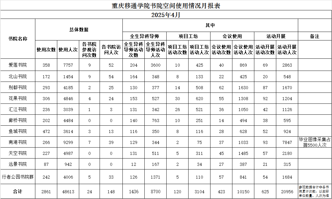 四月,重庆移通学院书院部合川校区组织开展不同规模学生活动173次,13136人次参与。开展信息产业大咖传记阅读活动334场次,辐射师生11851人次。全生异科导师开展活动2689次,覆盖学生达20805余人次;6次名誉院长精品课;132场项目工坊讲座及活动,参与人数达4800余人次。