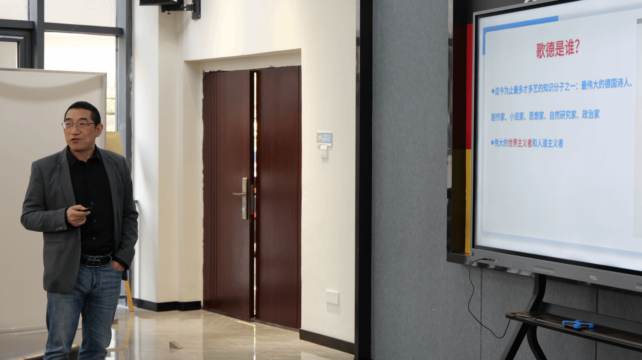 南湖书院于4月7日在中德创意工坊举办名誉院长精品课第35期系列活动。本次活动以“搭建兴趣文化交流圈层,促进师生对话交流”为核心目标,邀请书院名誉院长、德语文化研究专家莫光华教授担任主讲,通过“德语文化史中的经典人物与影响之歌德,生动诠释了书院名誉院长与全生异科导师协同育人的创新路径,为师生搭建了跨学科对话的实践平台。活动中,莫光华教授充分发挥名誉院长“文化引领者”与“学术纽带”的双重角色,提出的“理念传递”与“项目建设”职责,以生动案例与学术脉络为主线,系统梳理了歌德对德语文化发展进程的意义及其思想影响。