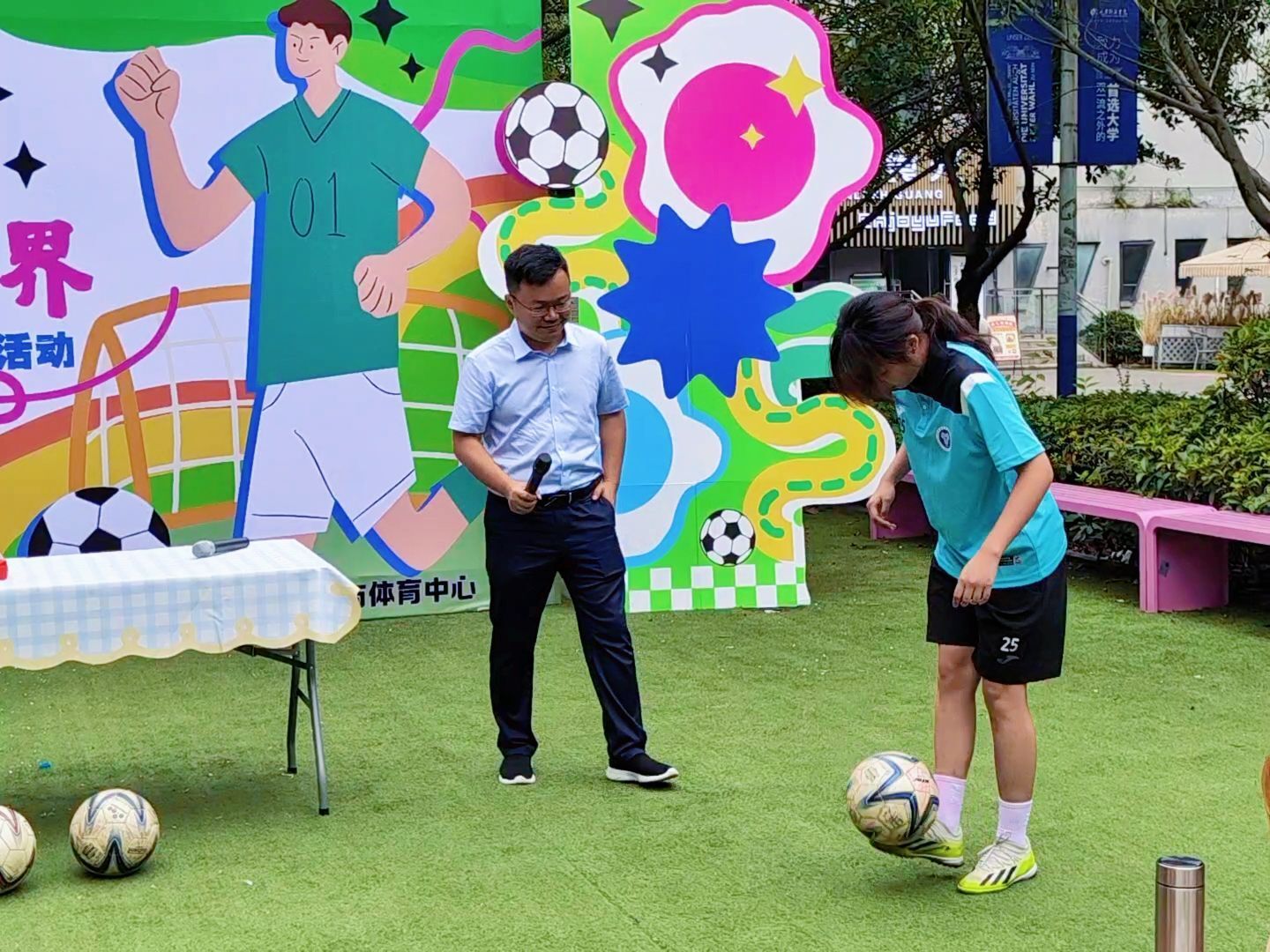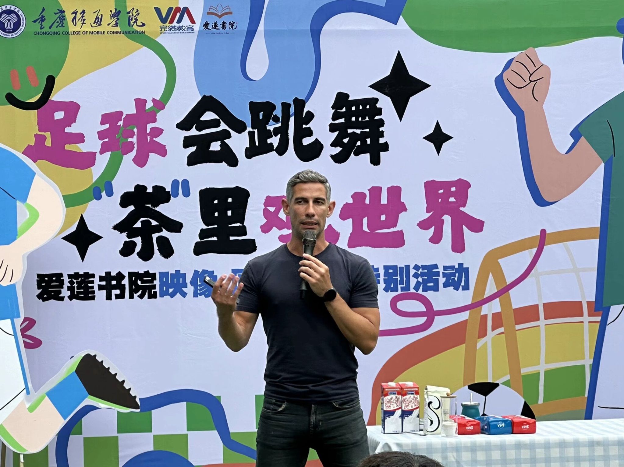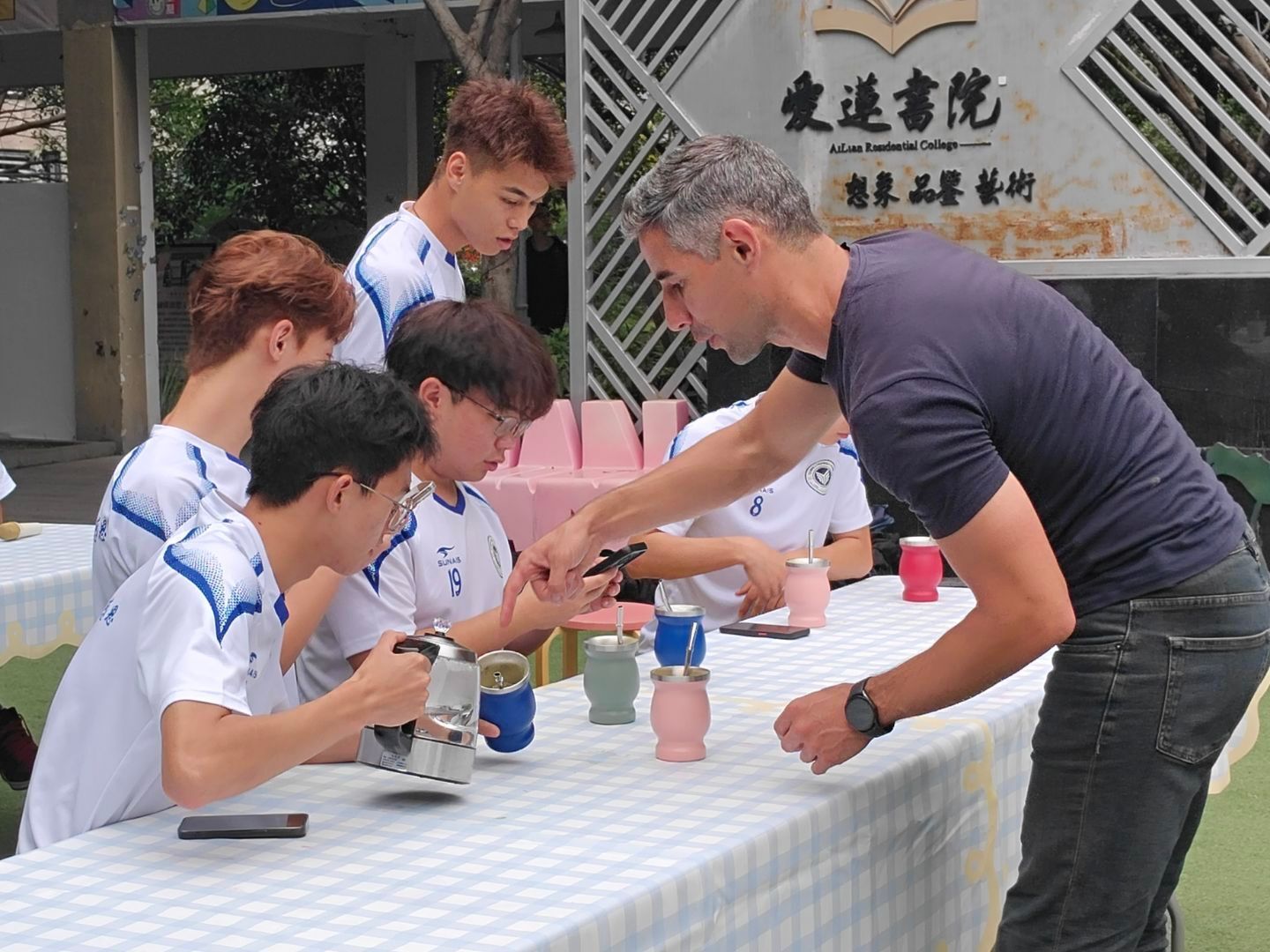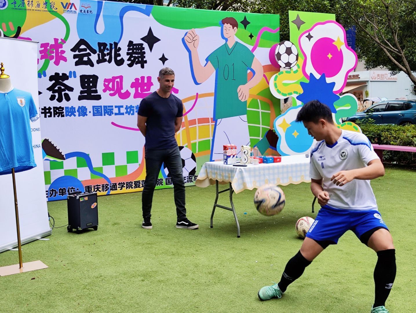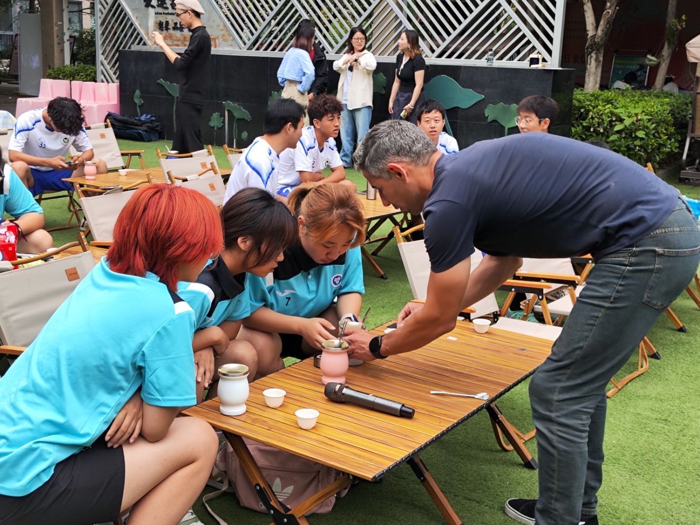 五月,夏风微醺,运动的活力与文化的韵味在此刻交织。5月16日下午15:00,爱莲书院联动国际交流与合作处、竞技体育中心,在爱莲书院小广场举办了一场别开生面的“足球会跳舞,茶里观世界”特别活动。活动特邀乌拉圭足球教练Hernan现场教学,以足球为纽带,以茶文化为媒介,带领师生沉浸式体验南美体育激情与人文风情,在绿茵奔跑与茶香氤氲中,探寻体育之美,感受文化之韵,开启一场跨越国界的“足尖与舌尖”的对话。 (图2)