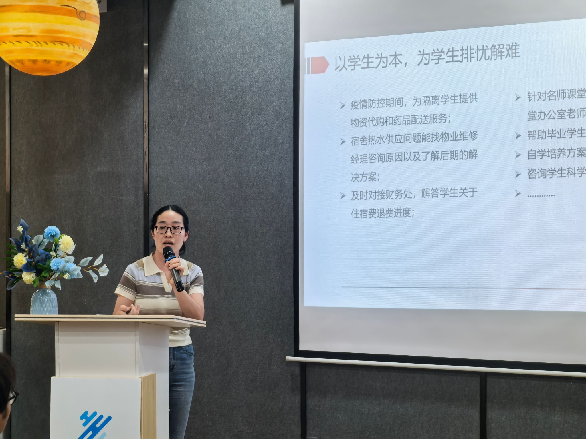 外国语学院、北山书院异科导师代表潘颖老师以《多元借力,充分融合》为主题,提出异科导师可以充分联动辅导员借力,建立常态化沟通机制来协同开展学生管理工作;二是了解学生需求,真正喜欢与认同学生,把日常学生工作转化为轻松的师生互动;三是通过有效推送信息让异科导师工作更有效率。潘老师强调教育是师生相互促进、共同成长,共同营造轻松愉快的完满过程。