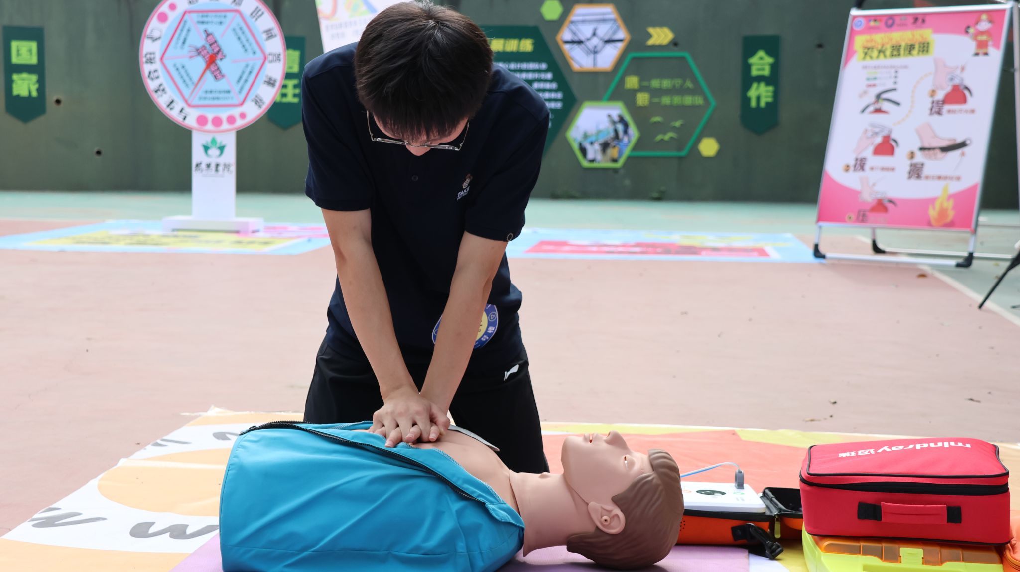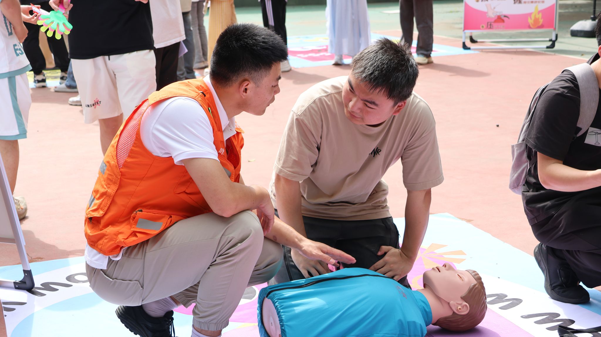 我校作为第三批全国学校急救教育试点学校,为进一步强化生命教育,充分发挥试点学校作用,本次活动邀请同学们在沉浸式应急技能体验中感受安全、美好的校园生活。急救知识进书院,守护生命“救”在身边,现场以趣味知识竞答的形式帮助同学们增强急救知识储备、提高安全防范意识;活动聚焦校园消防安全,邀请保卫科科长郑好老师为现场同学讲解灭火器的使用步骤,并指导同学们进行实操体验,进而筑牢校园安全防线;同时营地教育中心叶厚老师、李青青老师针对CPR心肺复苏以及AED自动体外除颤器进行演练示范与细致讲解,助力同学们全面提升自救互救技能与应急应变素养。