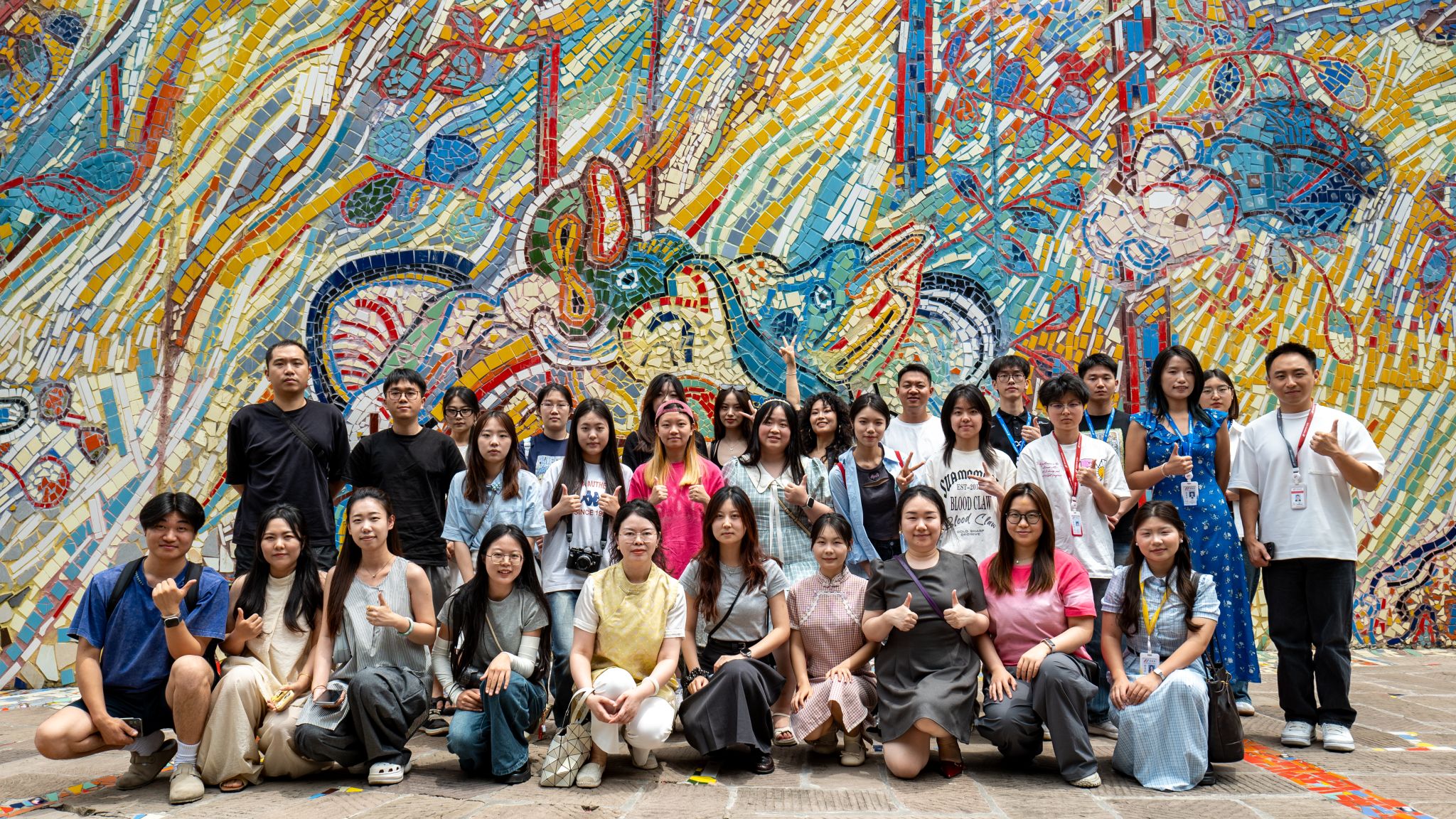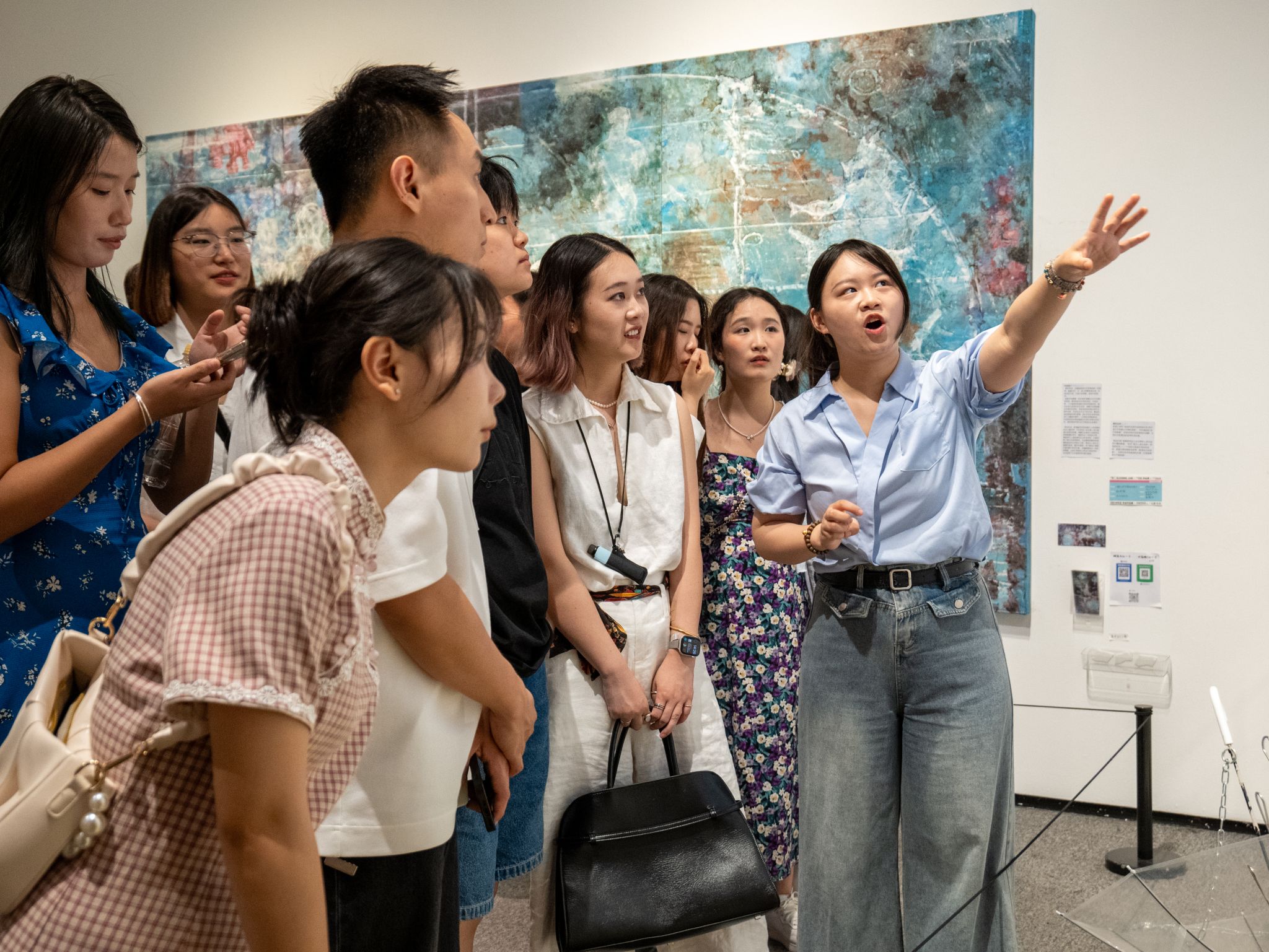 6月10日,爱莲书院以6月名誉院长精品课为契机,突破传统课堂界限,将教学现场延伸至四川美术学院罗中立美术馆。书院特聘教授郭昕教授亲自带队,学校艺术教育中心教师、剧团学生、各书院学生发展导师、书院学子及双体融媒创想工坊成员等30余人,沉浸于《开放的六月》2025年川美毕业展的艺术激流之中,开启了一场主题为“艺路同行·开放共生”的移通-川美跨校艺术对话之旅。
