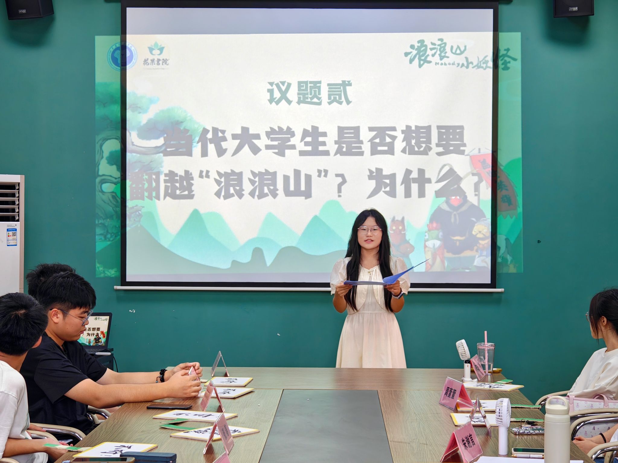 对于当代大学生而言,“浪浪山”或许是固化的成长路径,亦或是自我认知的局限以及现实压力的束缚,对此话题同学们各抒己见。郭进同学认为“浪浪山”代表每个人心中想要跨越却又难以跨越的“门槛”,但只有勇敢翻过心中“浪浪山”才会不断积蓄重新出发、勇往直前的底气与勇气。史禄齐同学以个人的成长经历为例,与同学们分享他成长过程中的“浪浪山”,并以“千里之行,始于足下”这句谚语,激励现场同学们用实际行动来丈量走过的每一步。